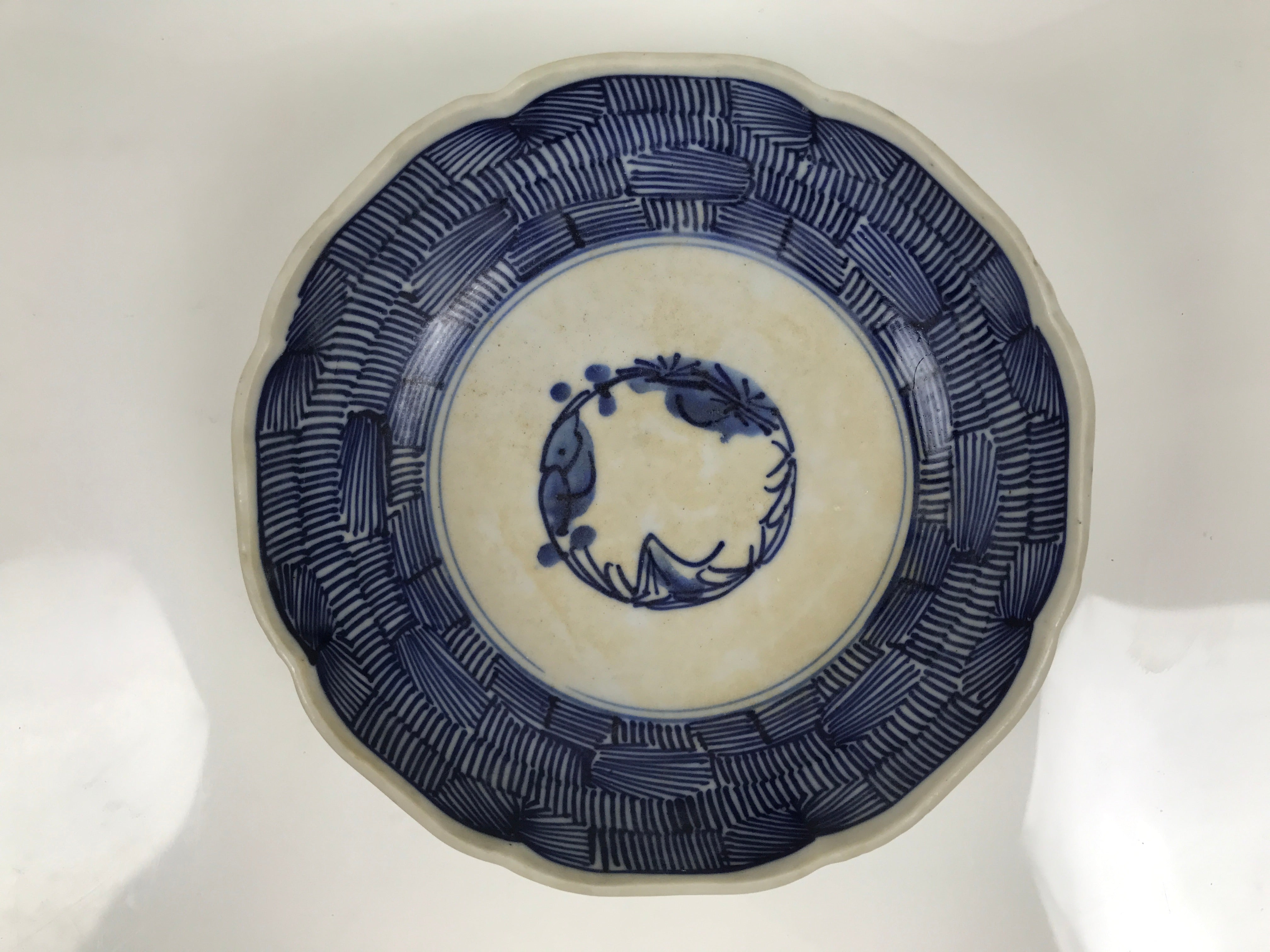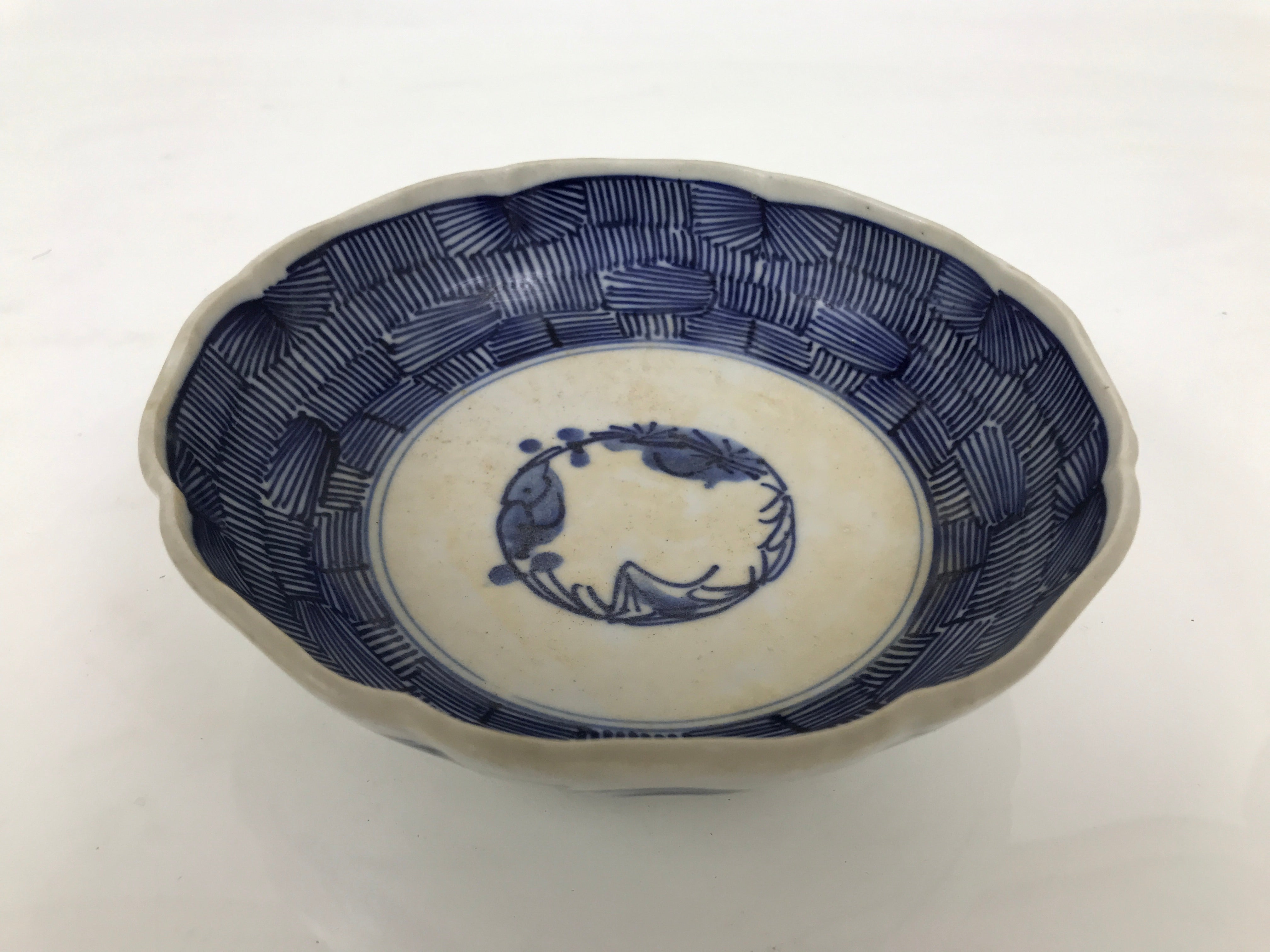 This item is an antique Japanese ceramic bowl. Handcrafted, this bowl, also called namasu, is used mainly for salads and other types of dressed chopped vegetables. It is white and blue sometsuke that features a hatched line inner border design as well as some floral and other nature motifs at the center. The outside edge has swirling line designs. It has a petaled edge for extra decoration.