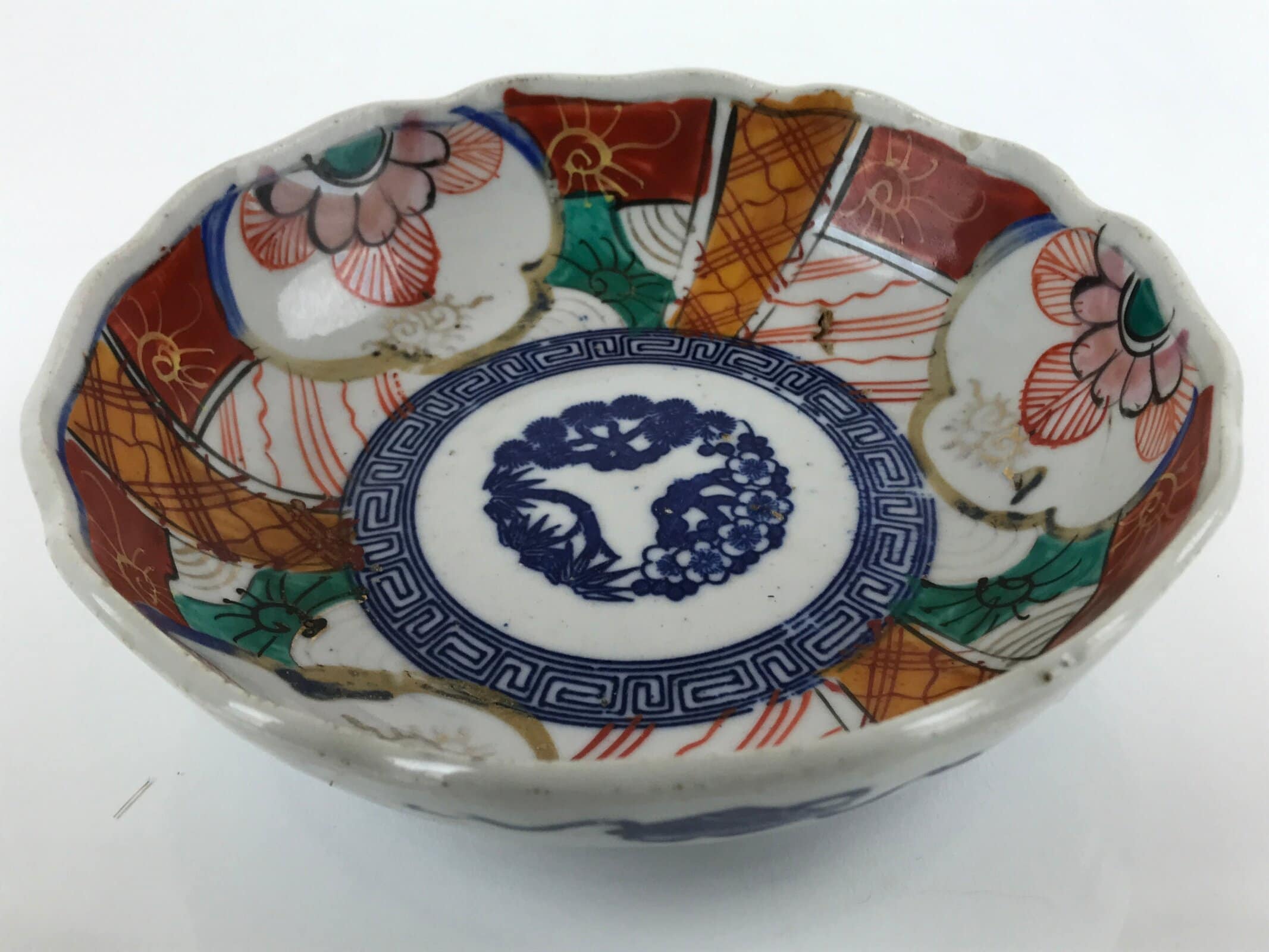 This item is an antique Japanese ceramic bowl made for salads. It is a beautiful example of the kutani imari style of pottery which uses bright, vivid colors often with gold accents and elaborate images of scenery, animals, flowers, etc. This particular bowl features large floral and patterned designs in red, orange, light gold, and green, as well as a sometsuke blue center with a shouchikubai (pine, bamboo, plum) wreath and patterned border.