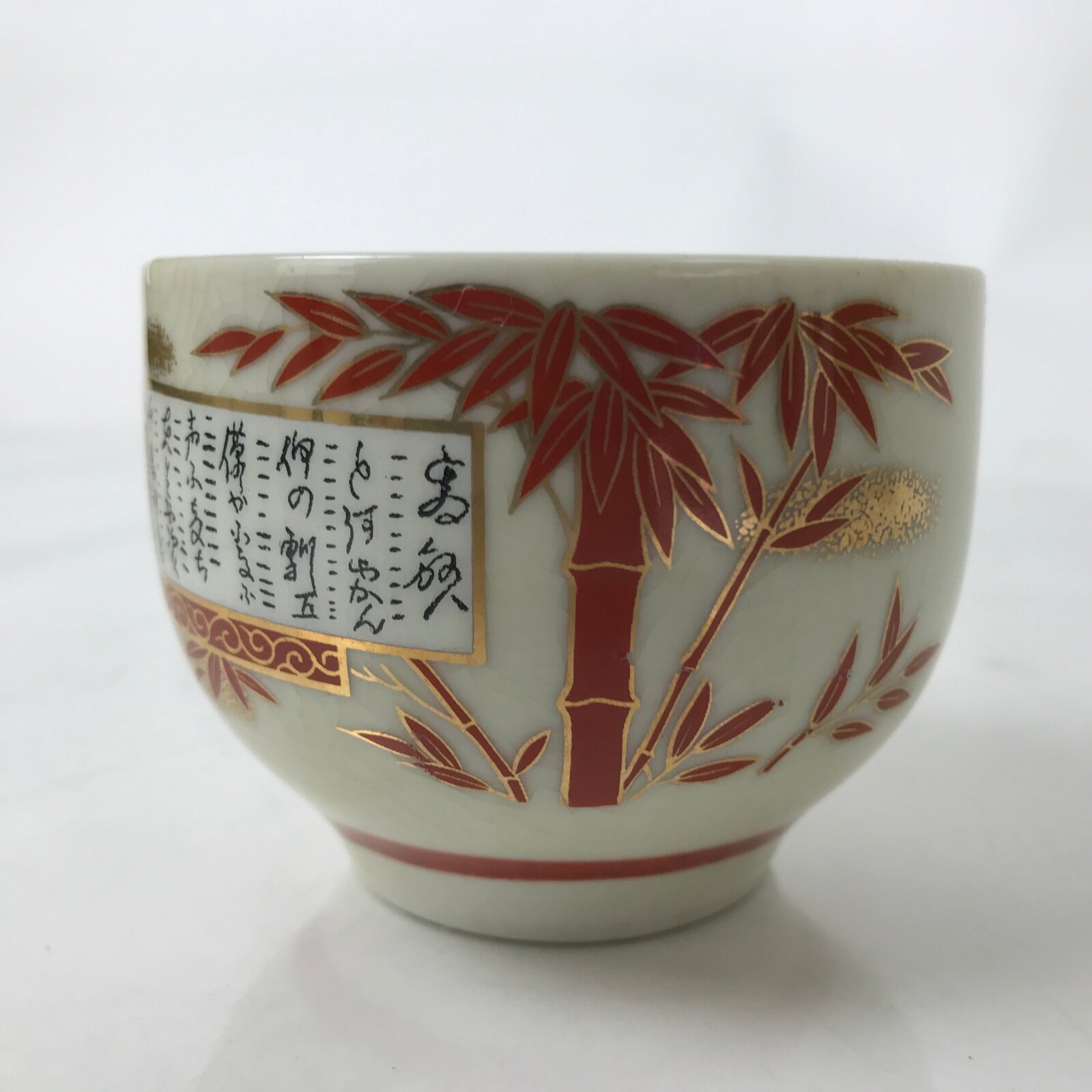 This is a vintage Japanese Kutani ware ceramic teacup with a crackle glaze. It is beige and features a design of red bamboo rimmed gold and a Tanka or Japanese poem-like characters. A signature read Kutani is on the bottom. It is used for drinking sencha loose-leaf tea.