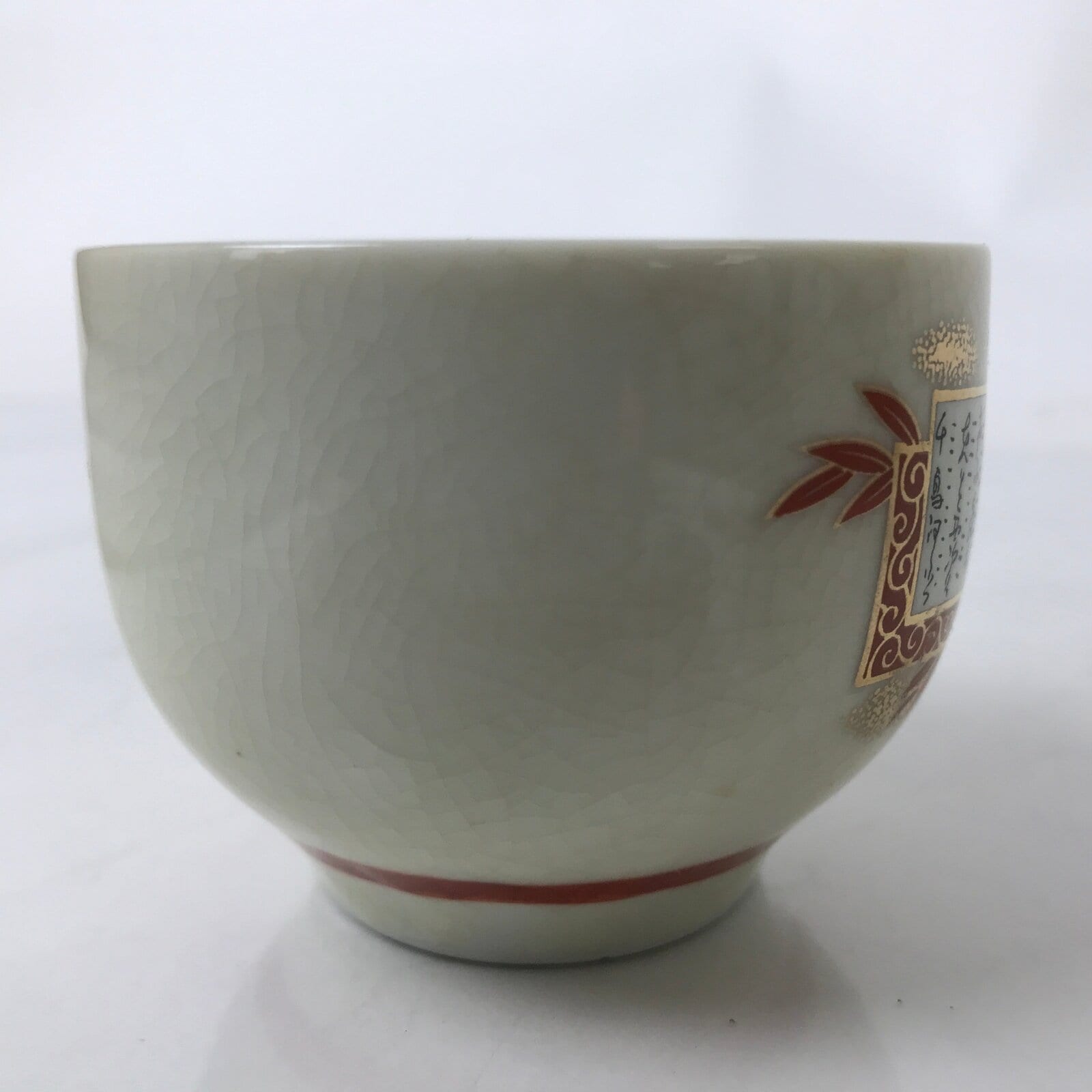 This is a vintage Japanese Kutani ware ceramic teacup with a crackle glaze. It is beige and features a design of red bamboo rimmed gold and a Tanka or Japanese poem-like characters. A signature read Kutani is on the bottom. It is used for drinking sencha loose-leaf tea.