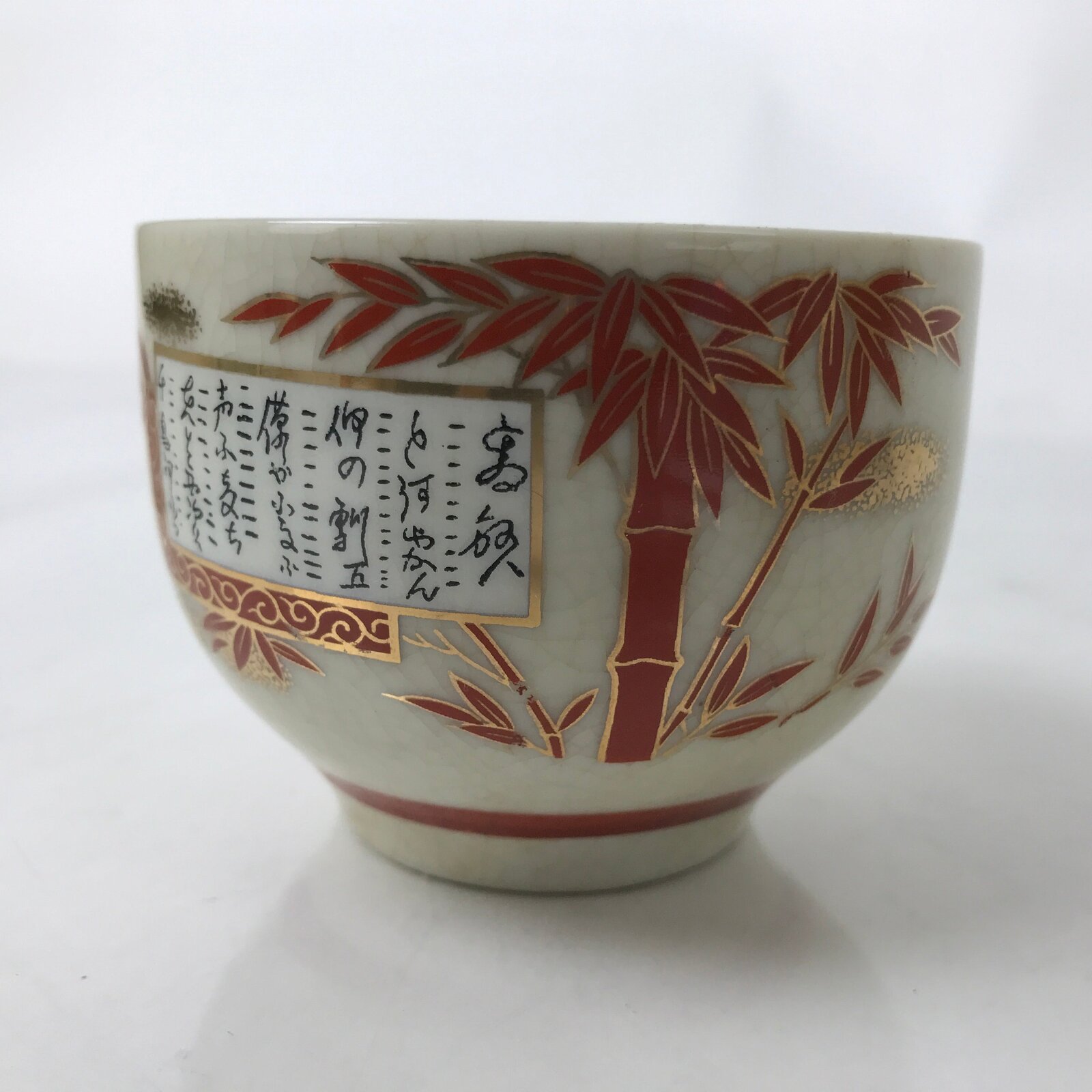 This is a vintage Japanese Kutani ware ceramic teacup with a crackle glaze. It is beige and features a design of red bamboo rimmed gold and a Tanka or Japanese poem-like characters. A signature read Kutani is on the bottom. It is used for drinking sencha loose-leaf tea.