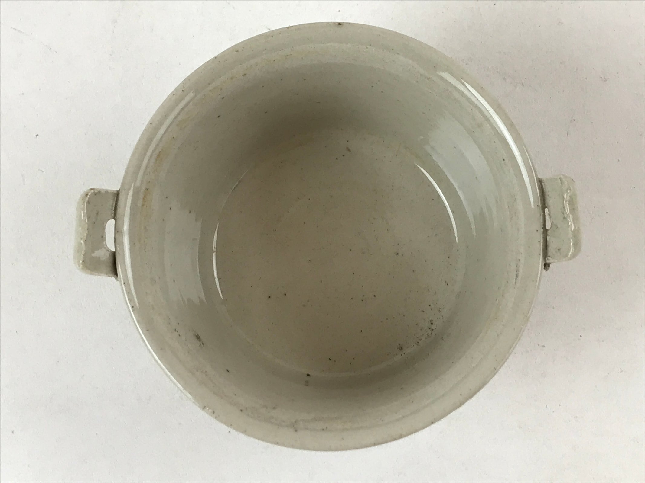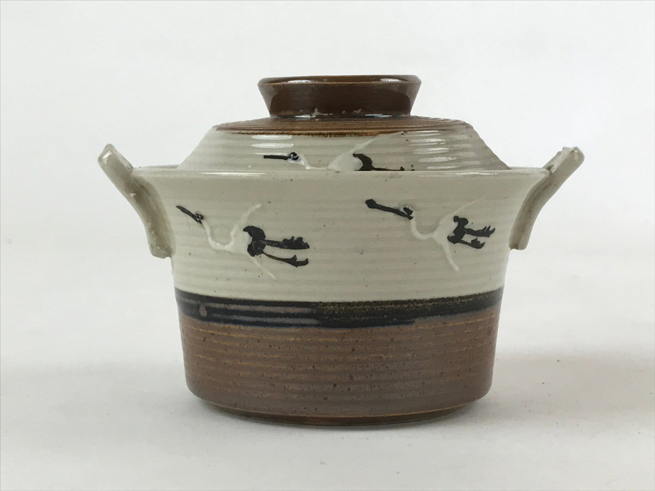 This is a vintage Japanese ceramic bowl with a lid. Its small size is excellent for steaming, making and serving chawanmushi (a Japanese egg custard dish), and smaller soups or side dishes. It is a light beige with brown and contains painted images of six flying cranes (tsuru). It also features tiny decorative handles on the sides.