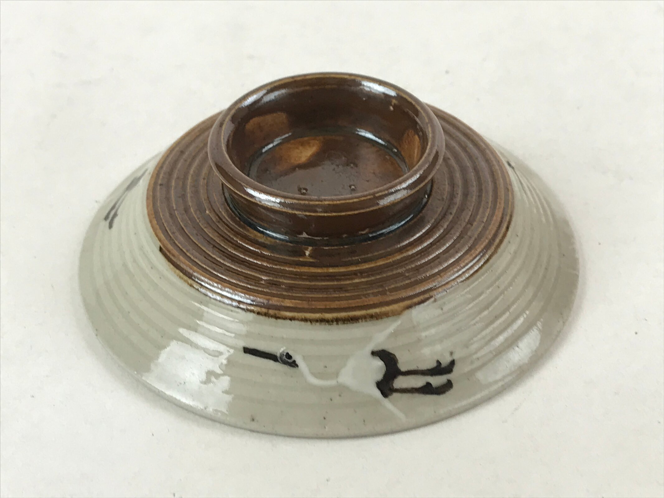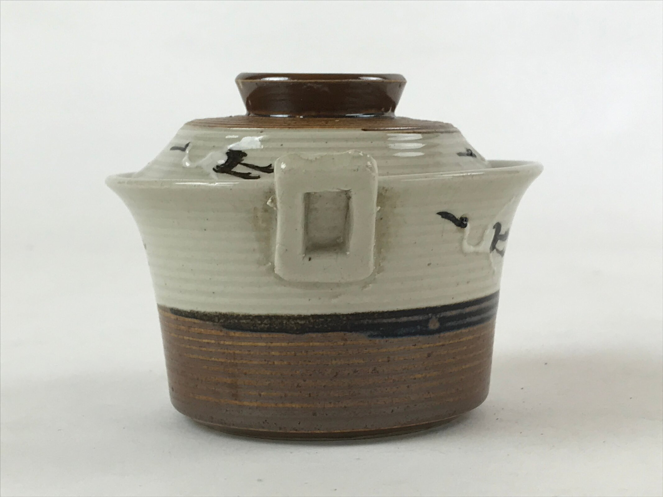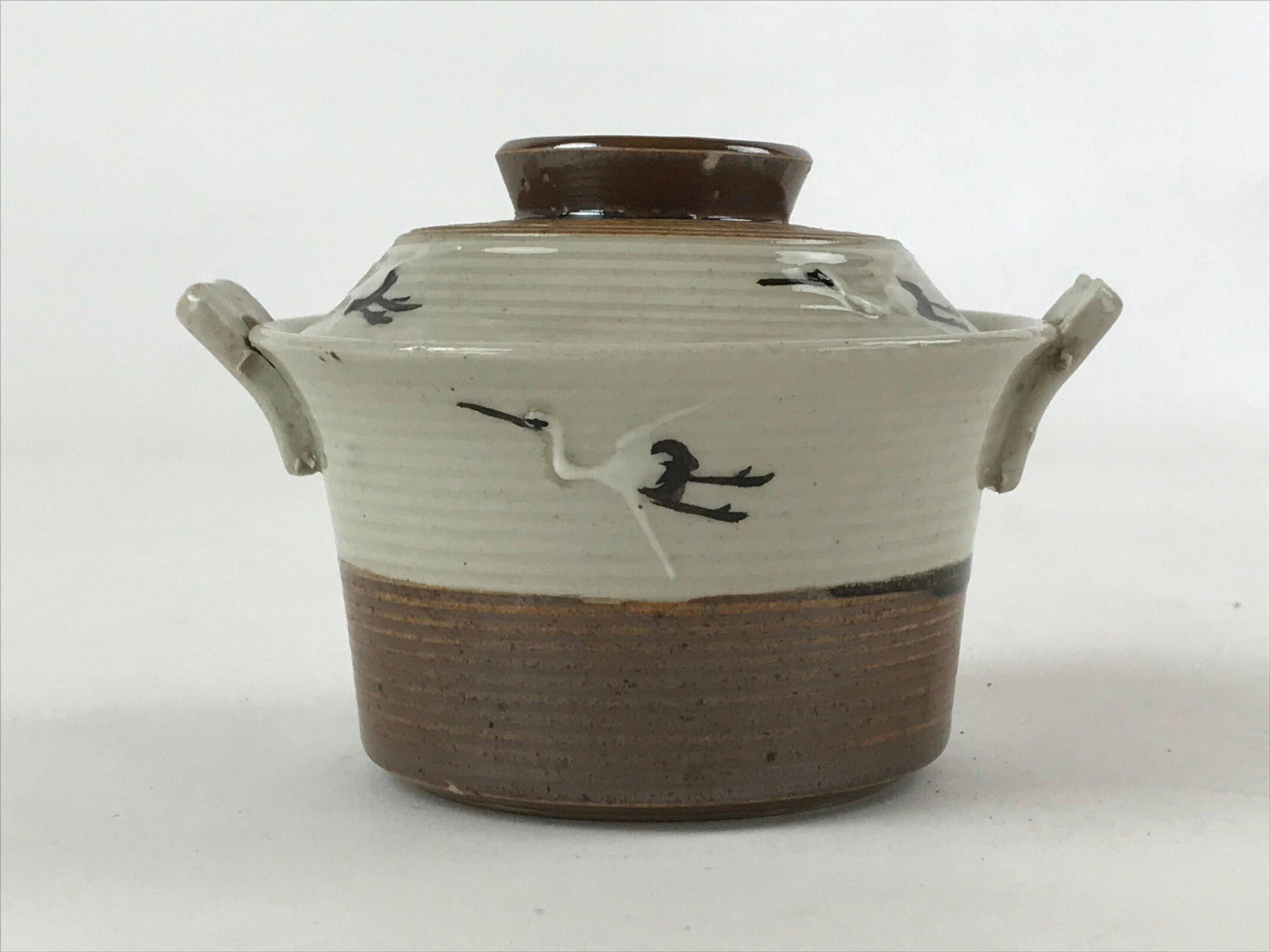 Japanese Ceramic Lidded Bowl Vtg Small Chawanmushi Cup Tsuru Crane Brown PY503