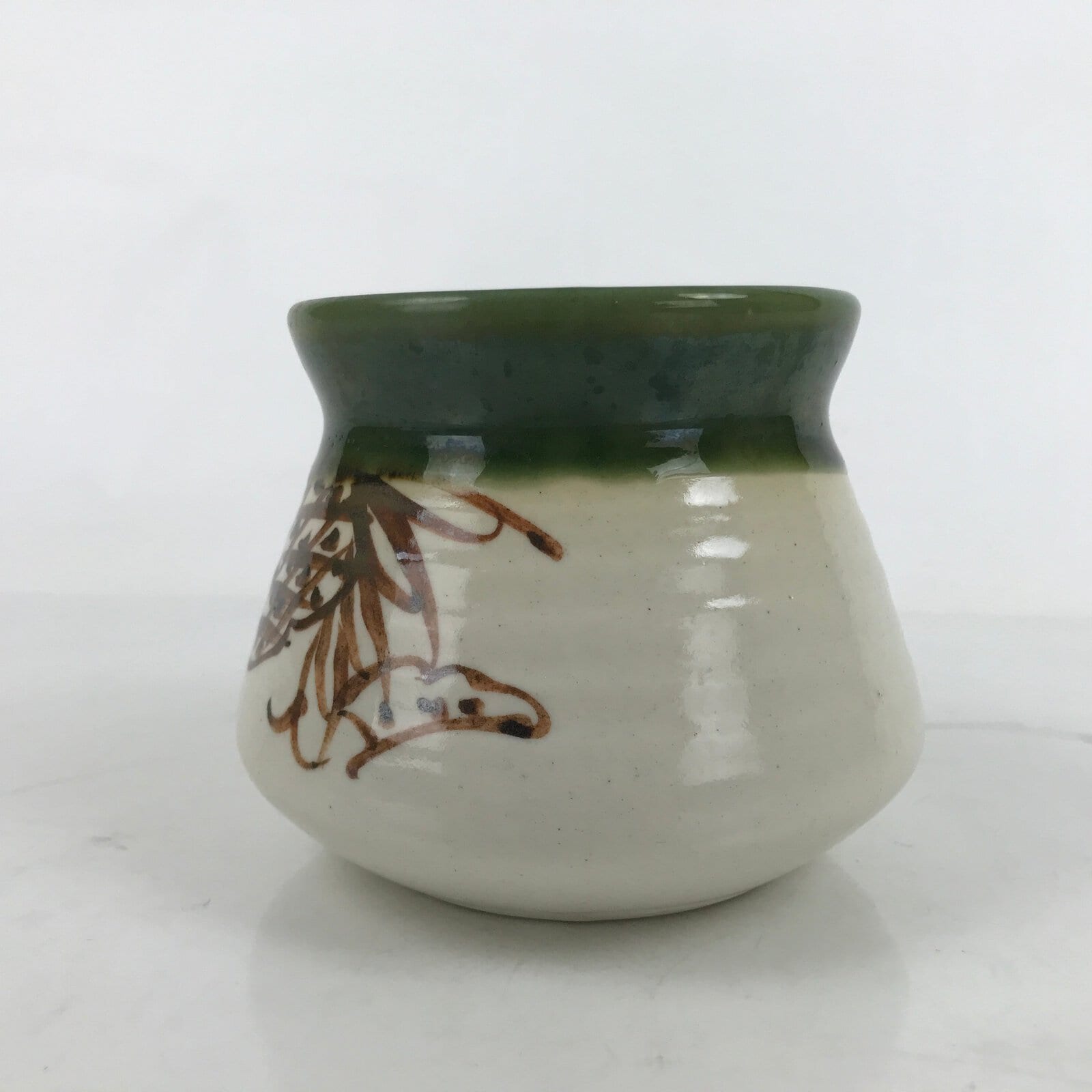 This particular pot is oribe ware defined by the beige base glaze and mossy green accent with brown designs. The designs featured are a ginkgo leaf and pinecone.