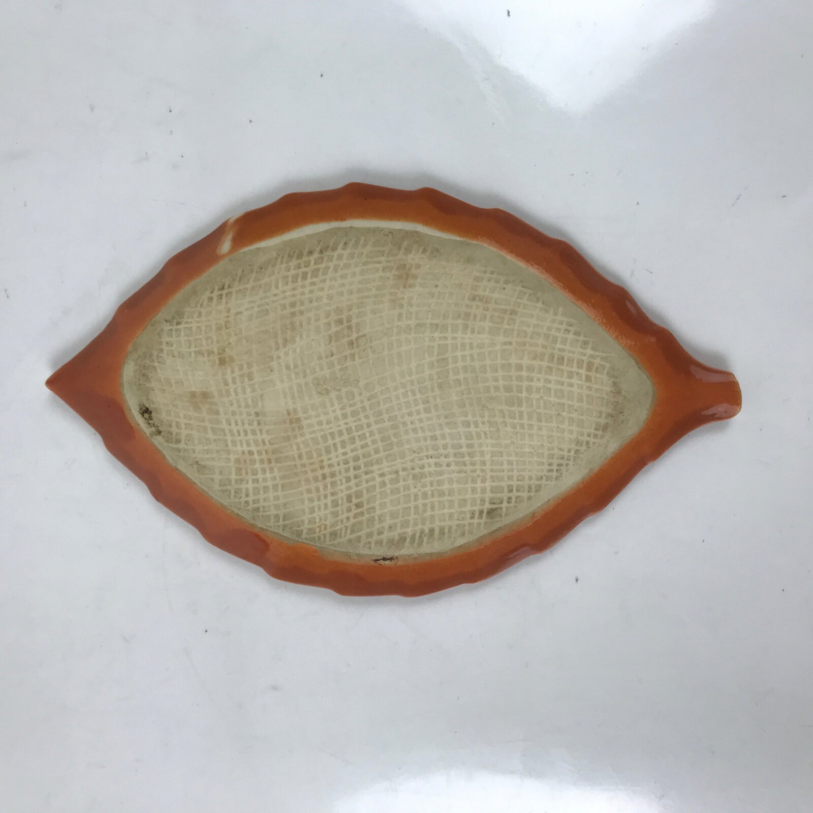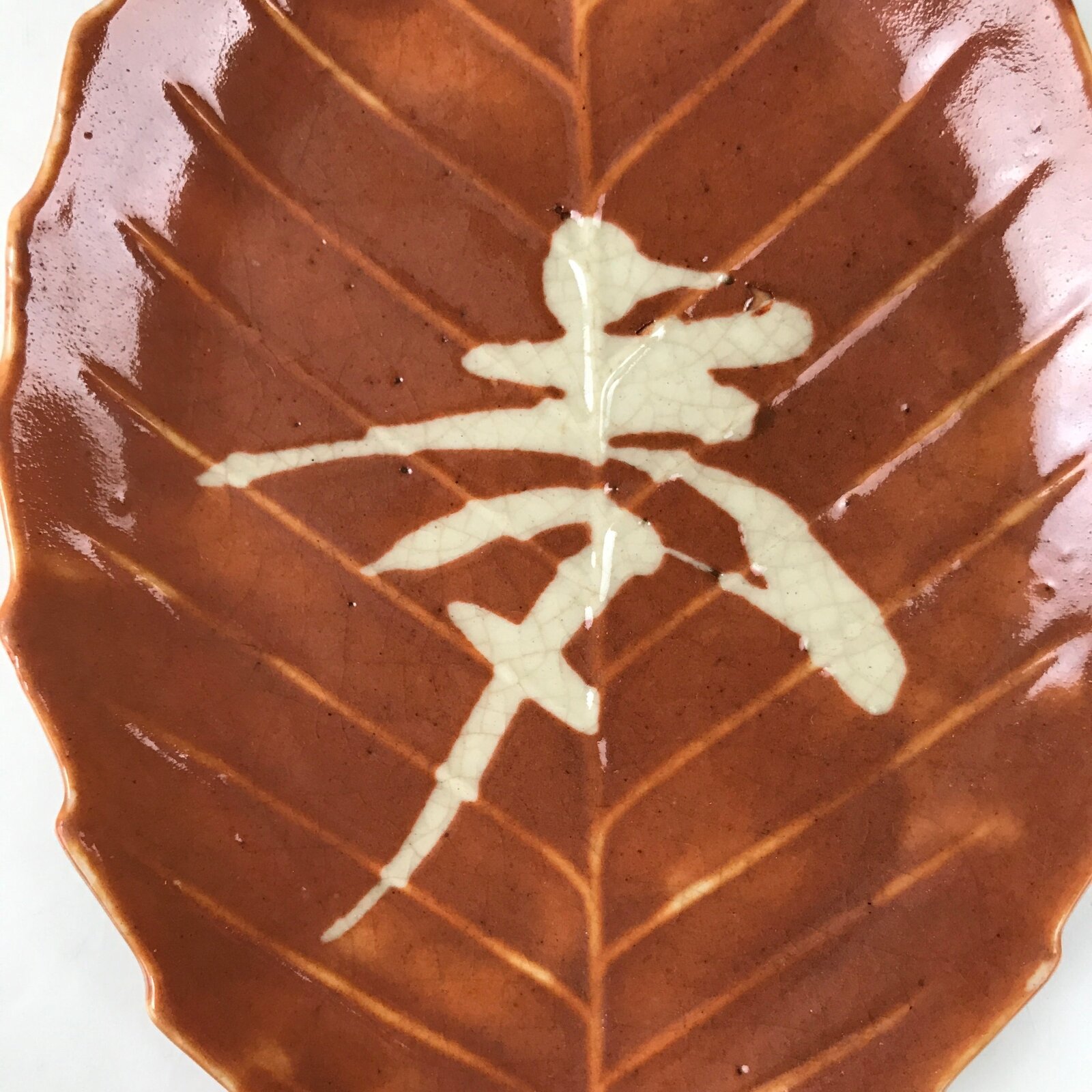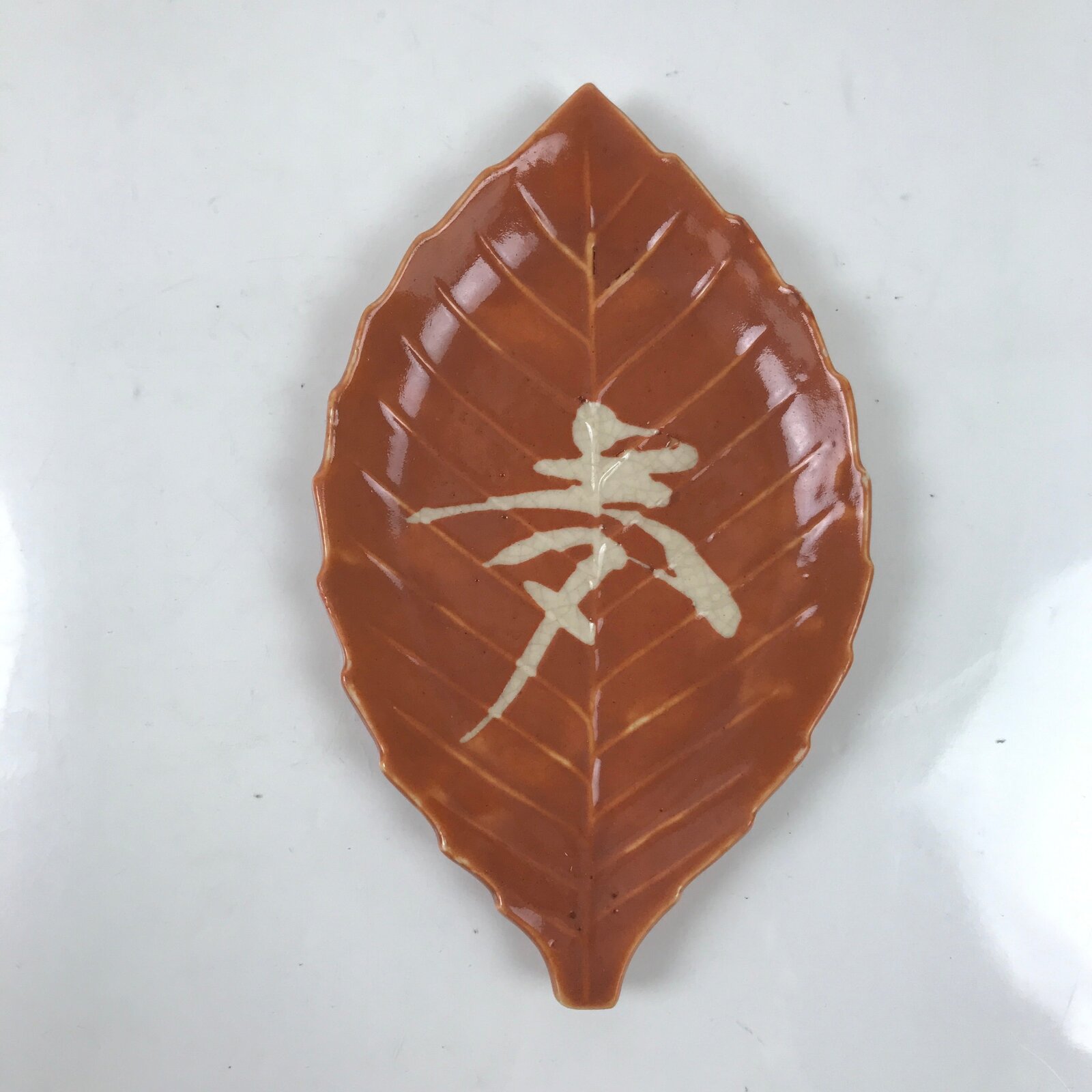 This vintage Japanese small leaf-shaped plate is made of ceramic pottery and has a smooth orange glaze with raised bumps around the veins of the leaf, and a white kanji character at the center. The calligraphy kanji displayed means “dream”. This type of plate is called meimeizara and is the perfect size to serve wagashi, traditional Japanese sweets. It also serves as a plate for side dishes in a Japanese meal set.