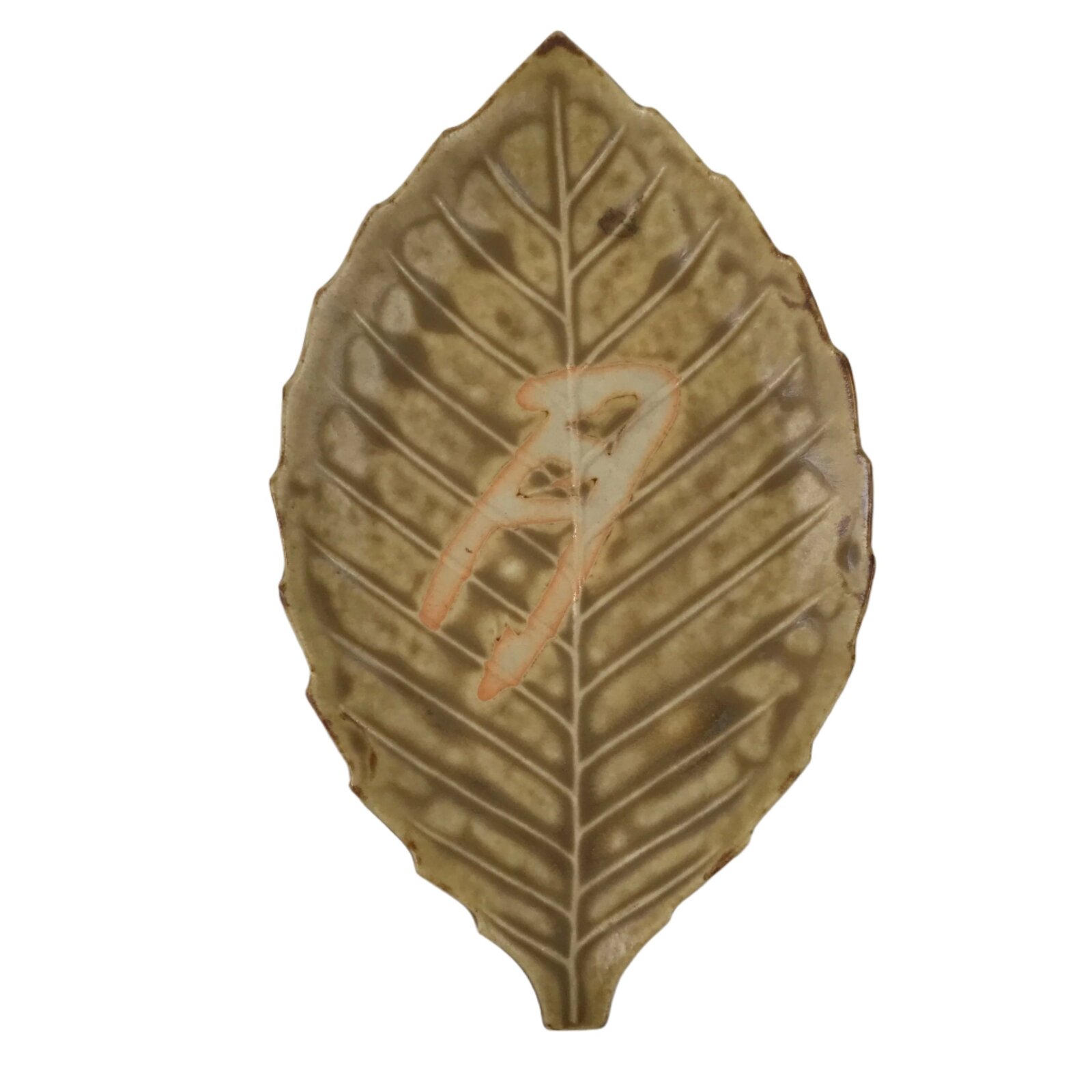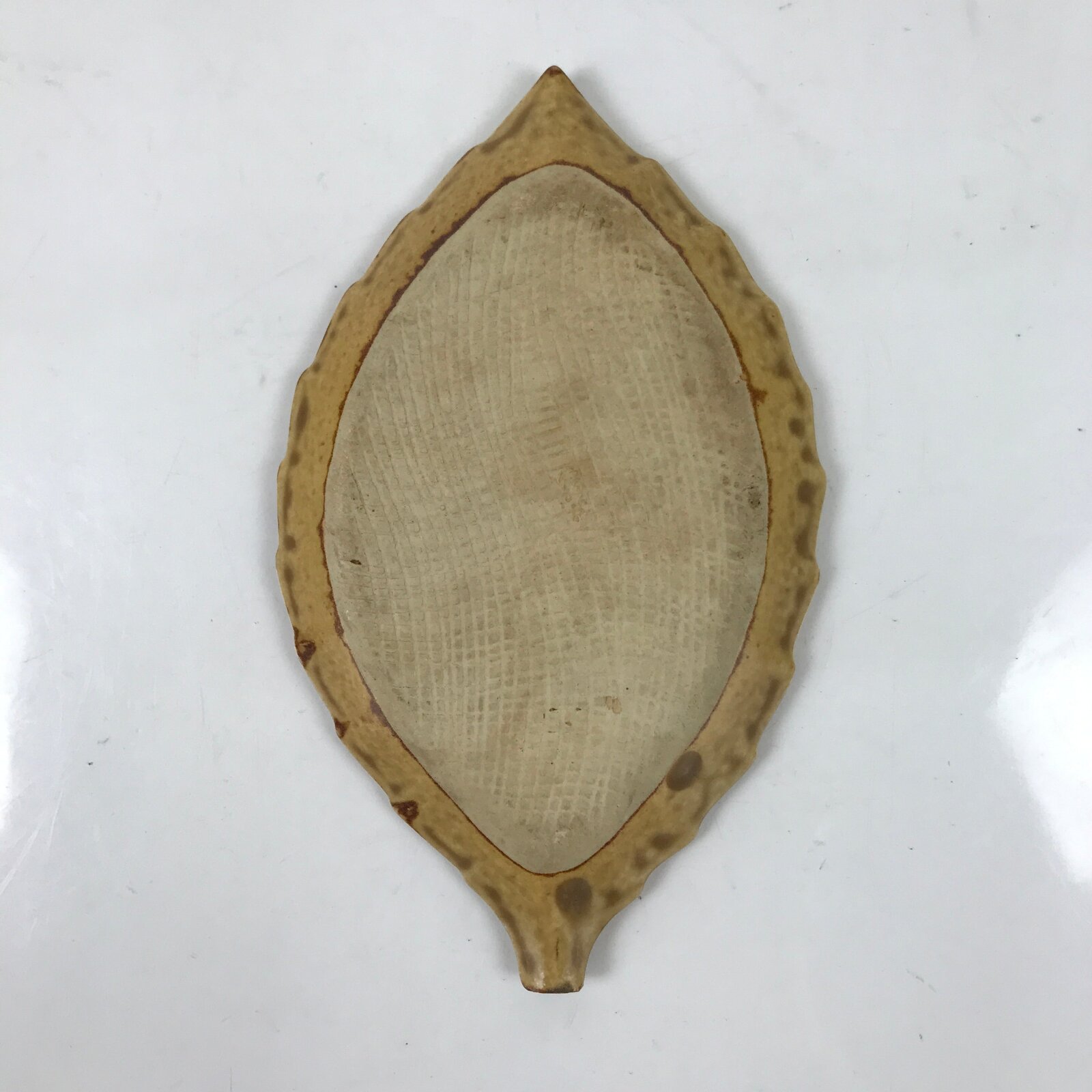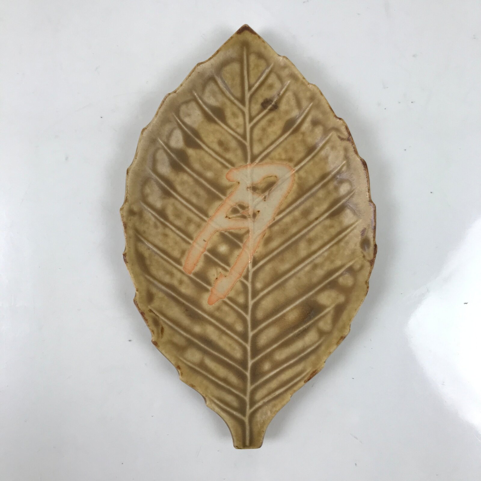 This vintage Japanese small leaf-shaped plate is made of ceramic pottery and has a matte brown glaze with raised bumps around the veins of the leaf, and an unglazed beige kanji character at the center. The calligraphy kanji displayed means “moon”. This type of plate is called meimeizara and is the perfect size to serve wagashi, traditional Japanese sweets. It also serves as a plate for side dishes in a Japanese meal set.