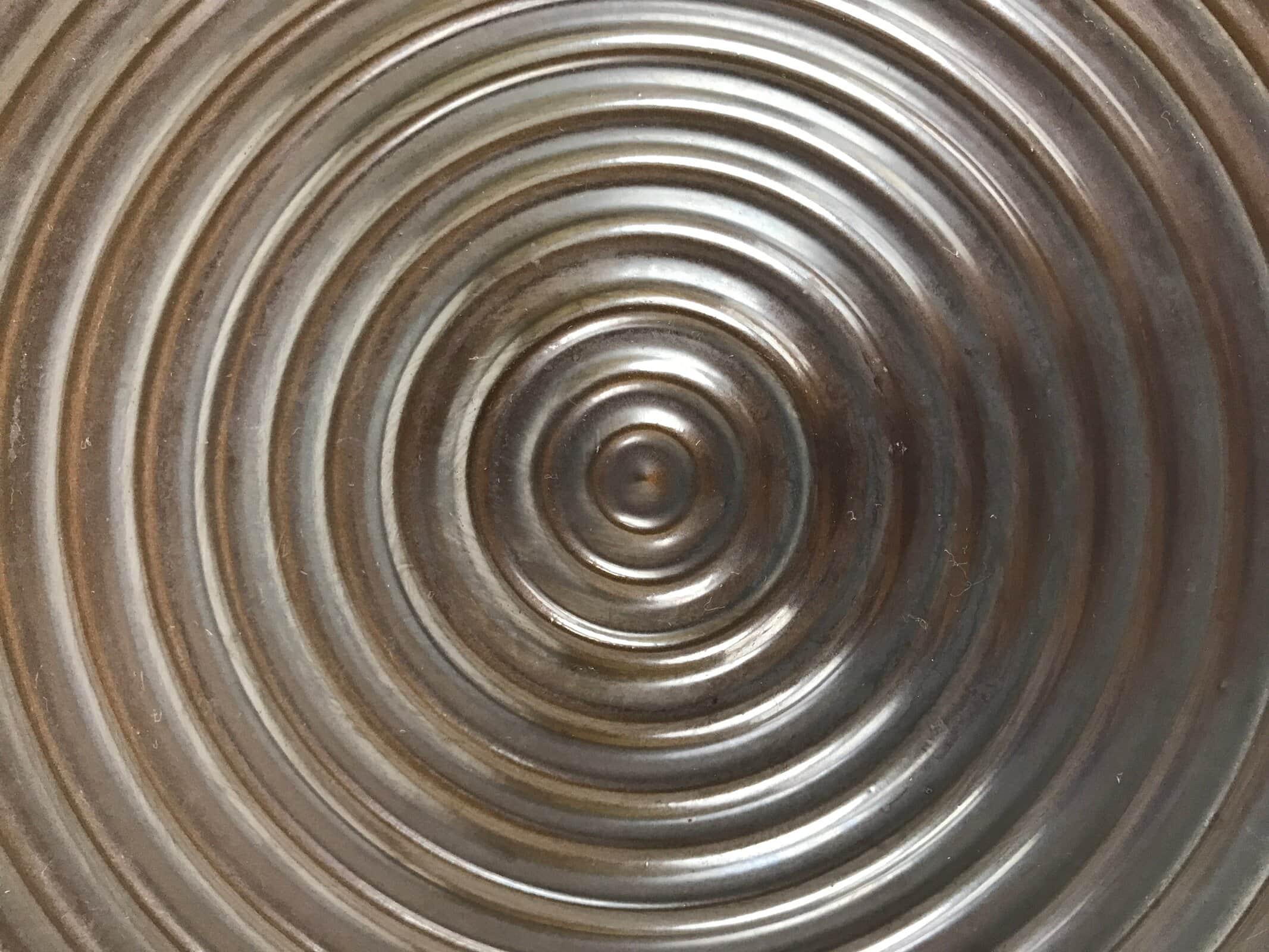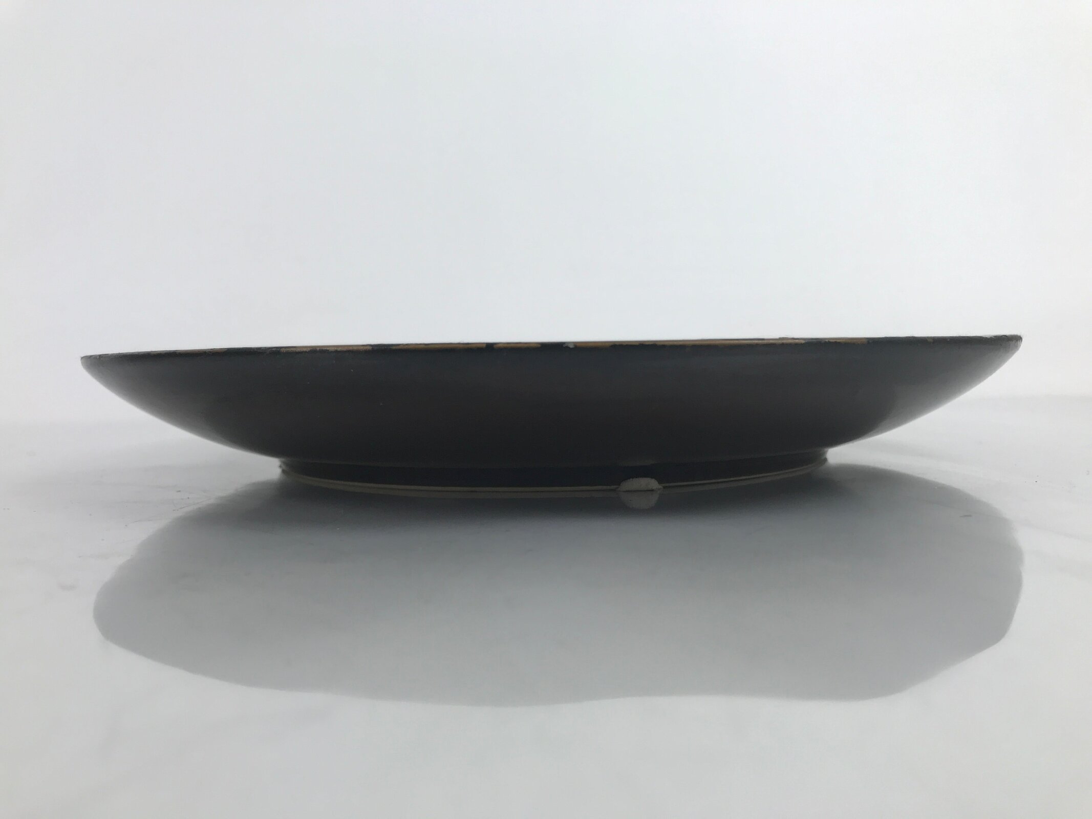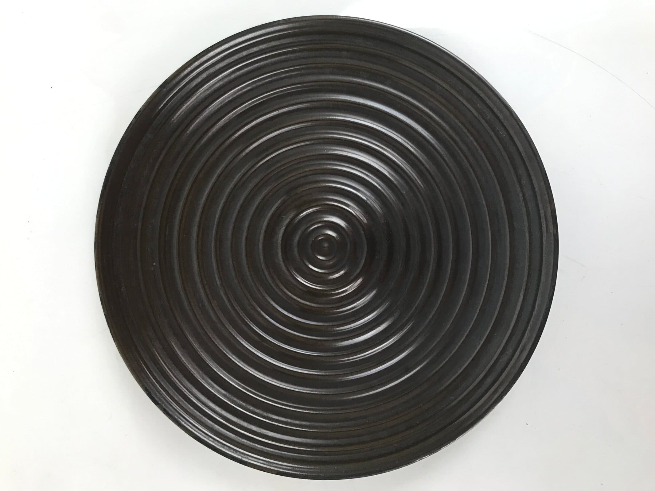 This is a vintage Japanese ceramic plate. This round, medium-sized plate, also called sara, is a dark, glossy brown with a textured ripple design on the top surface. It has small cushion pads on the bottom to prevent scratching on surfaces and provide traction. Because the design is so textured, this plate is likely used for decoration or for serving snacks or displaying fruit.