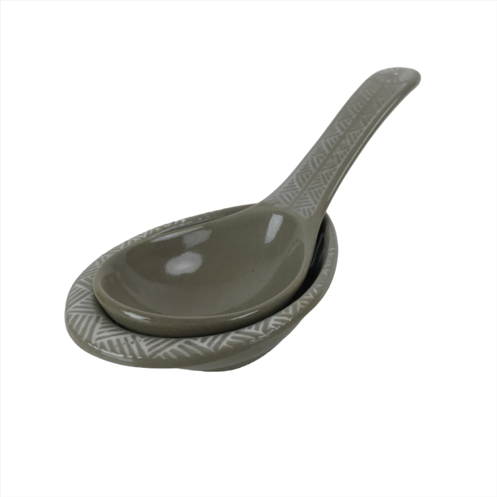 Japanese Ceramic Renge Spoon W/Stand Vtg Nabe Ramen Noodle Soup Gray PY877