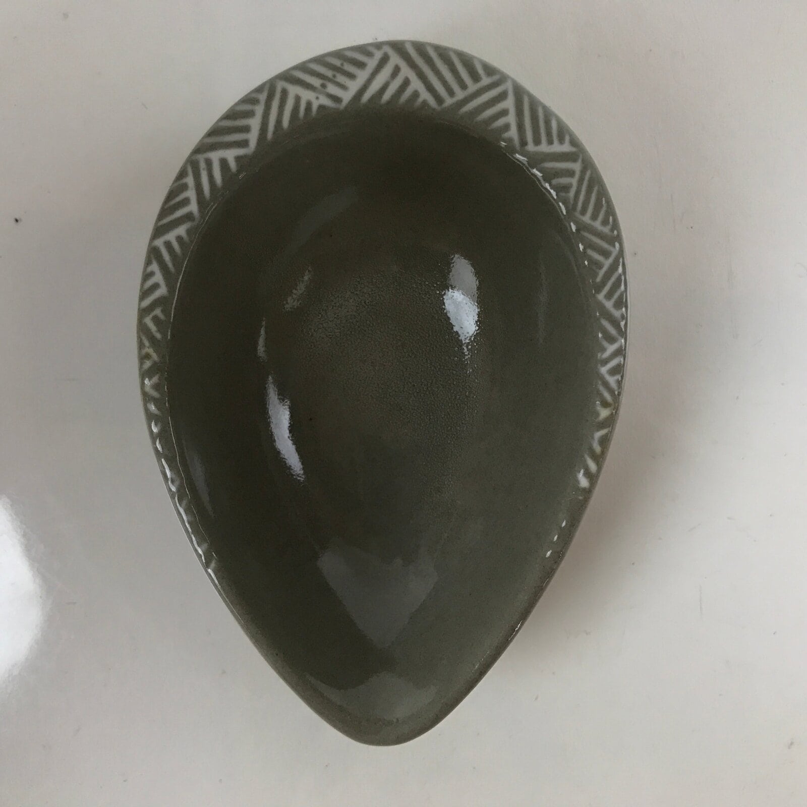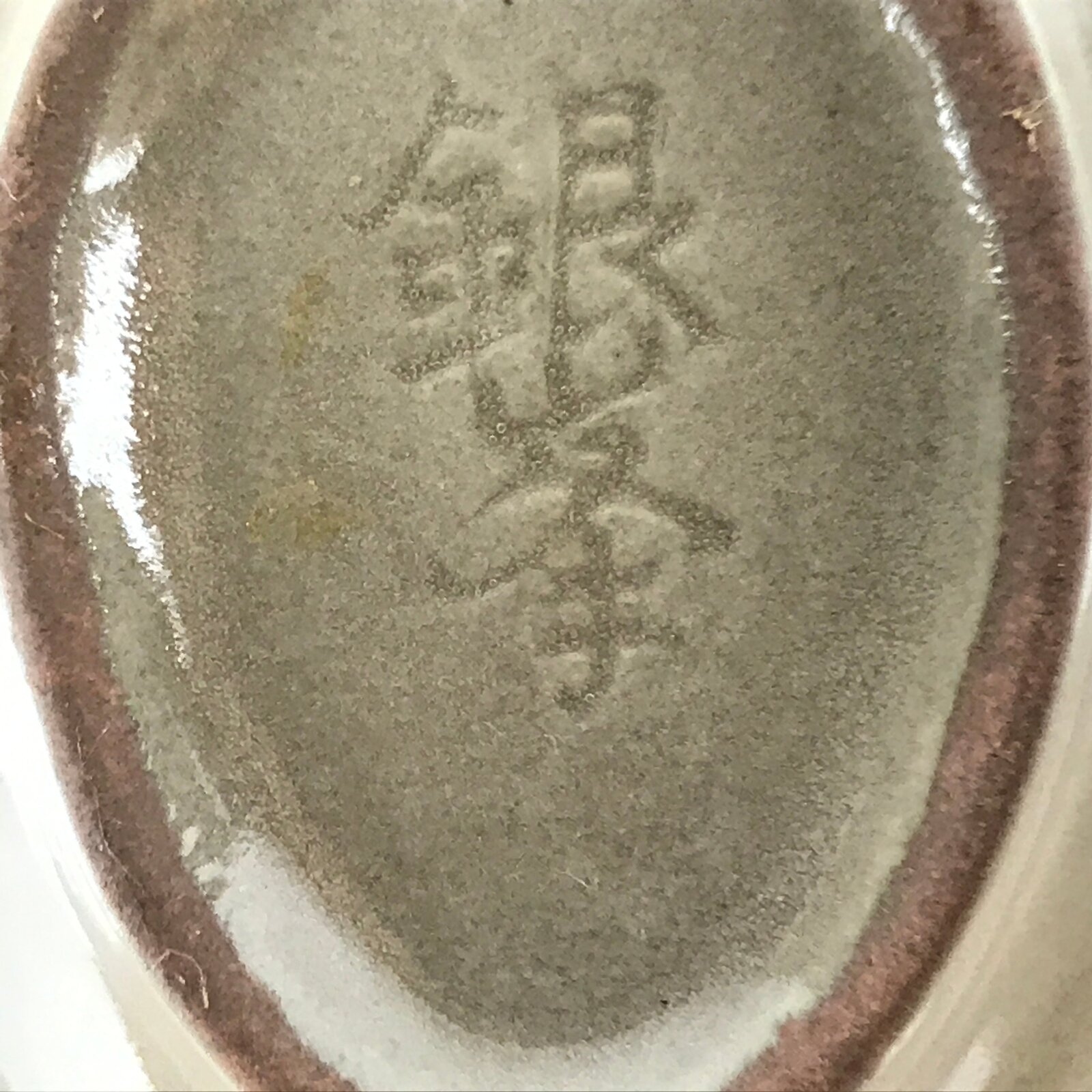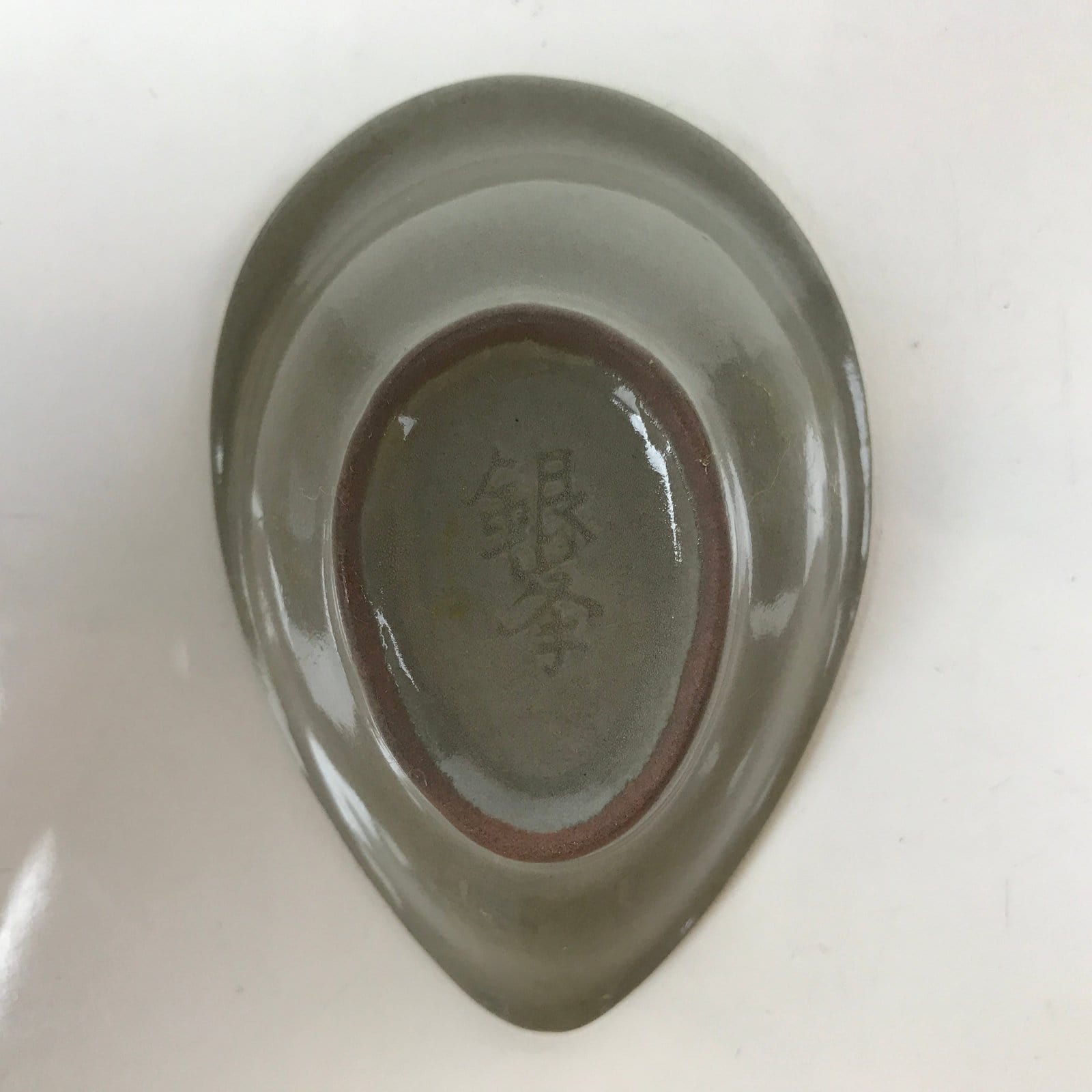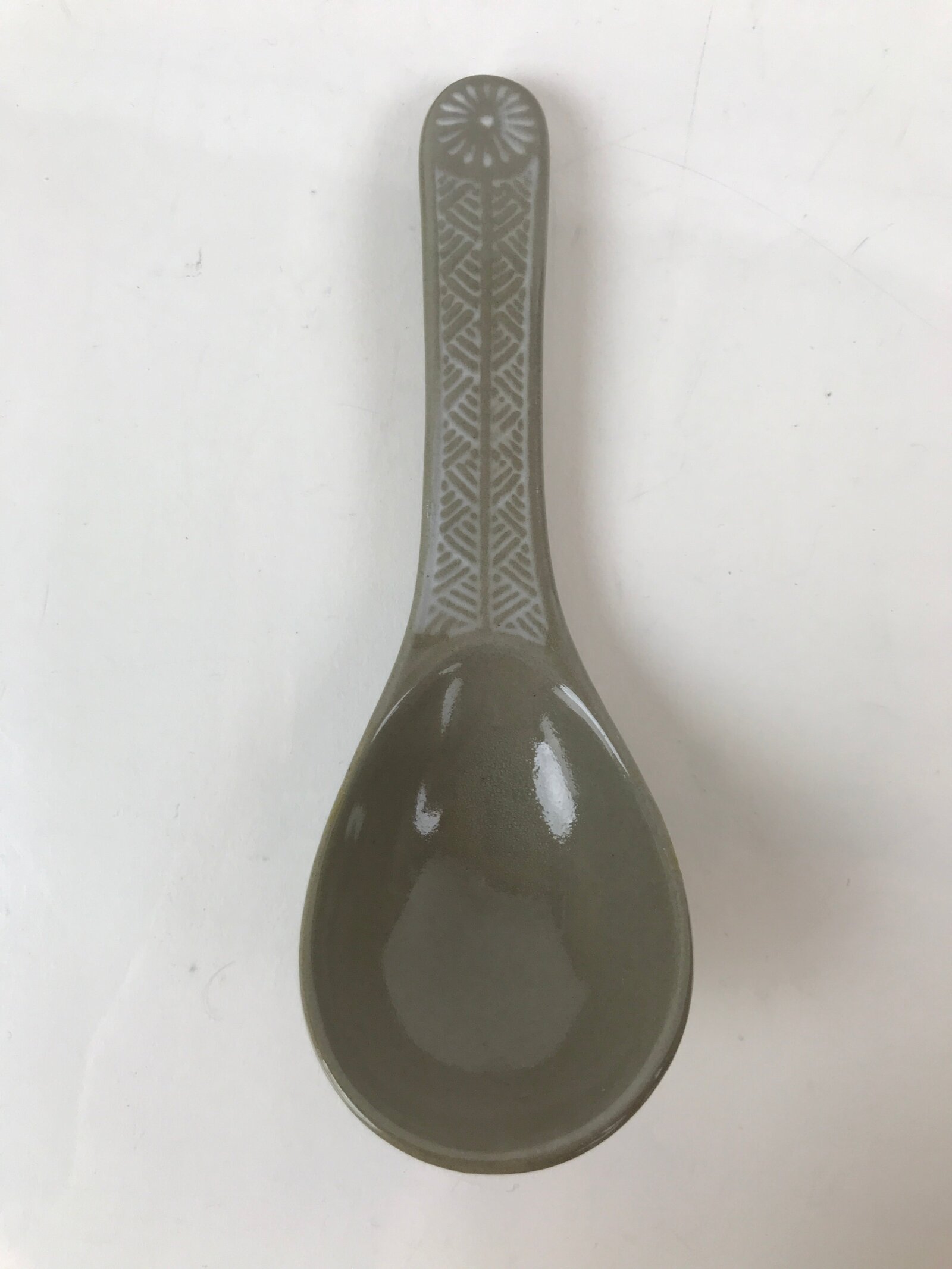 This is a Japanese vintage ceramic spoon with matching stand/rest. This type of spoon (chirirenge/renge) is used when eating ramen noodles or other soup dishes like nabe hot pot. They can also be used to eat fried rice. The spoon has an easy to hold handle and features a solid gray glaze and a white lined pattern with a chrysanthemum at the very end of the handle. This style of pottery is called “banko ware” and is made by Ginpo. The stand is a teardrop shape with the same design and color and has a maker’s stamp on the bottom.