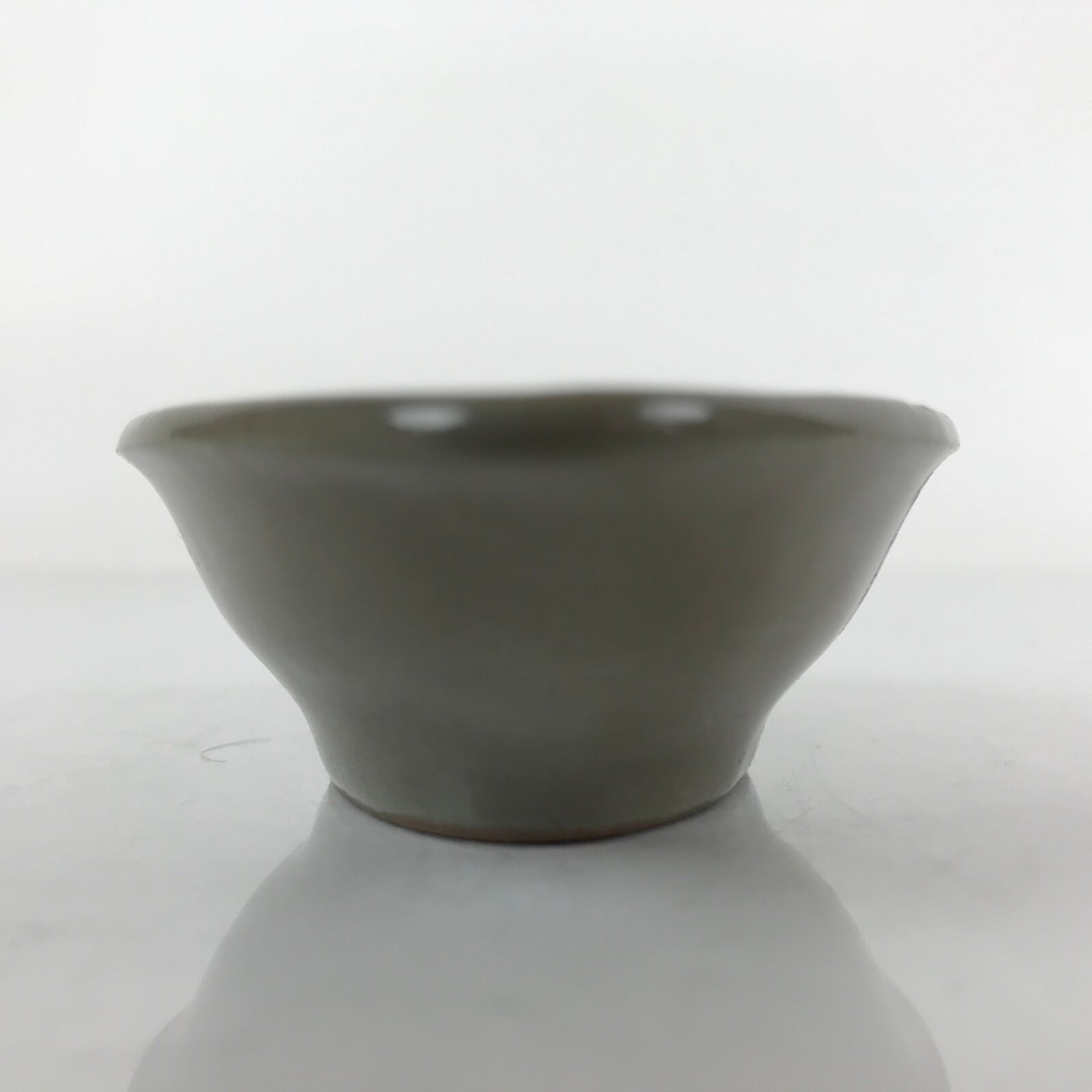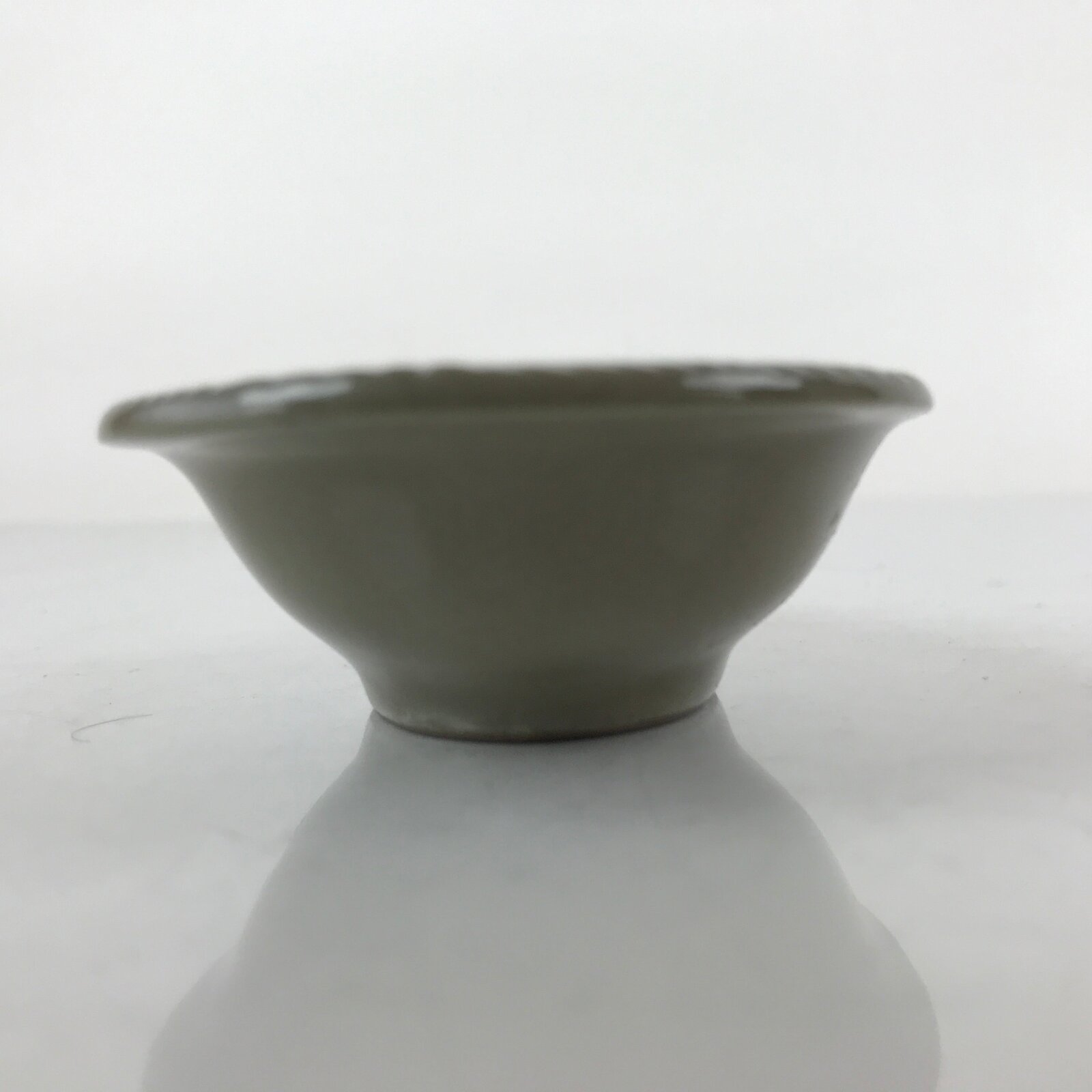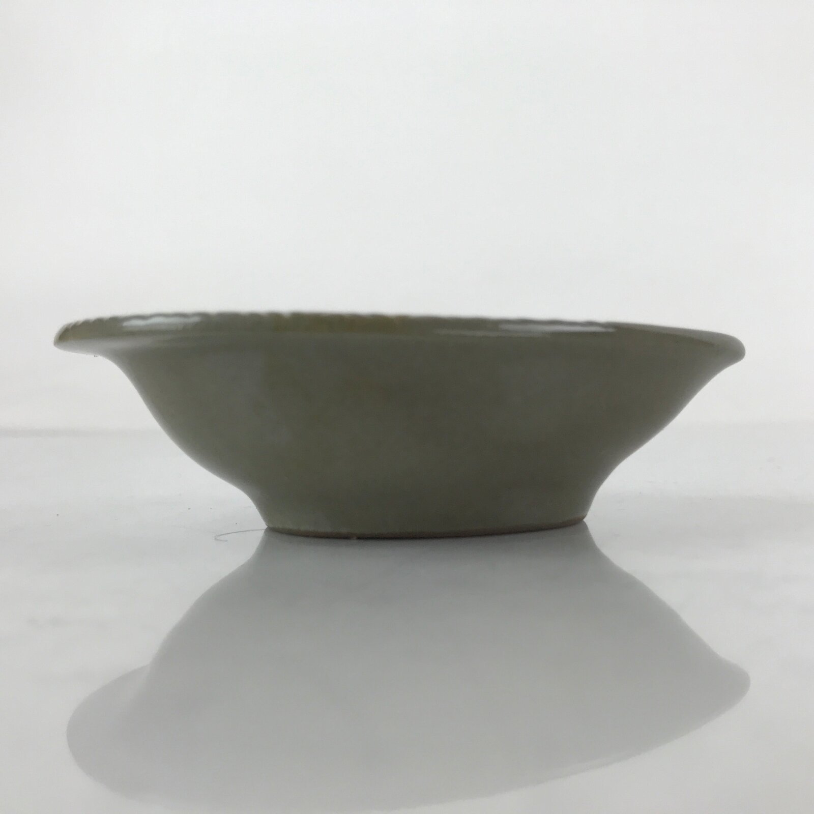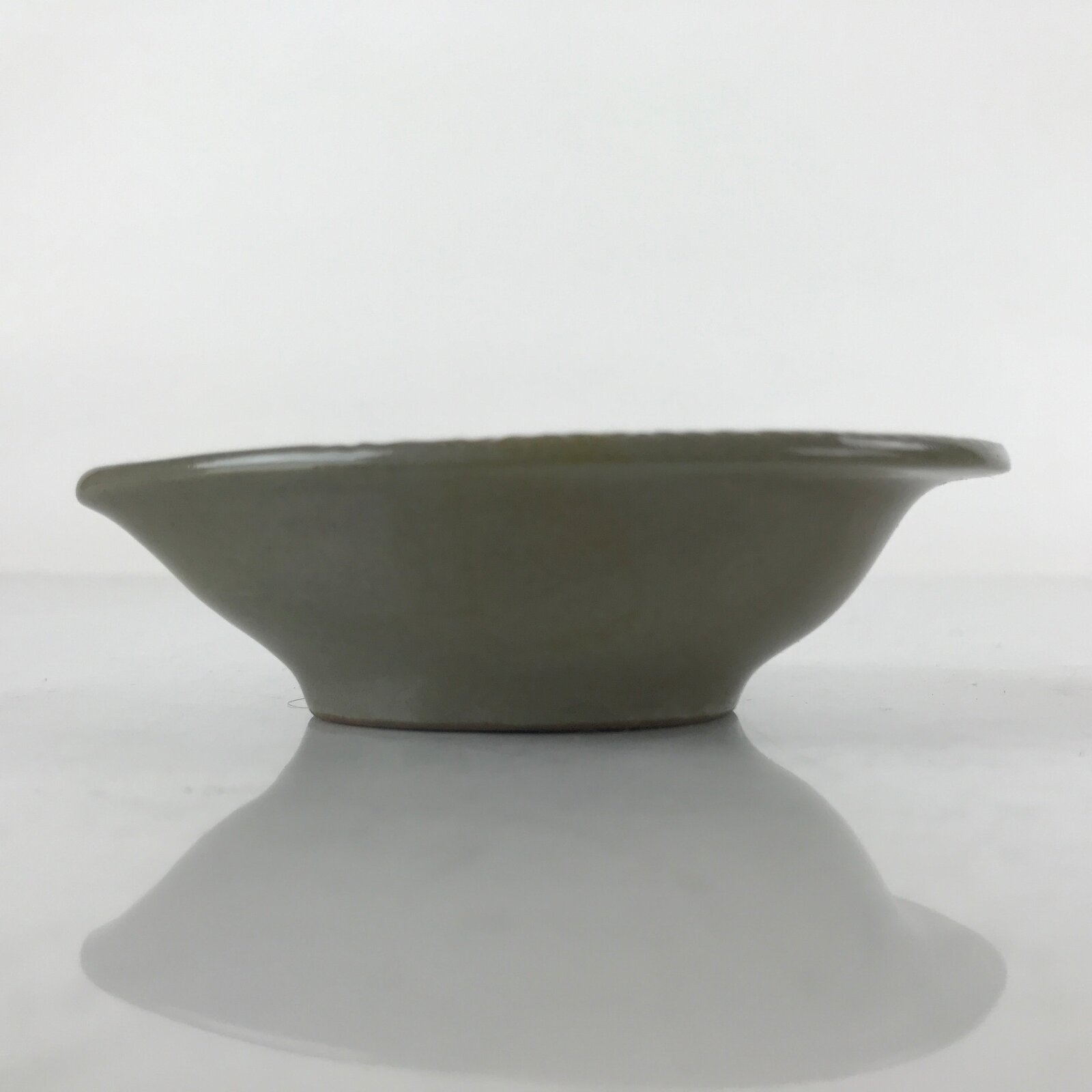 This is a Japanese vintage ceramic spoon with matching stand/rest. This type of spoon (chirirenge/renge) is used when eating ramen noodles or other soup dishes like nabe hot pot. They can also be used to eat fried rice. The spoon has an easy to hold handle and features a solid gray glaze and a white lined pattern with a chrysanthemum at the very end of the handle. This style of pottery is called “banko ware” and is made by Ginpo. The stand is a teardrop shape with the same design and color and has a maker’s stamp on the bottom.