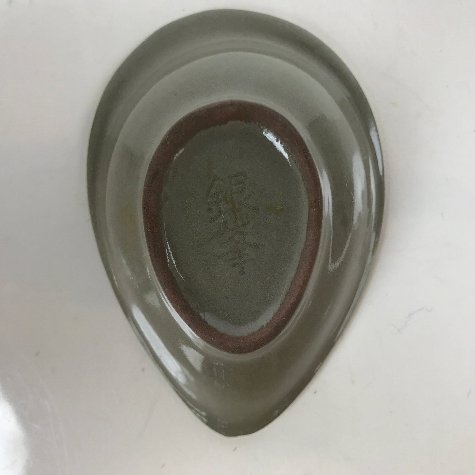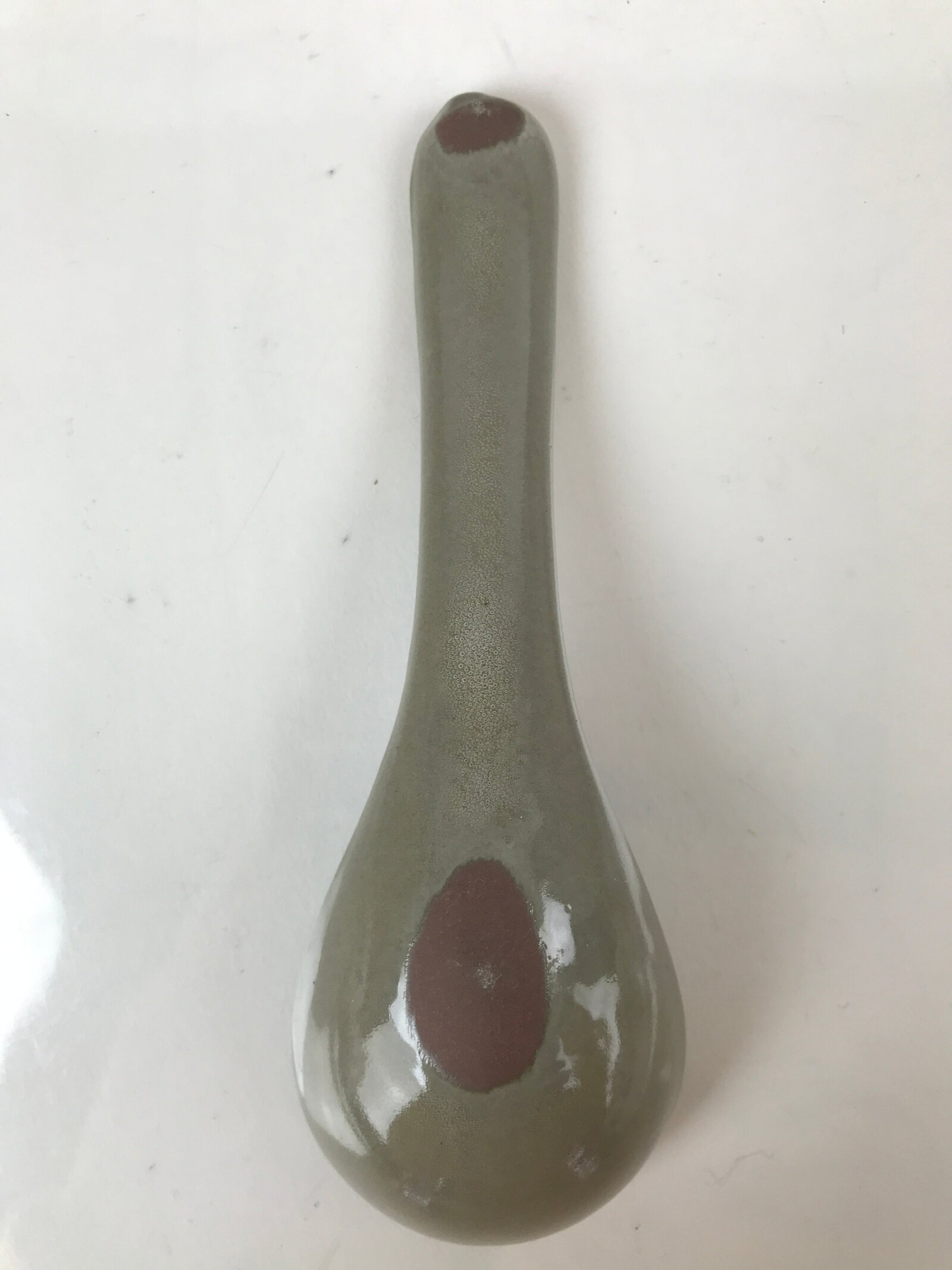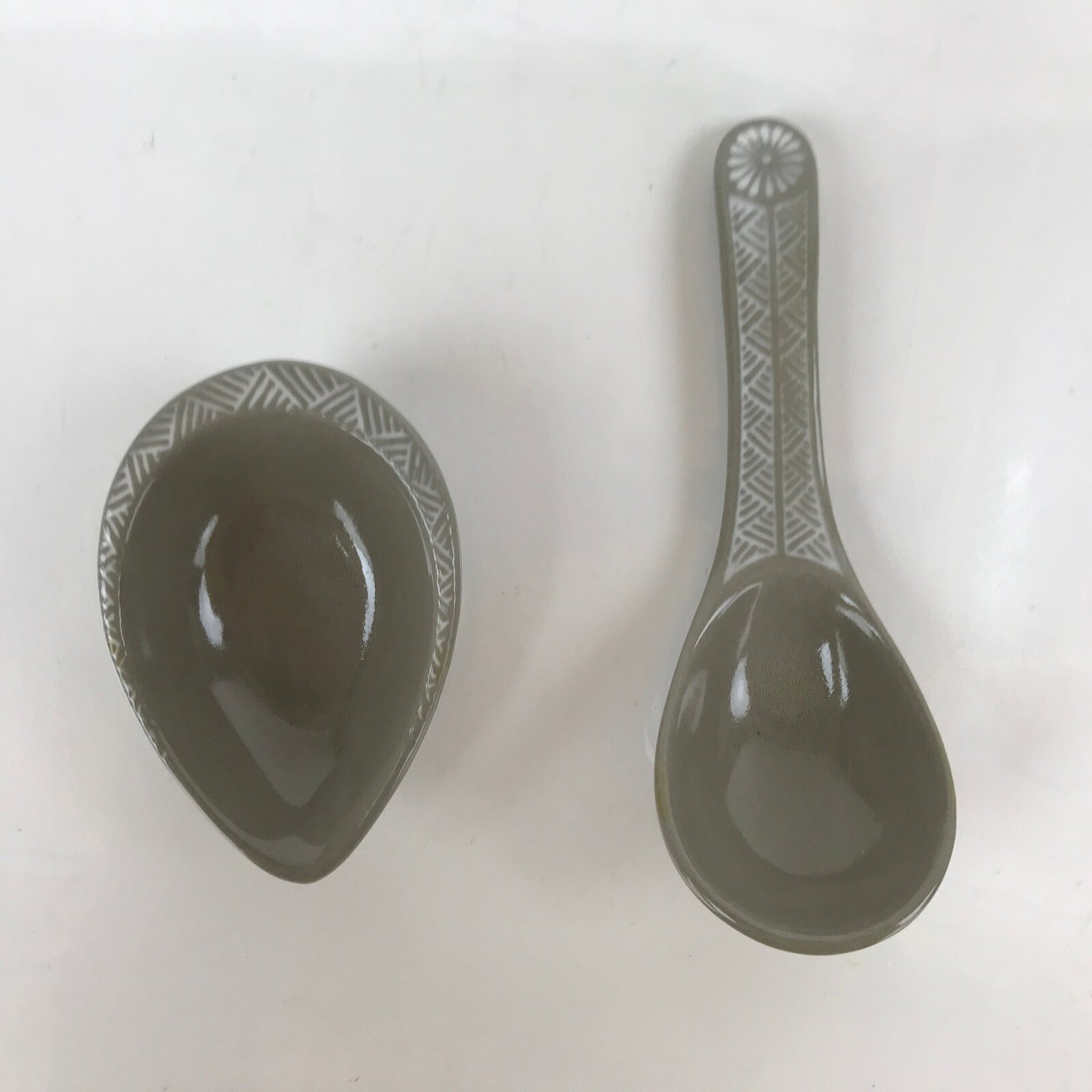 This is a Japanese vintage ceramic spoon with matching stand/rest. This type of spoon (chirirenge/renge) is used when eating ramen noodles or other soup dishes like nabe hot pot. They can also be used to eat fried rice. The spoon has an easy to hold handle and features a solid gray glaze and a white lined pattern with a chrysanthemum at the very end of the handle. This style of pottery is called “banko ware” and is made by Ginpo. The stand is a teardrop shape with the same design and color and has a maker’s stamp on the bottom.