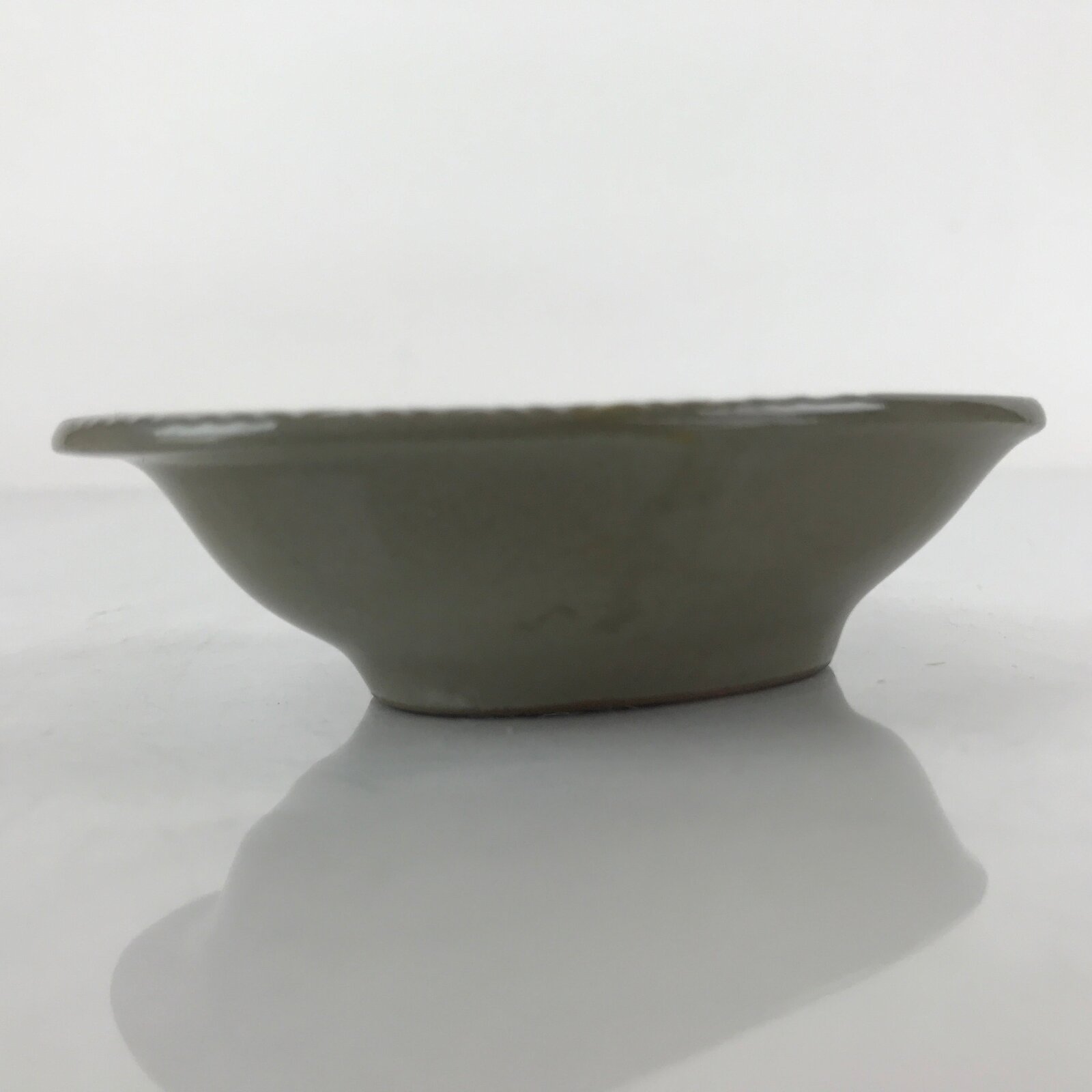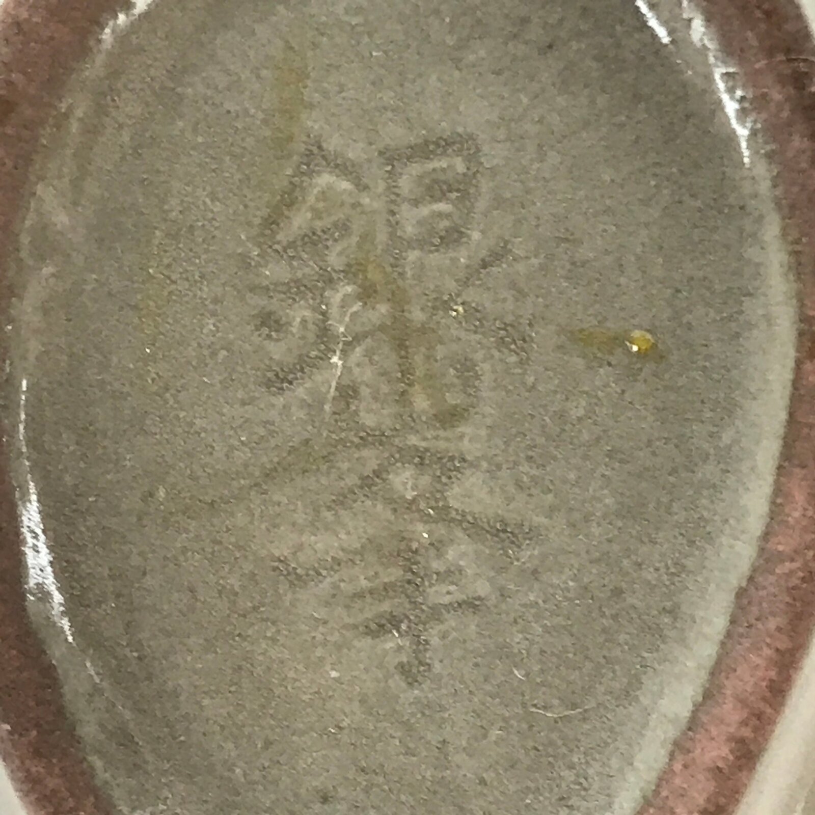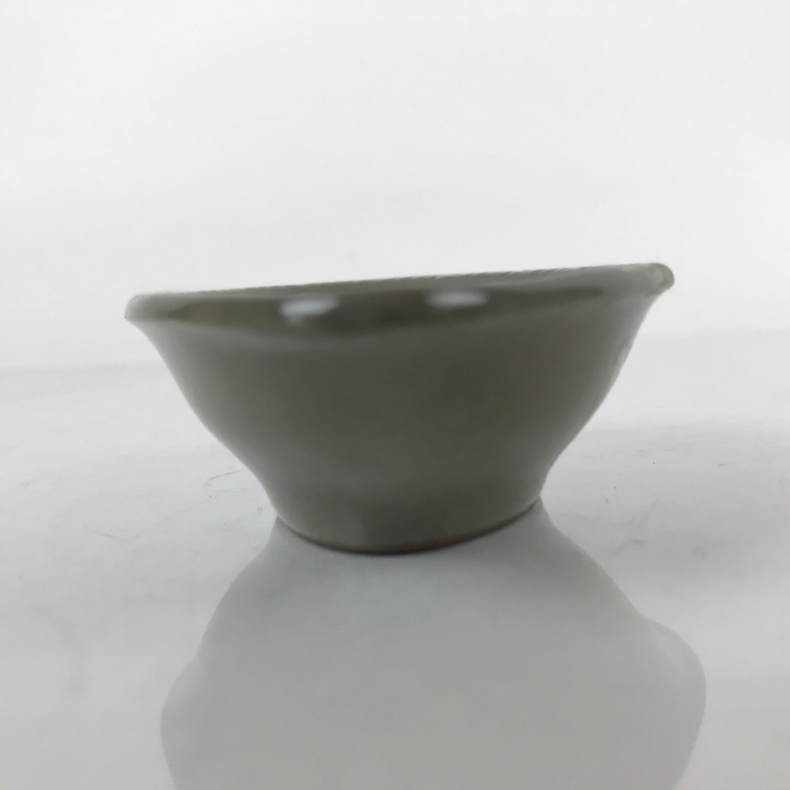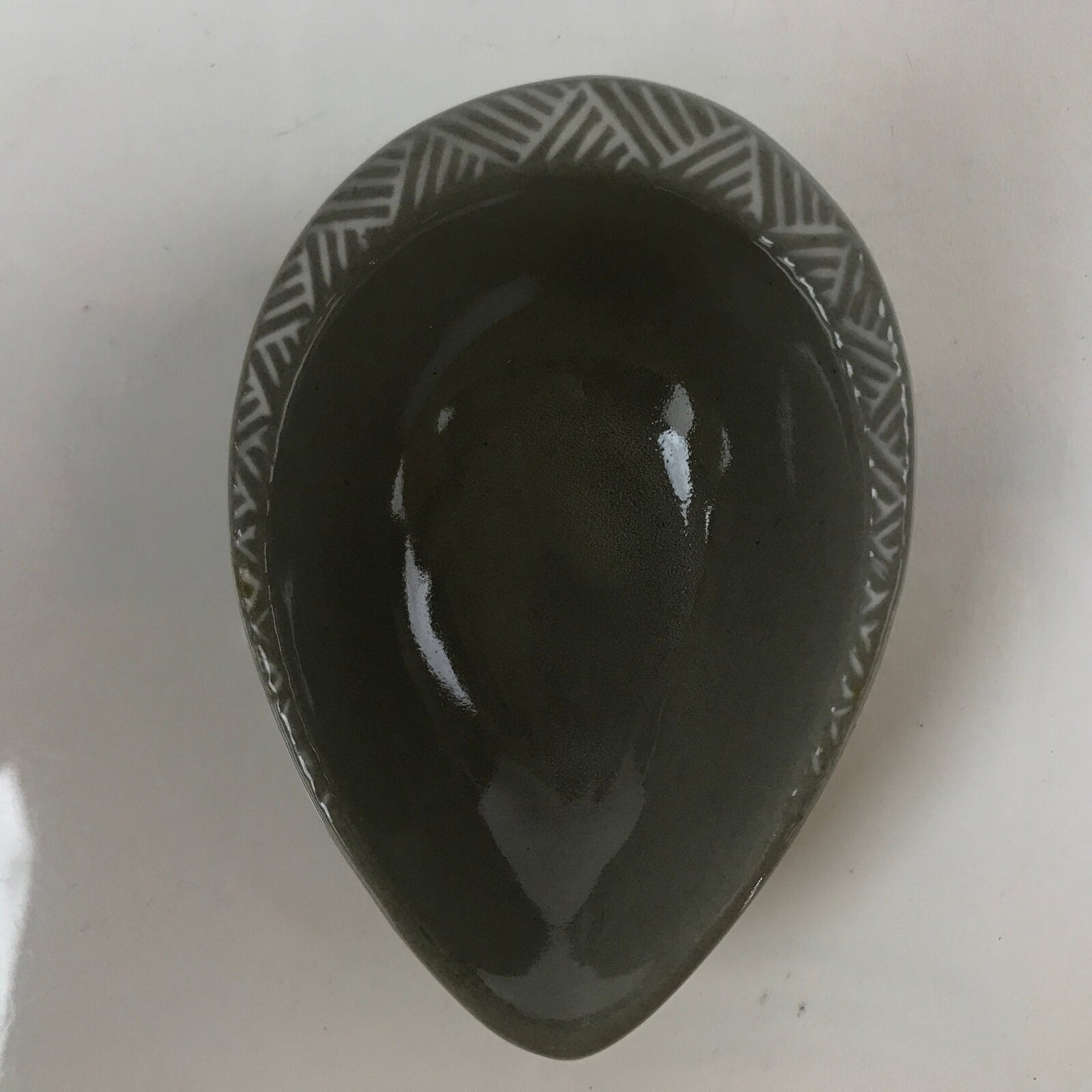 This is a Japanese vintage ceramic spoon with matching stand/rest. This type of spoon (chirirenge/renge) is used when eating ramen noodles or other soup dishes like nabe hot pot. They can also be used to eat fried rice. The spoon has an easy to hold handle and features a solid gray glaze and a white lined pattern with a chrysanthemum at the very end of the handle. This style of pottery is called “banko ware” and is made by Ginpo. The stand is a teardrop shape with the same design and color and has a maker’s stamp on the bottom.