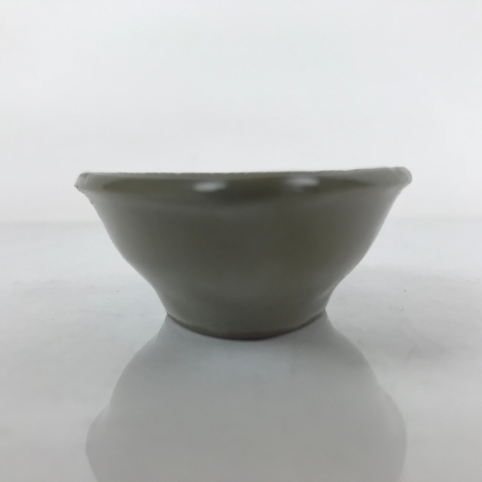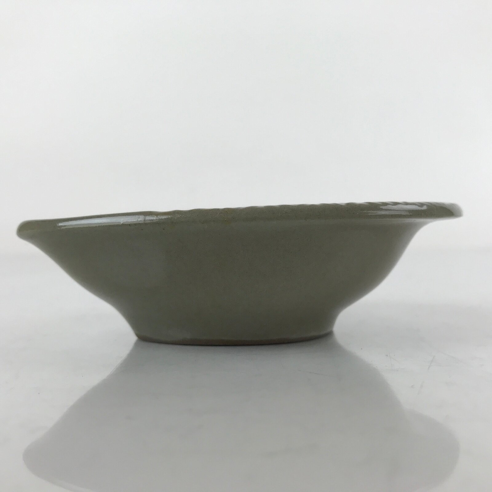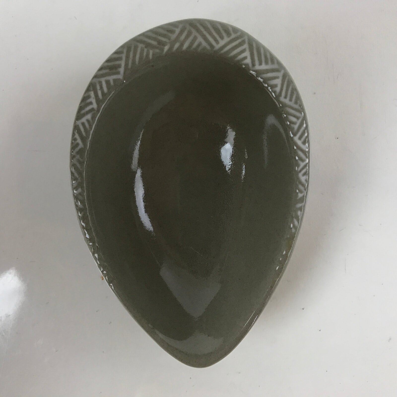 This is a Japanese vintage ceramic spoon with matching stand/rest. This type of spoon (chirirenge/renge) is used when eating ramen noodles or other soup dishes like nabe hot pot. They can also be used to eat fried rice. The spoon has an easy to hold handle and features a solid gray glaze and a white lined pattern with a chrysanthemum at the very end of the handle. This style of pottery is called “banko ware” and is made by Ginpo. The stand is a teardrop shape with the same design and color and has a maker’s stamp on the bottom.