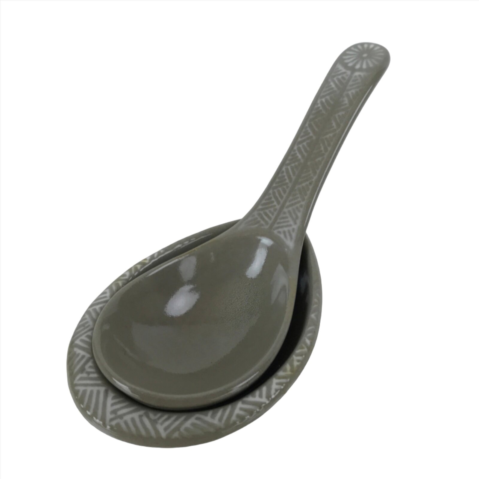 Japanese Ceramic Renge Spoon W/Stand Vtg Nabe Ramen Noodle Soup Gray PY885
