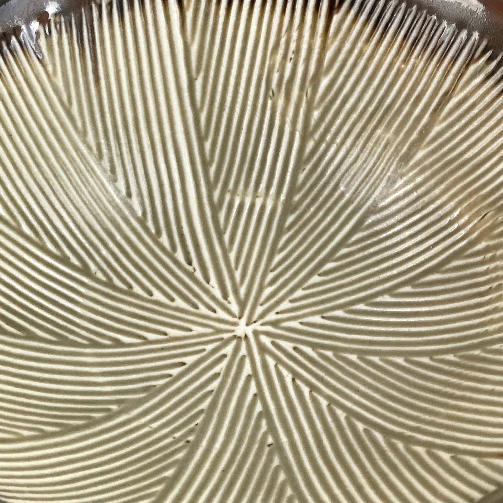 This item is a vintage Japanese ceramic rice bowl. This wide-mouthed small bowl is a matte light brown on the outside bottom and a glossy medium brown glaze on the top and rim. Inside are carved grooves that mimic a traditional suribachi, or grinding bowl. This piece can also be used for side dishes. Rice bowls are made to be lightweight and held in one hand (thumb on rim, other fingers on foot).
