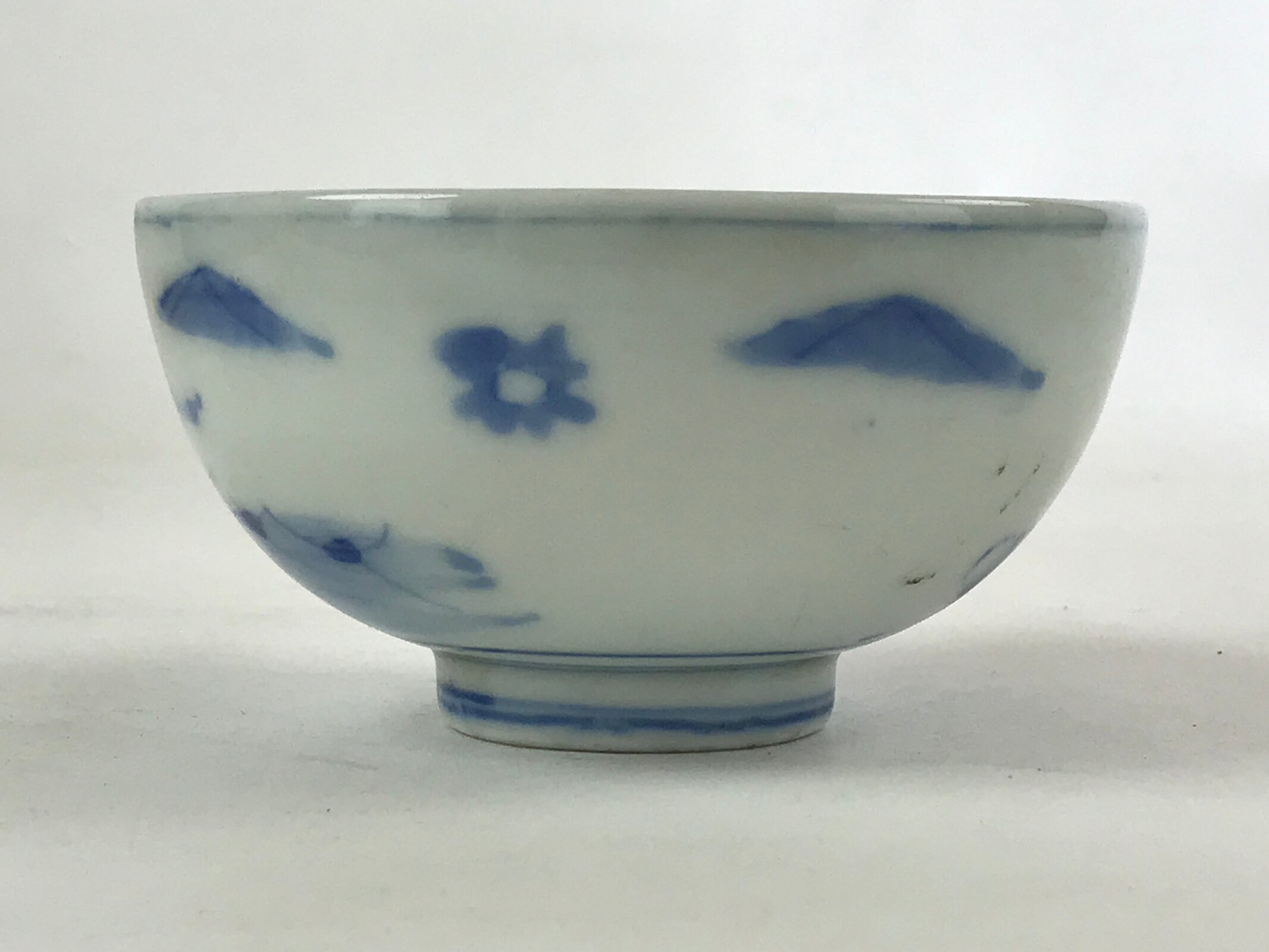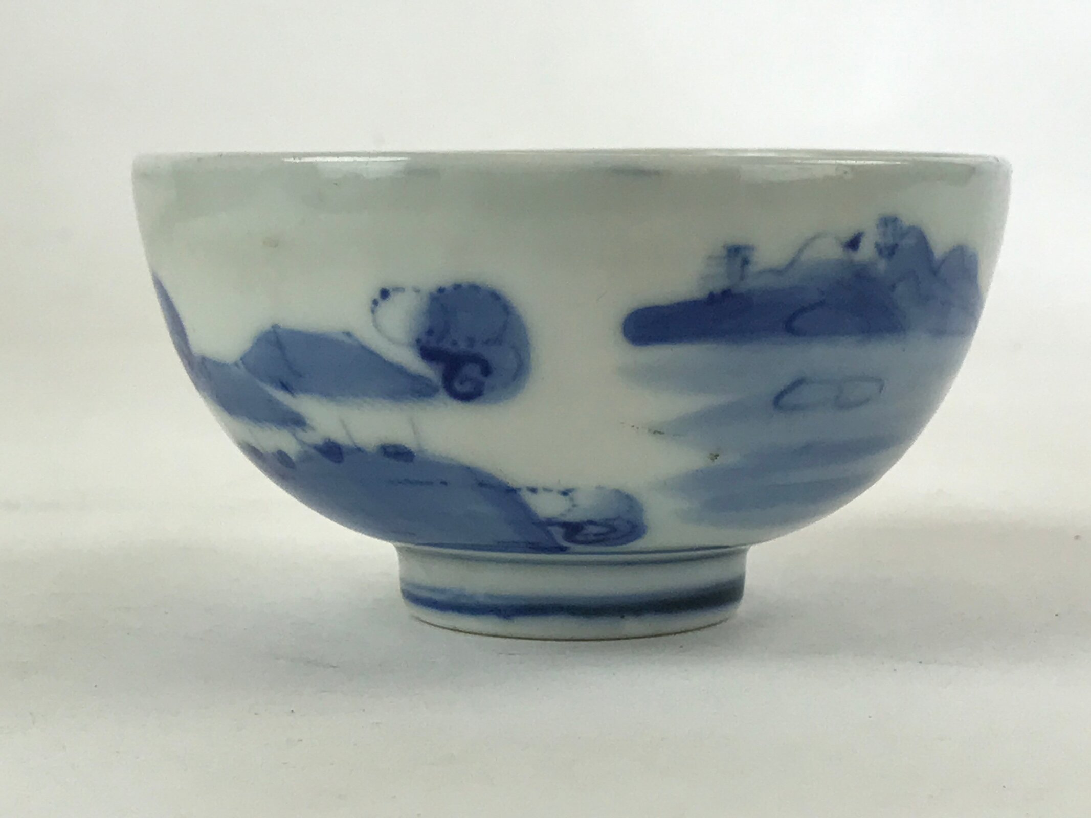 This is a vintage Japanese ceramic rice bowl. This white rice bowl features a blue landscape design on the outside and an abstract design on the inside.