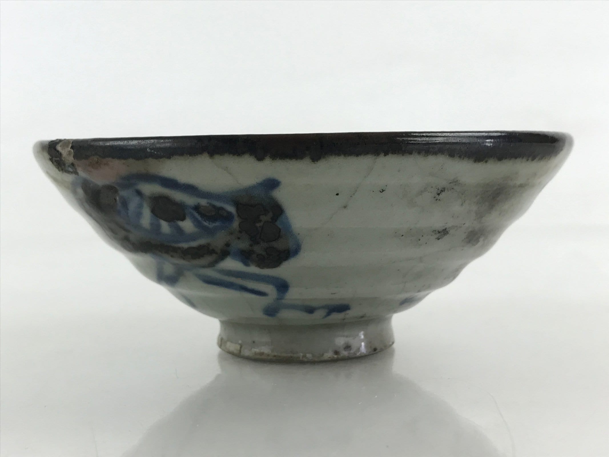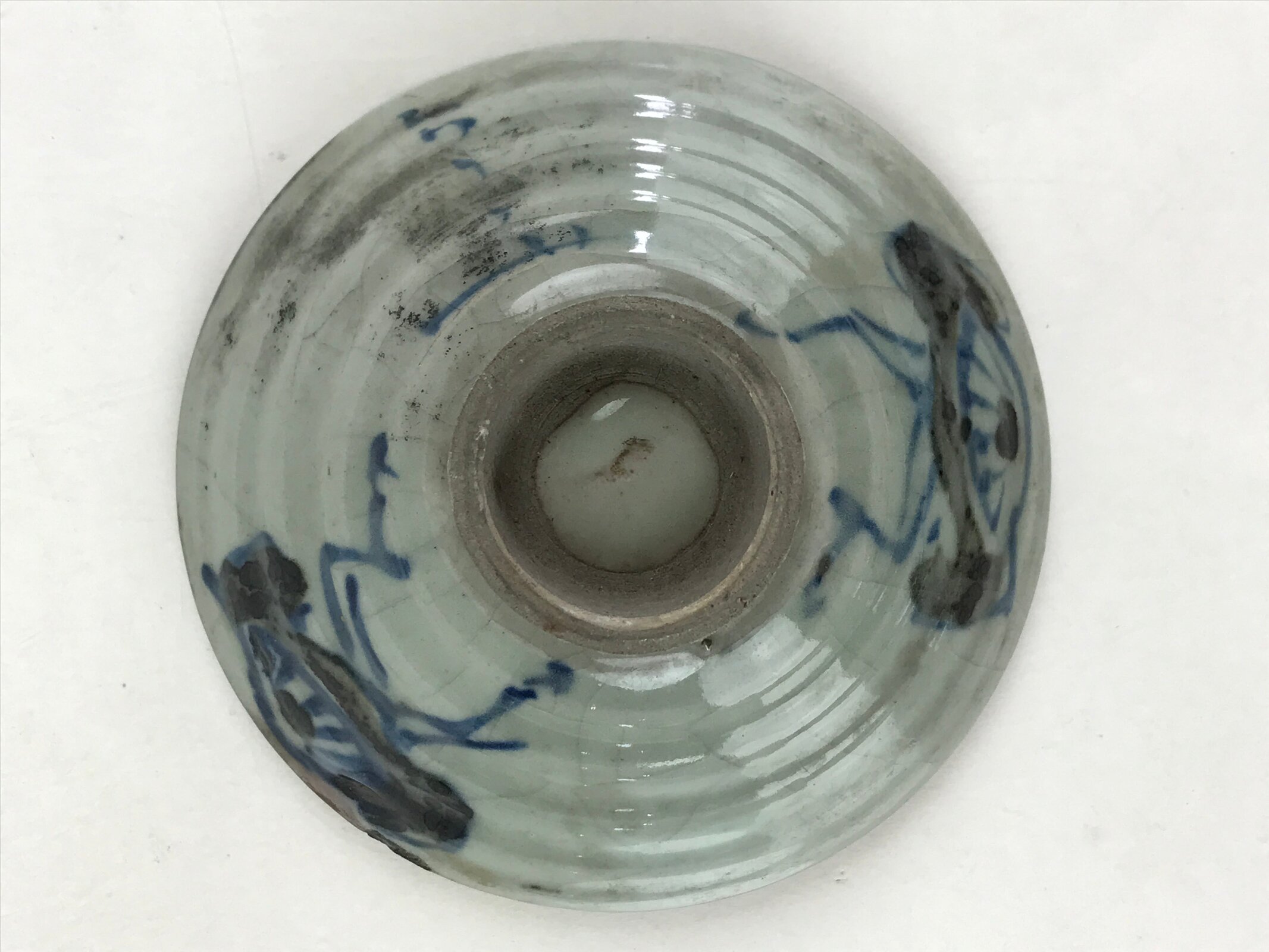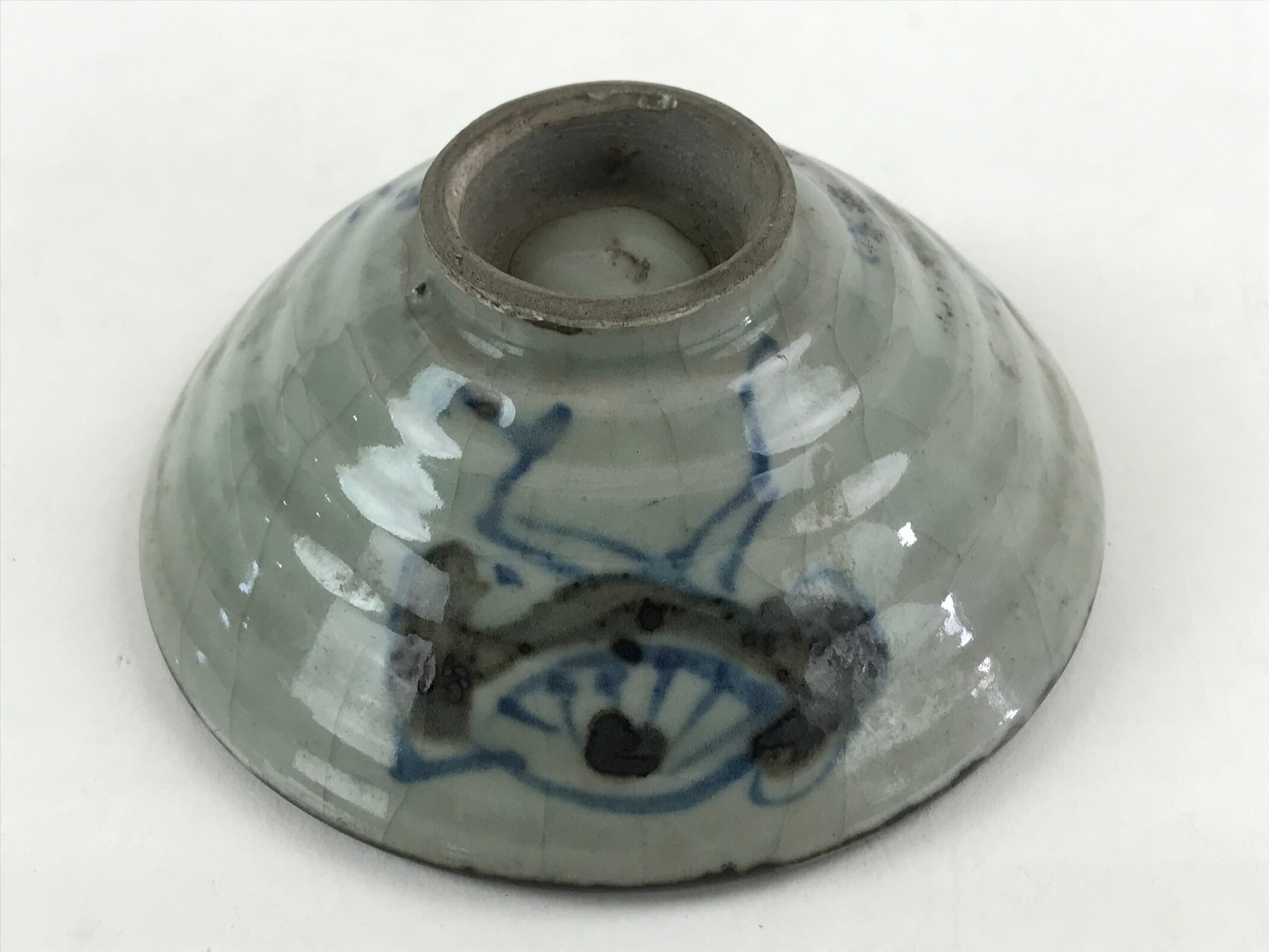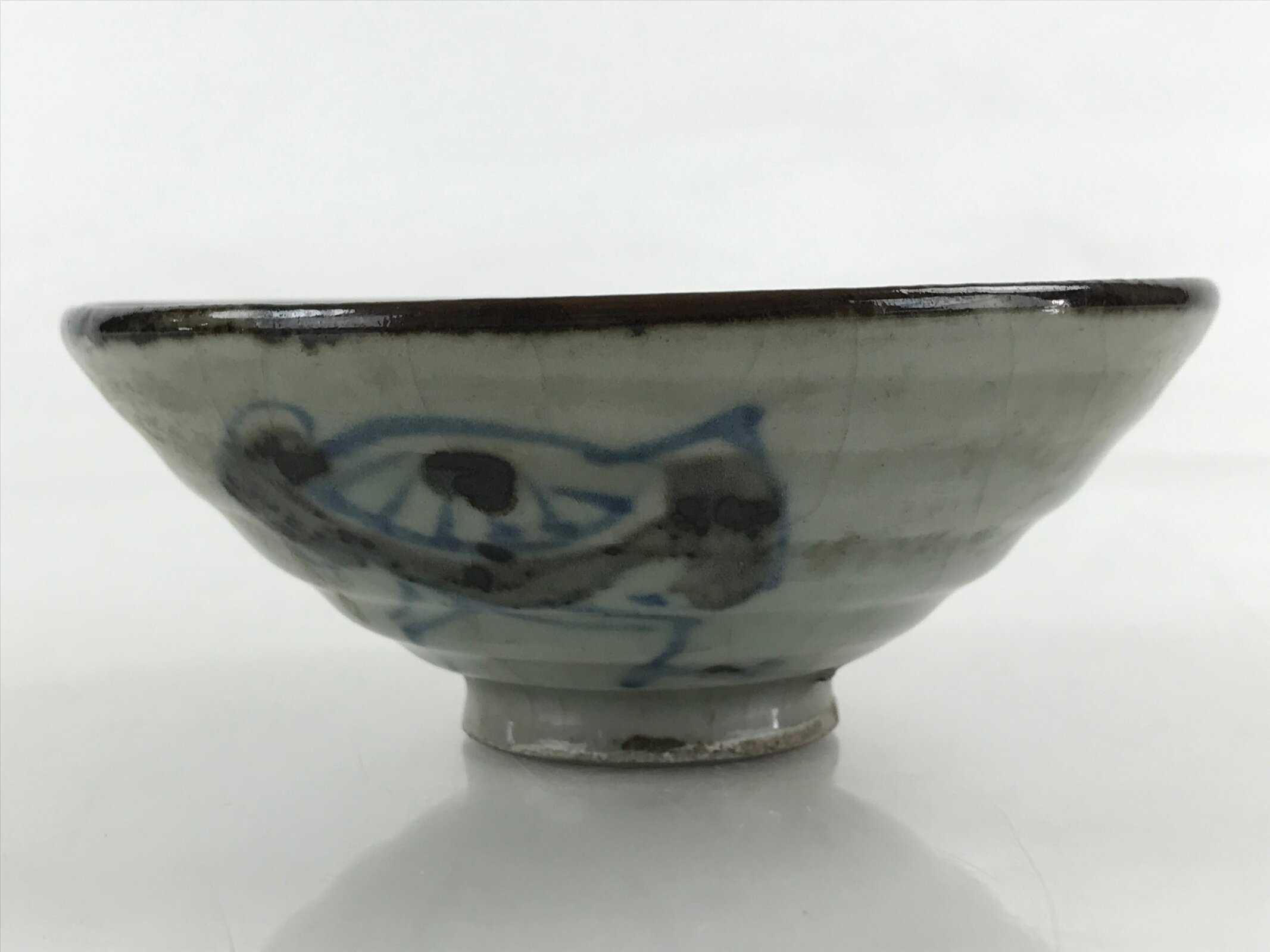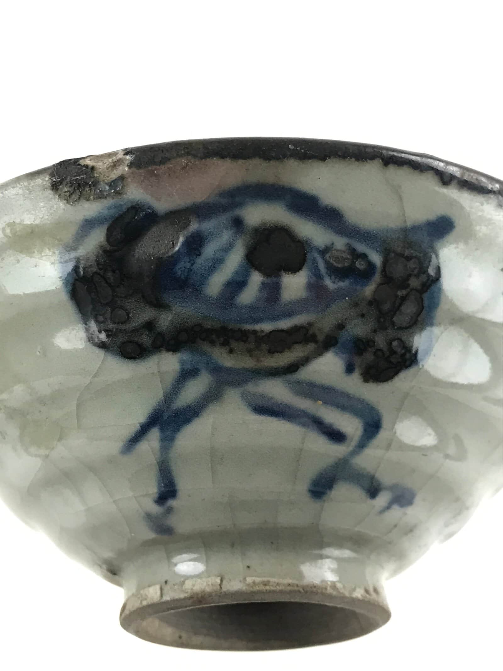This is a vintage Japanese ceramic rice bowl. It is a small shallow bowl. The glaze is grayish in color and finely cracked technic. It has a blue and black picture drawn on the bowl, and a signature is written next to it.