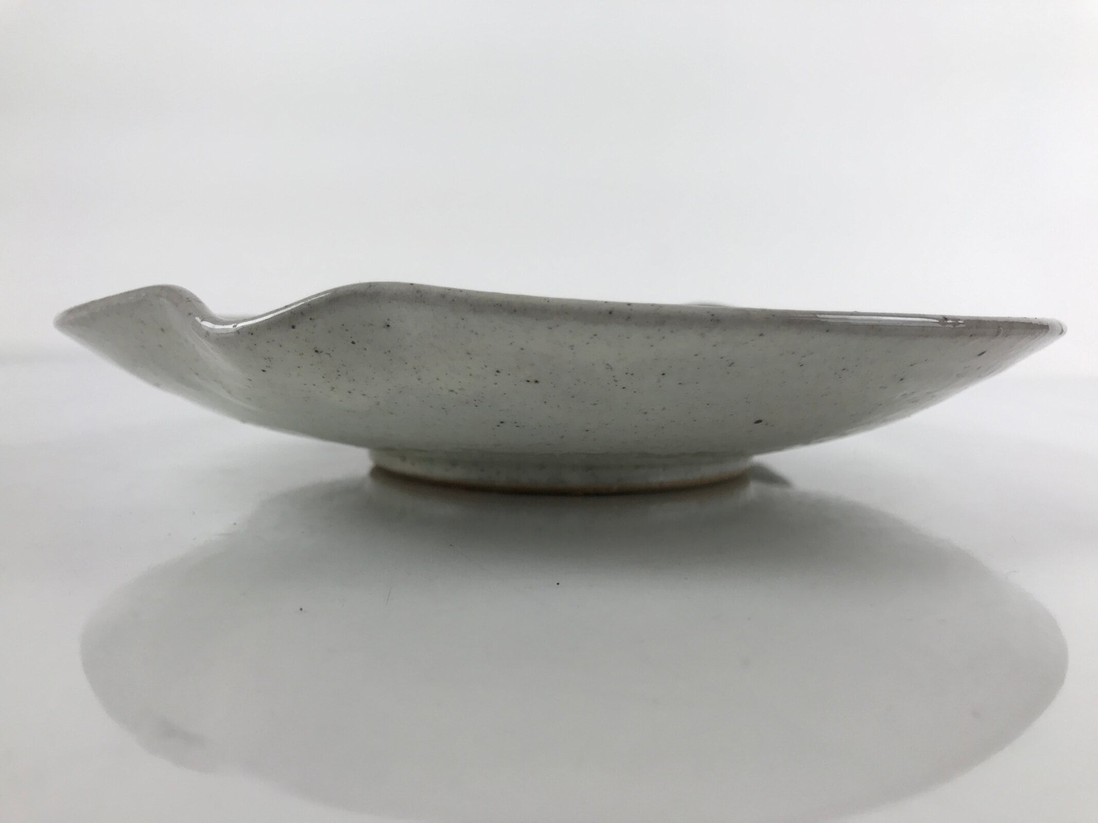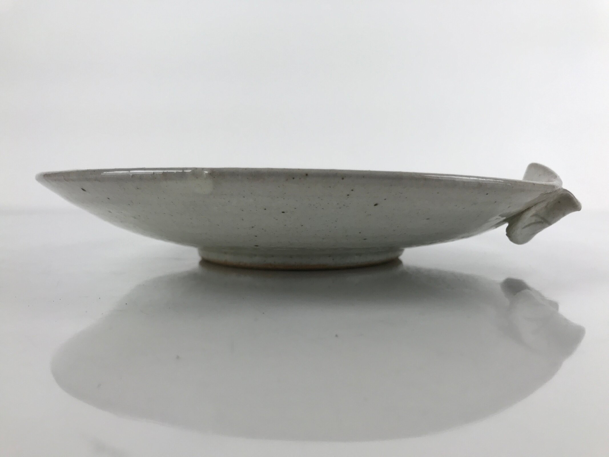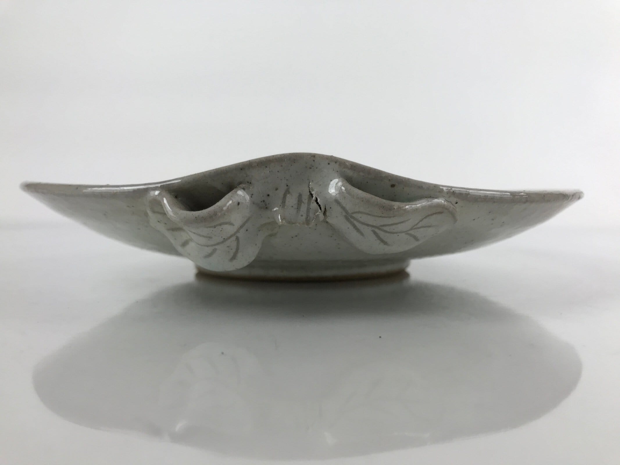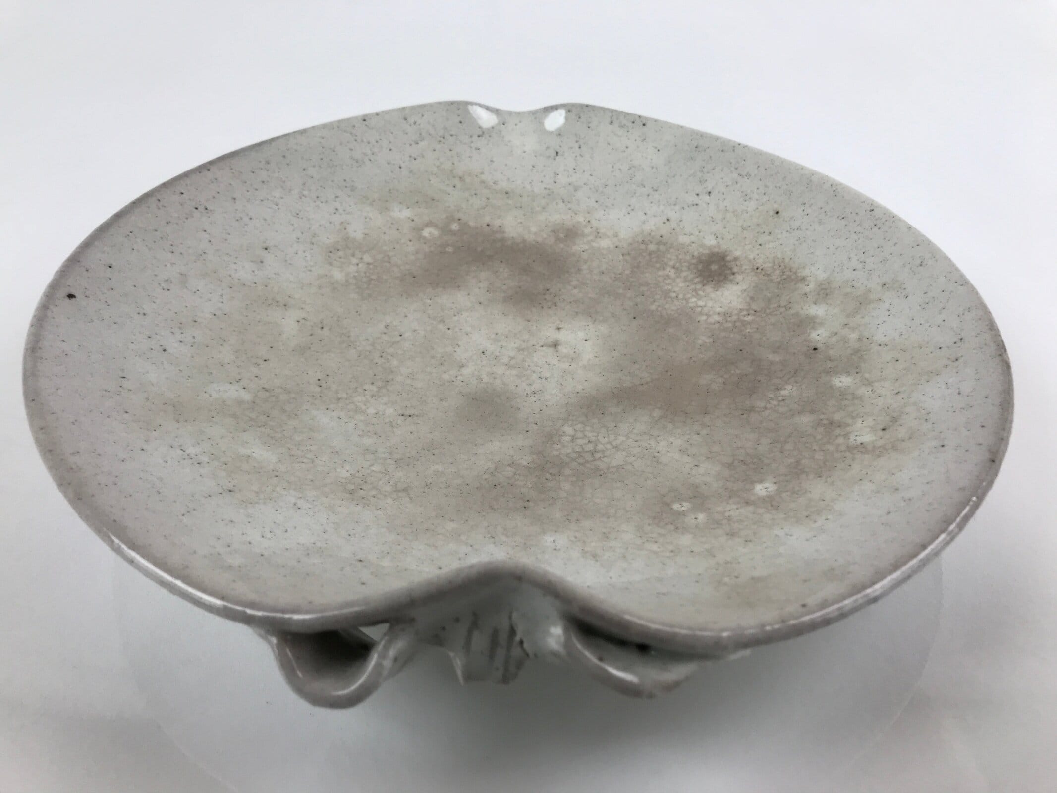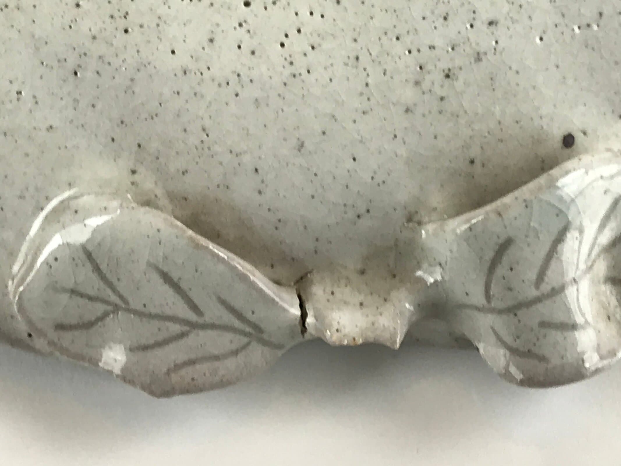 This is a vintage Japanese ceramic plate. It has a speckled gray glaze and two unique features: a small spout on one end and a sculpted leaf handle-like piece on the other. This plate may be a small suiban, a plate or bowl used for ikebana flower arrangements. It can also be used as a drip tray for a potted plant.