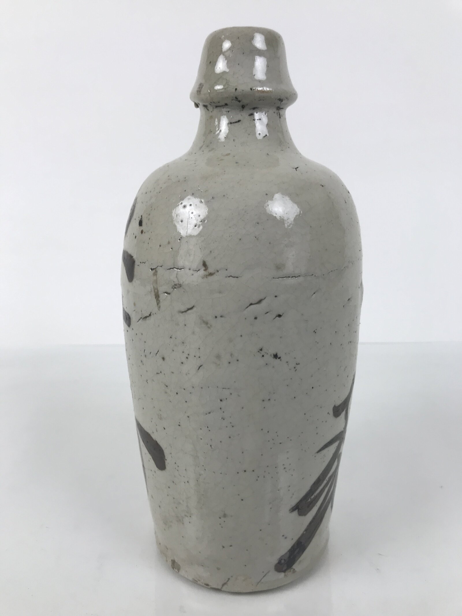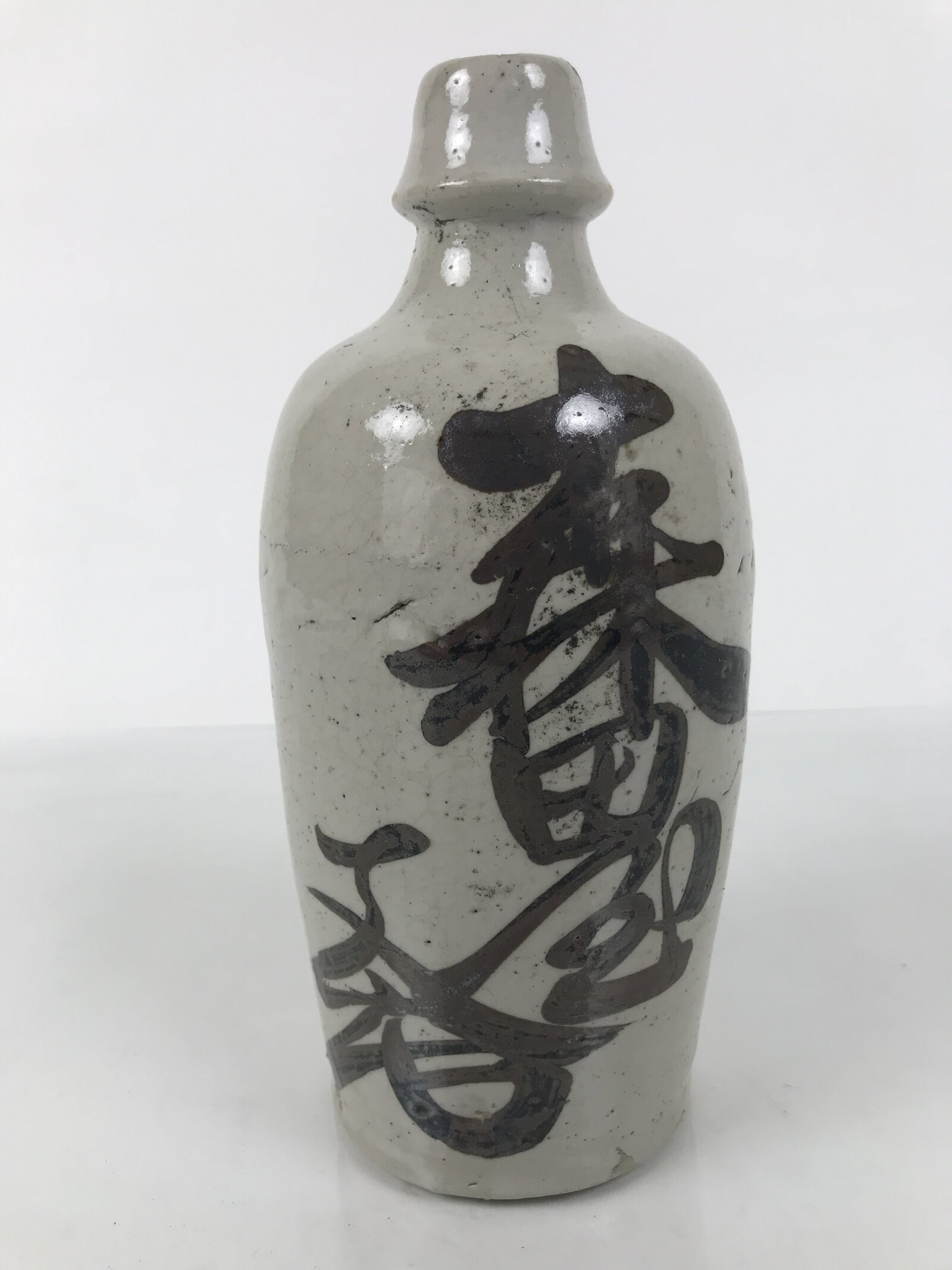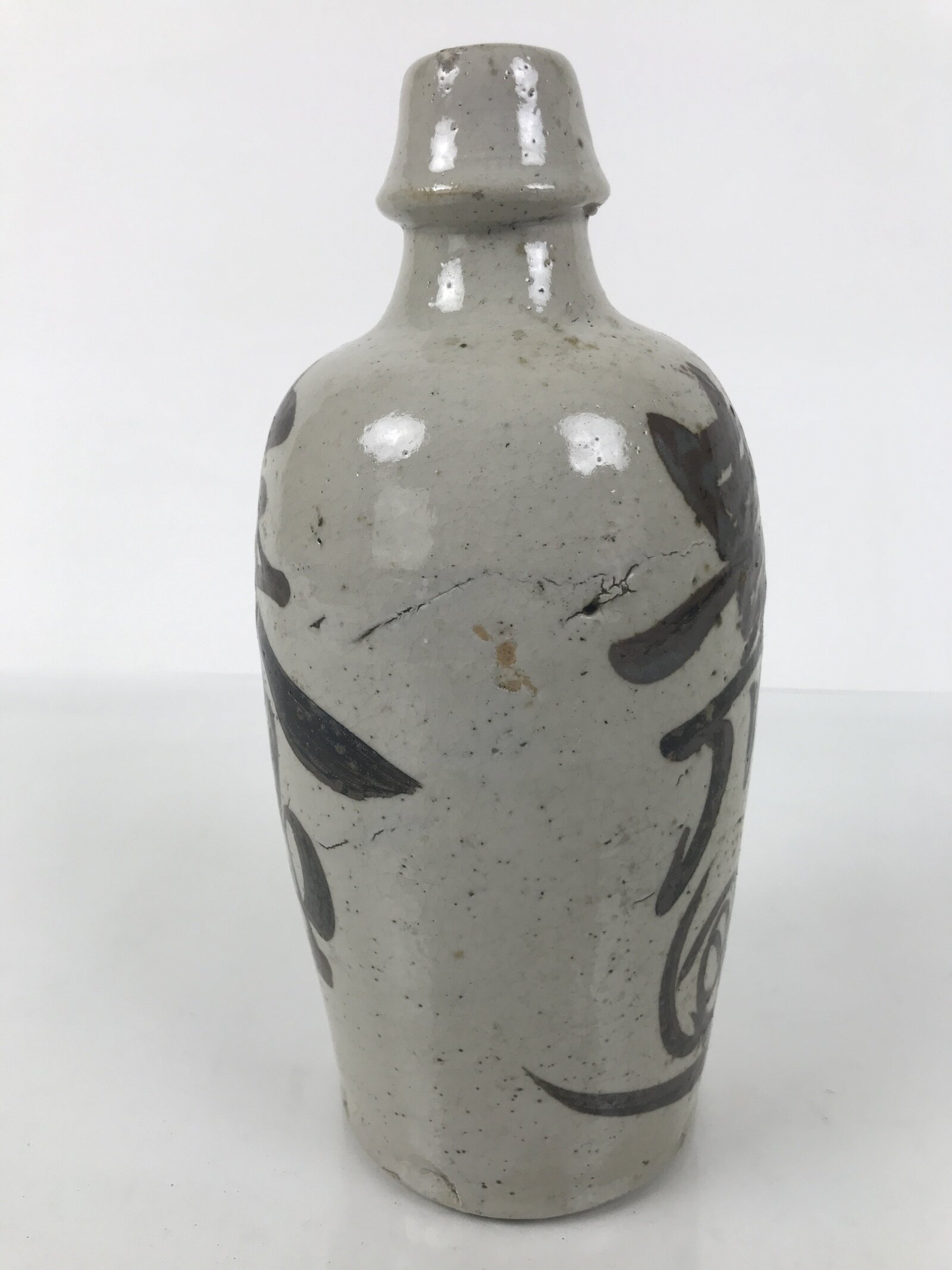 This is a vintage Japanese ceramic sake bottle. It is called a Kayoi-Tokkuri and is used to pour sake. The commuting sake bottle became popular as a rental container for liquor stores in the Edo period when sake began to be consumed daily. This gray bottle has brown lettering.
