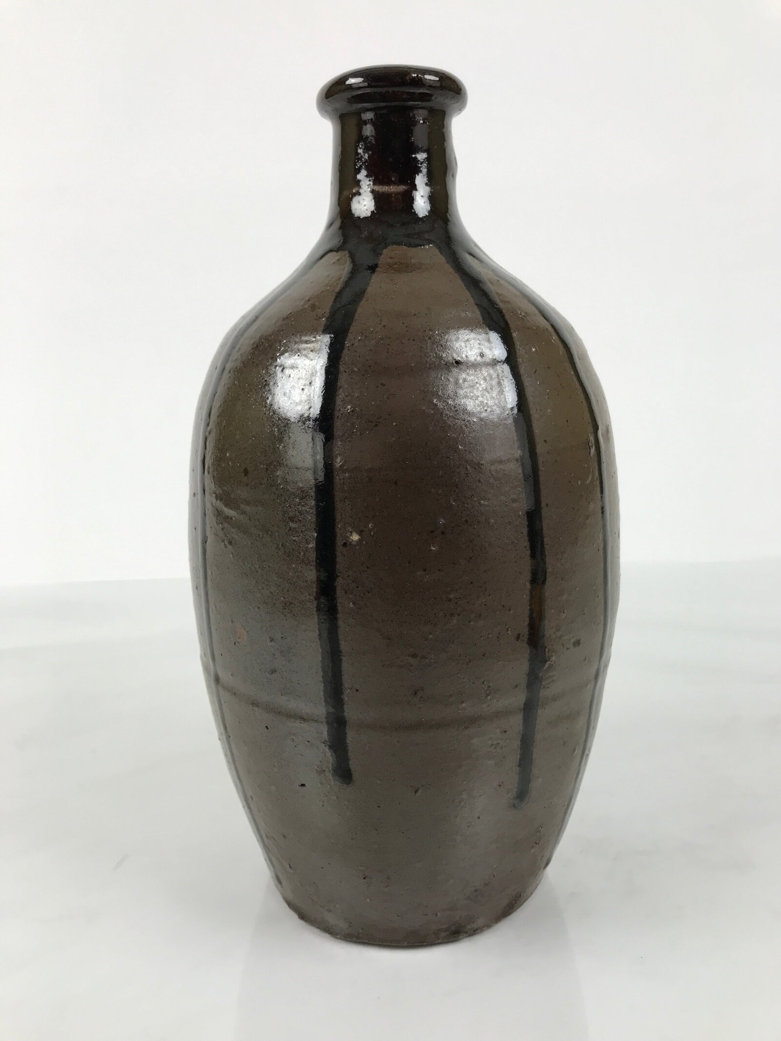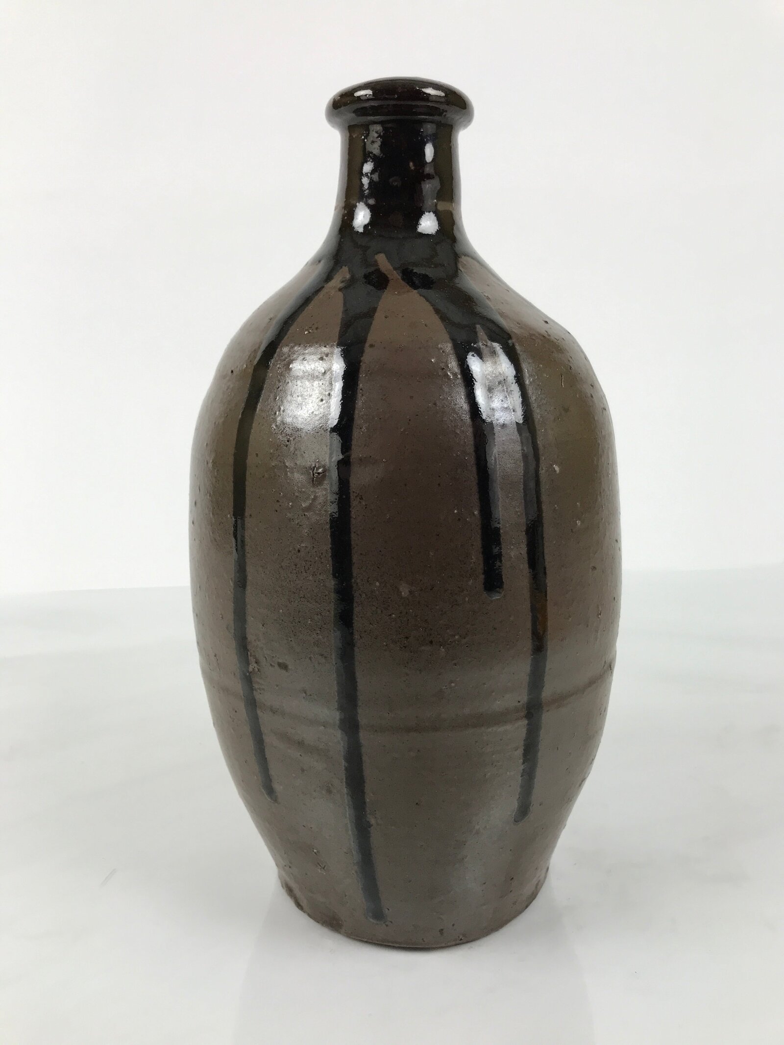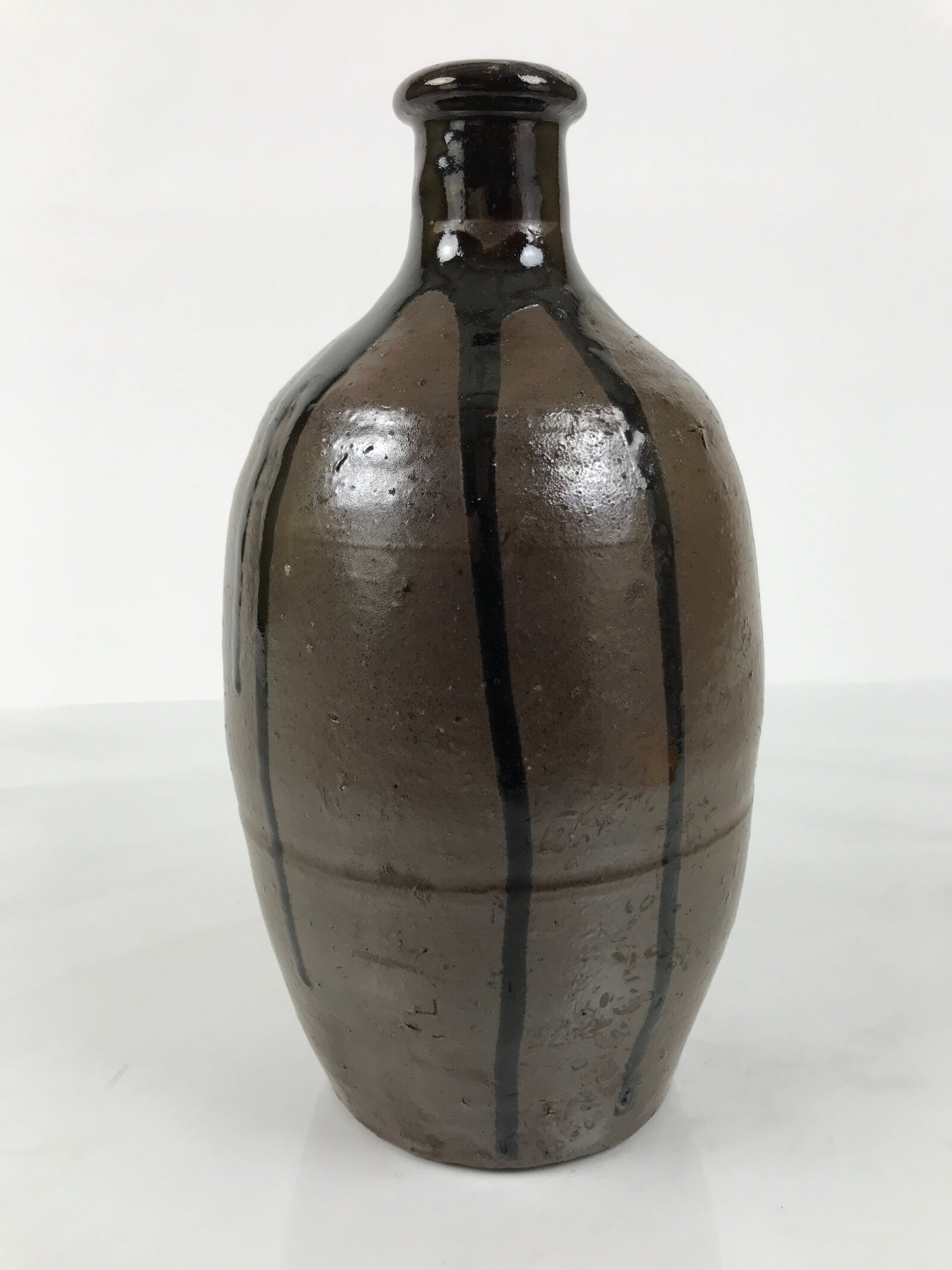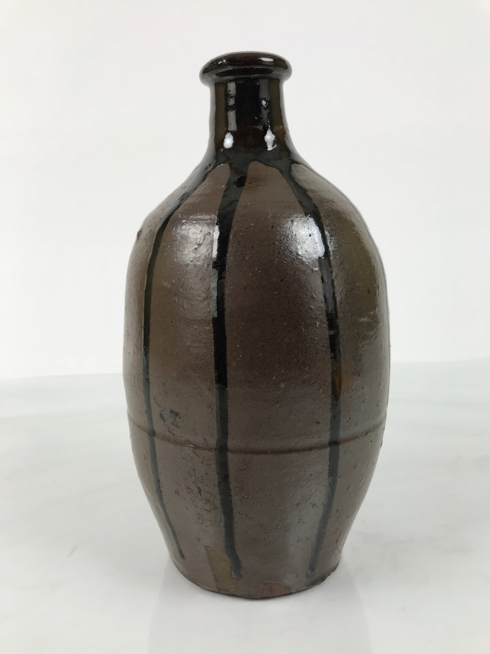This is a vintage Japanese ceramic sake bottle. It is called a Kayoi-Tokkuri and is used to pour sake. The commuting sake bottle became popular as a rental container for liquor stores in the Edo period when sake began to be consumed daily. It is brown and has lines of glossy, melting, darker brown glaze from the rim. The body is round and the neck is thin.