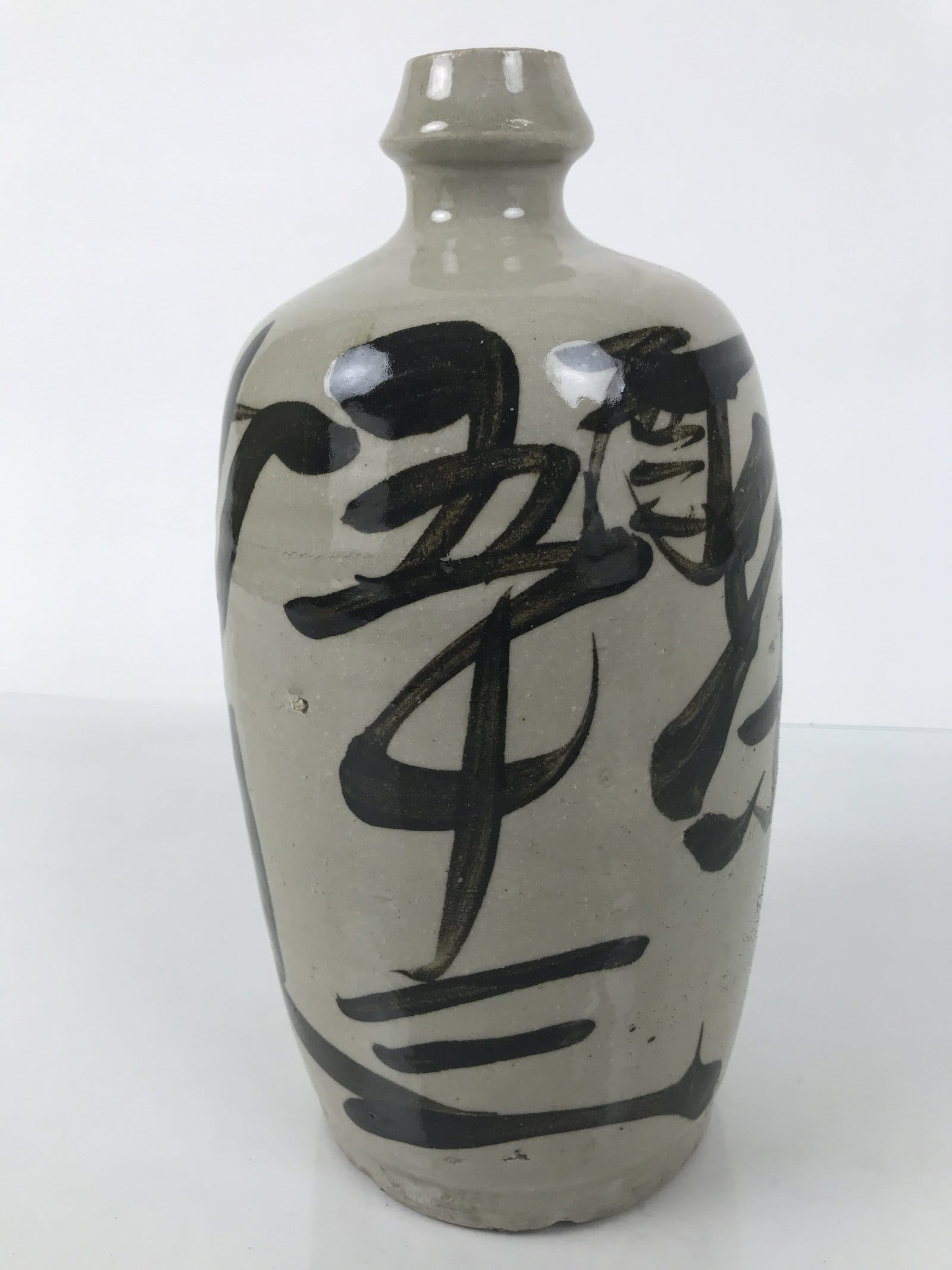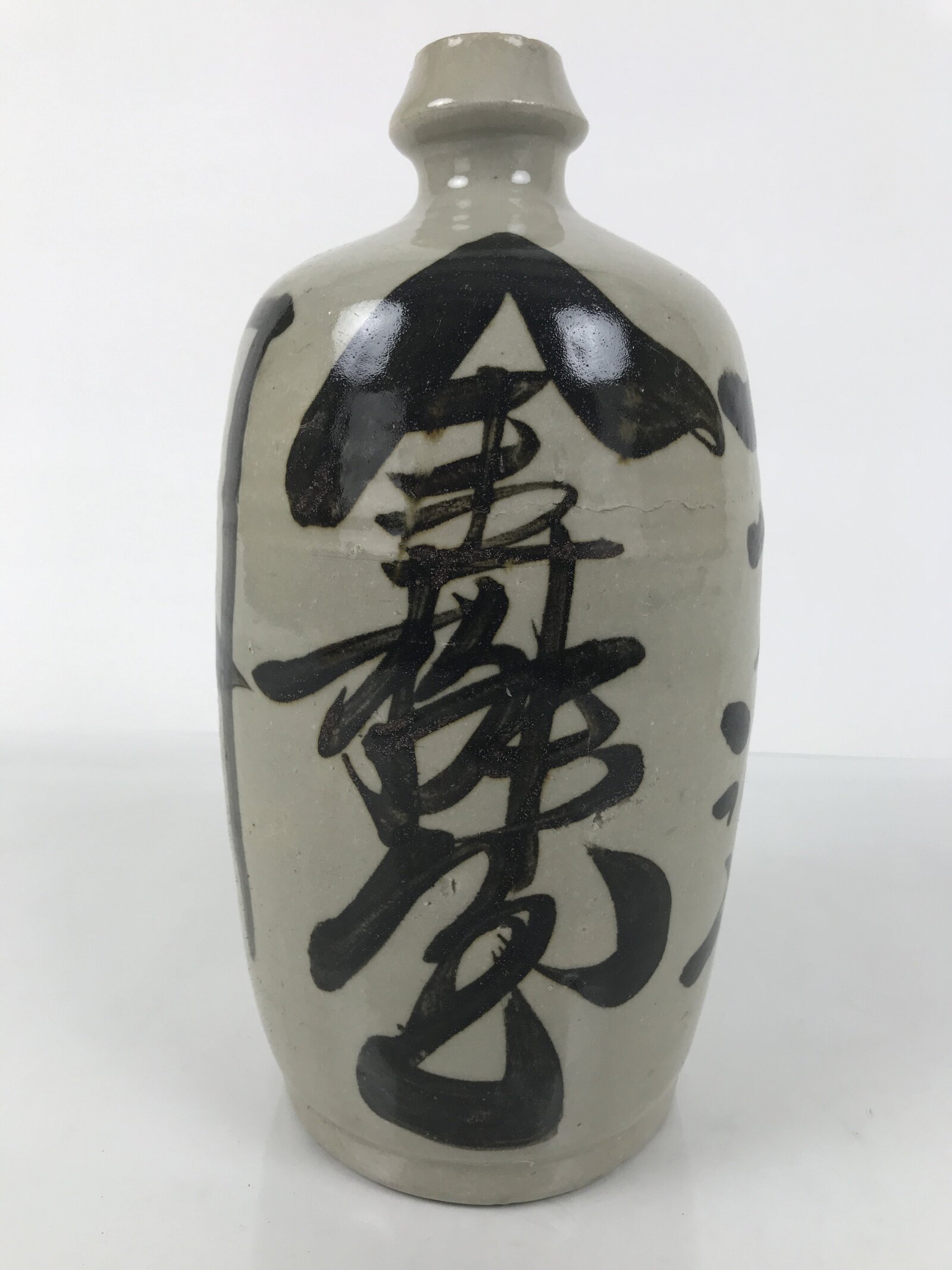 This is a vintage Japanese ceramic sake bottle. It is called a Kayoi-Tokkuri and is used to pour sake. The commuting sake bottle became popular as a rental container for liquor stores in the Edo period when sake began to be consumed daily. This gray bottle has brown lettering.