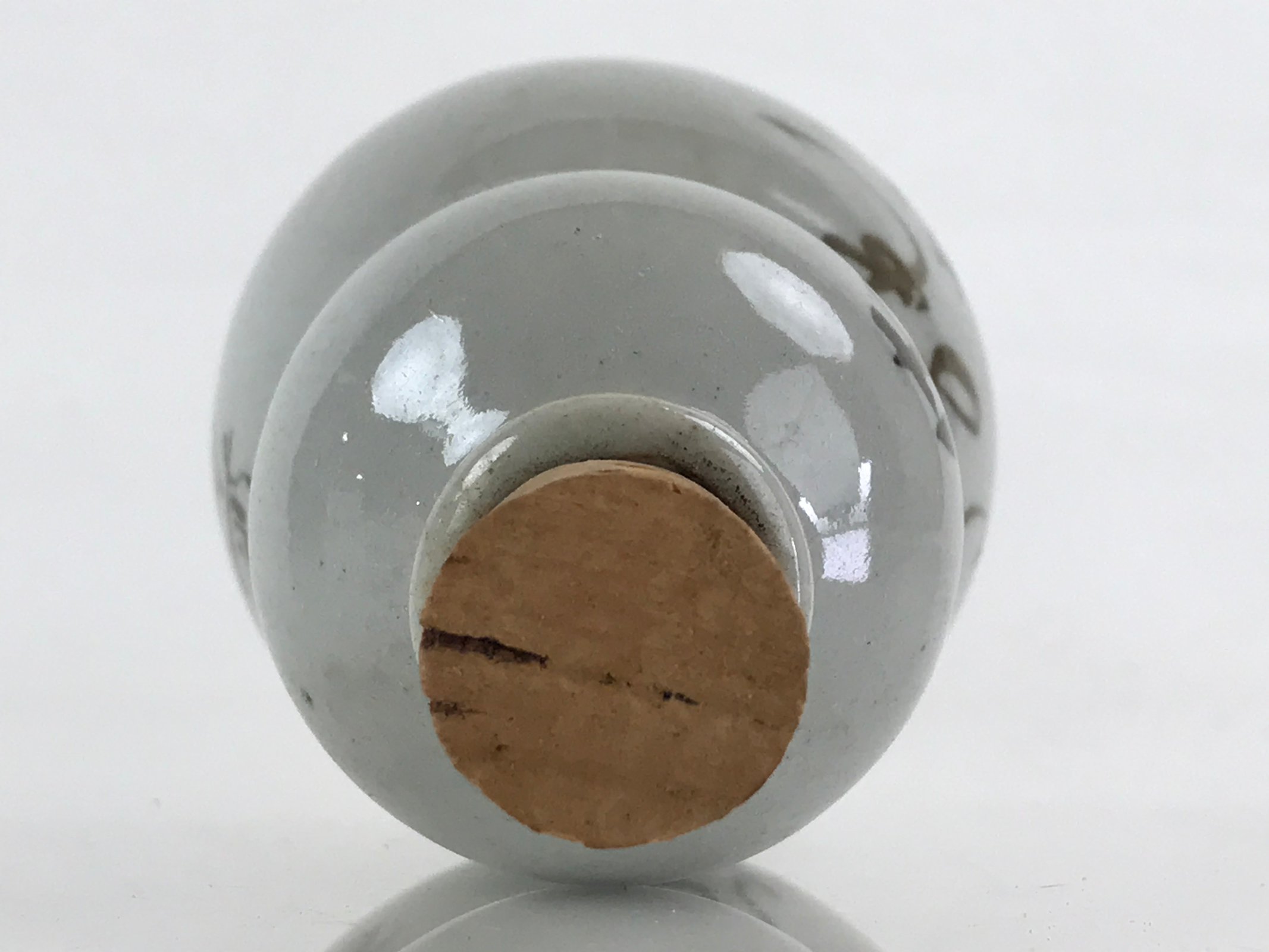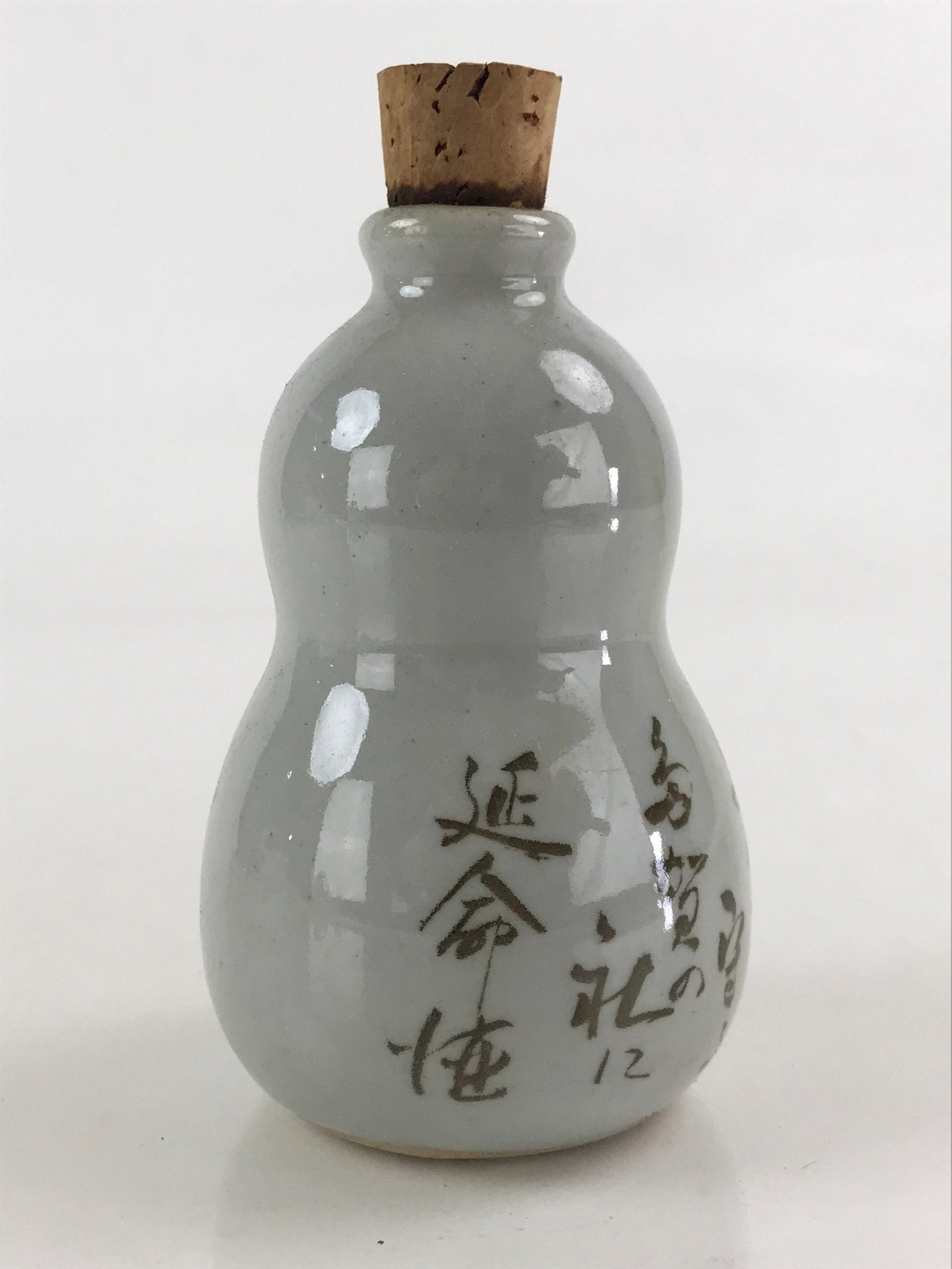 This is a ceramic sake bottle made in Japan. It has a cork stopper on top. It is a gourd-shaped bottle. The bottle has a poem written on it, “Long-life sake that keeps the good days long.” The gourd is known as an auspicious plant in Japan.