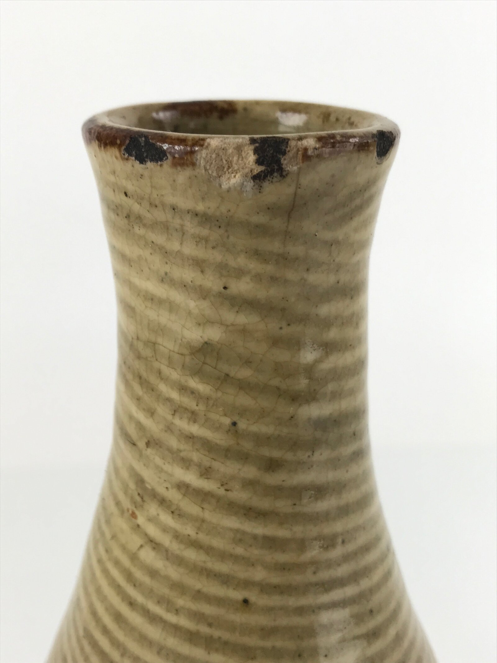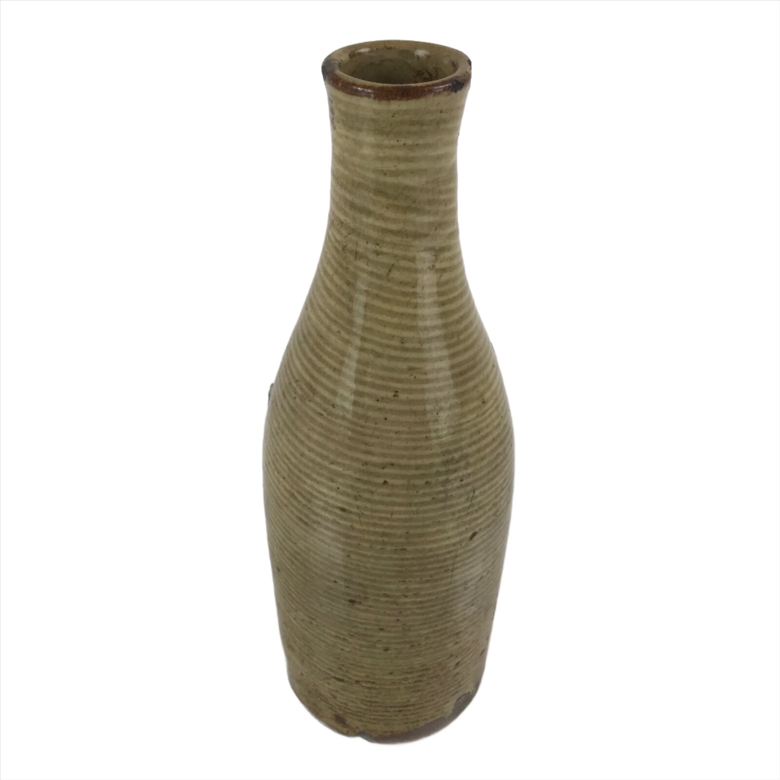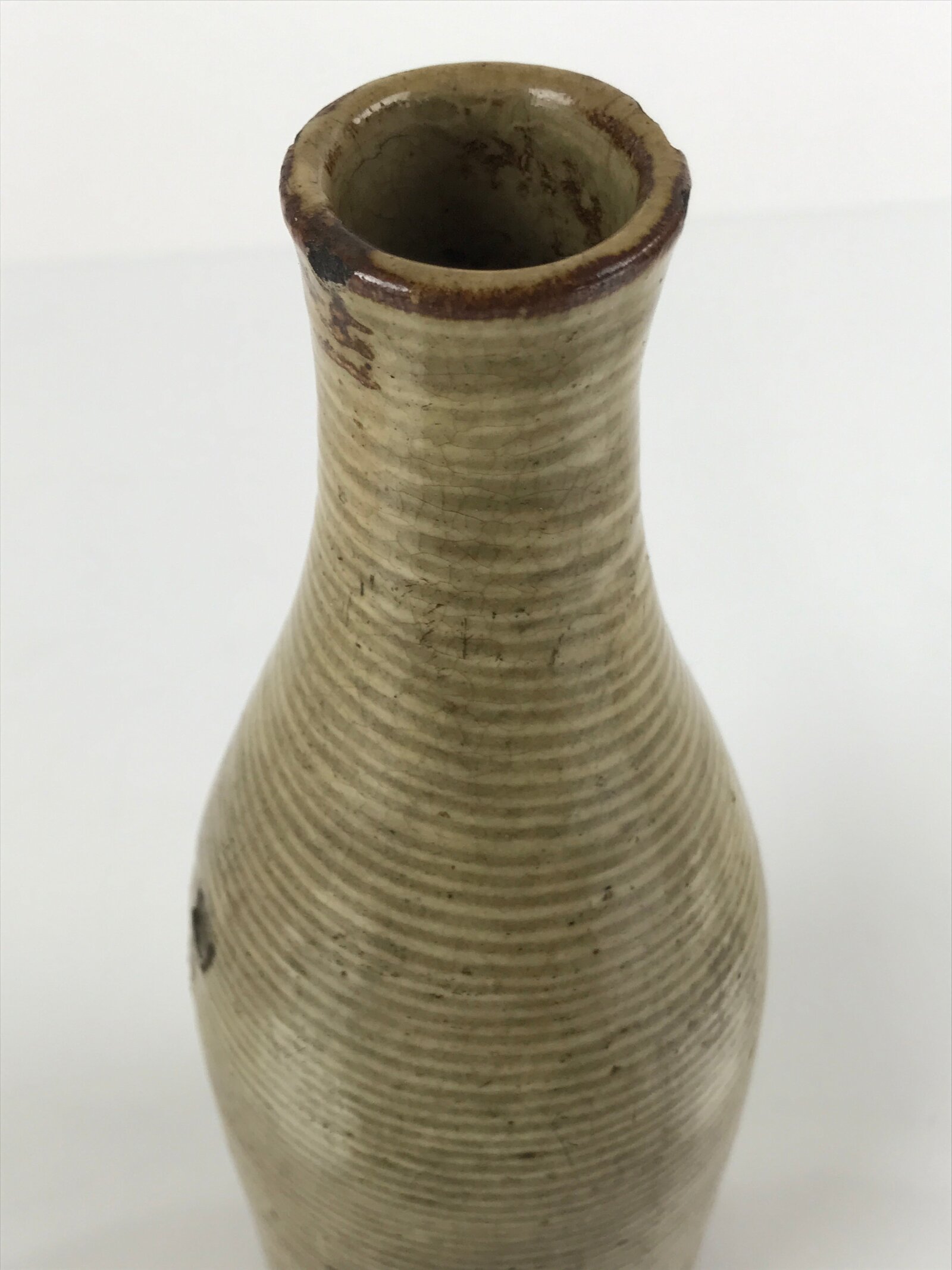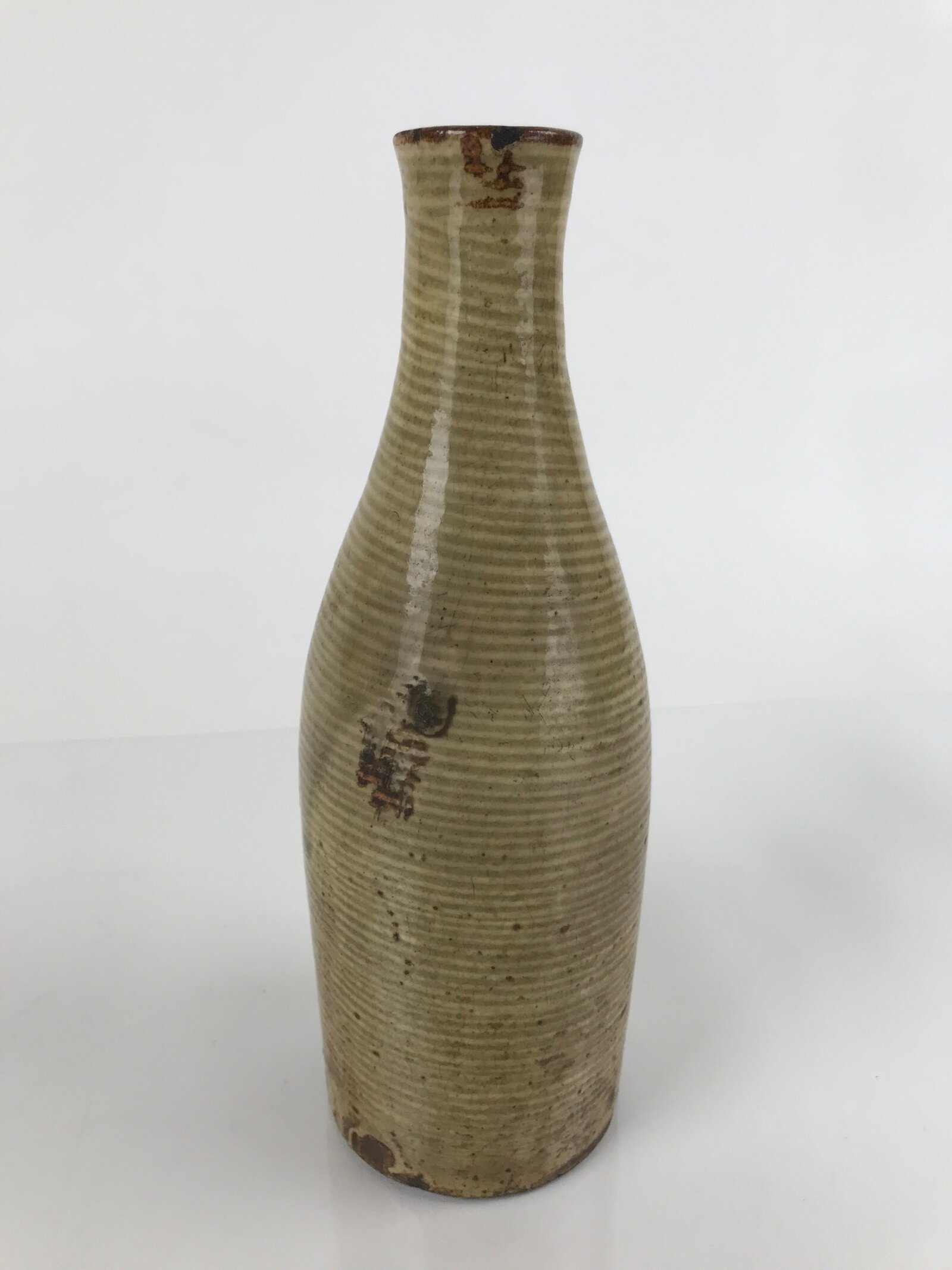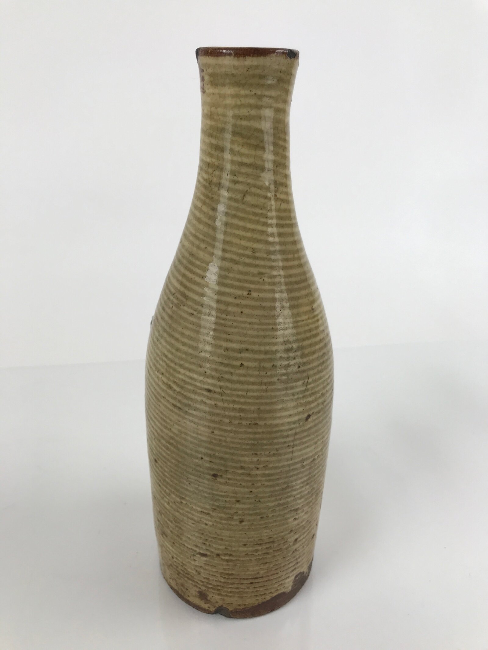 This is an antique Japanese ceramic sake bottle or tokkuri. This ceramic bottle has a very simple ring line design and is a beige and brow color overall. It can be also used for water and other drinks, as a vase, or as a decorative item.