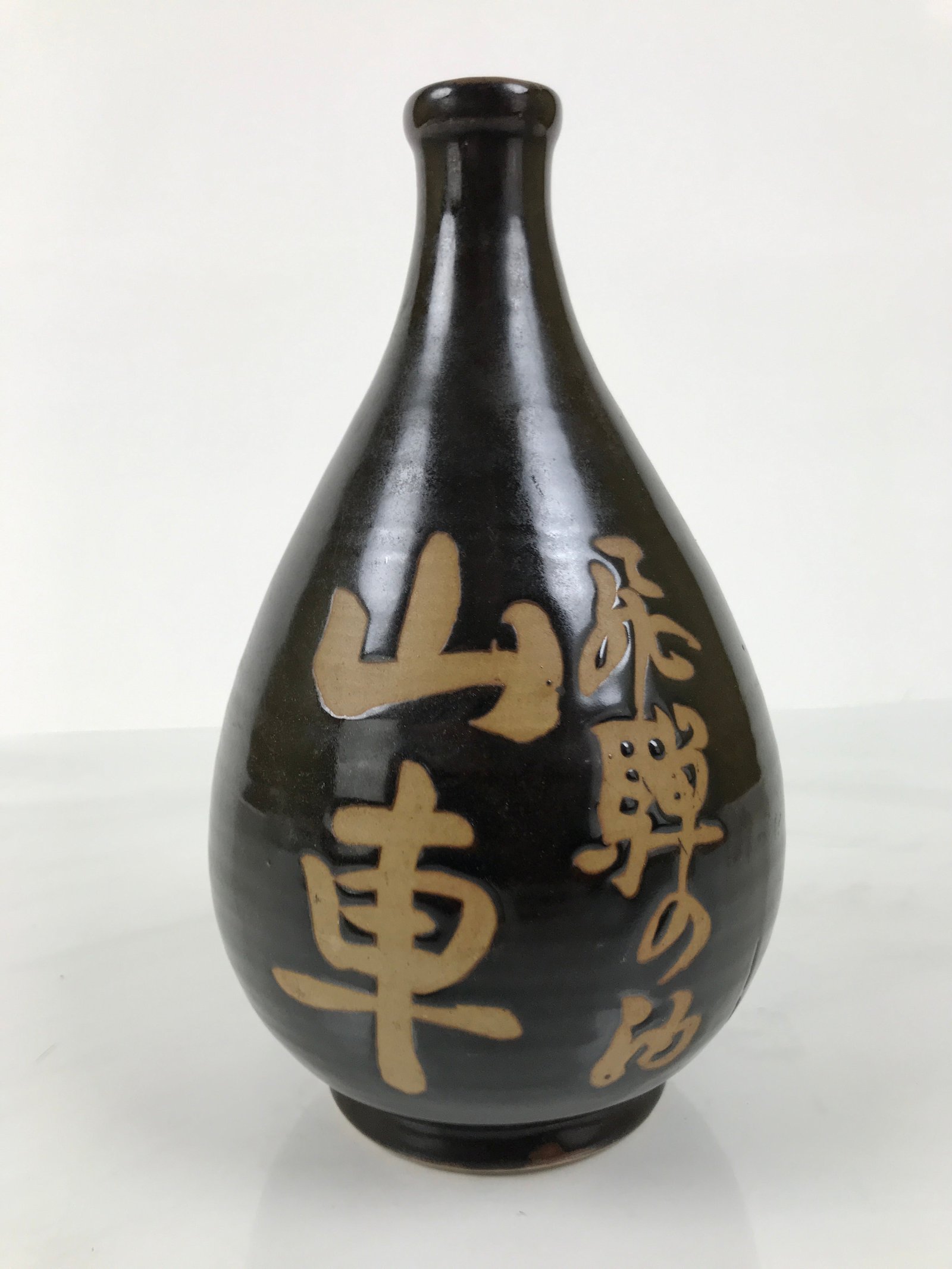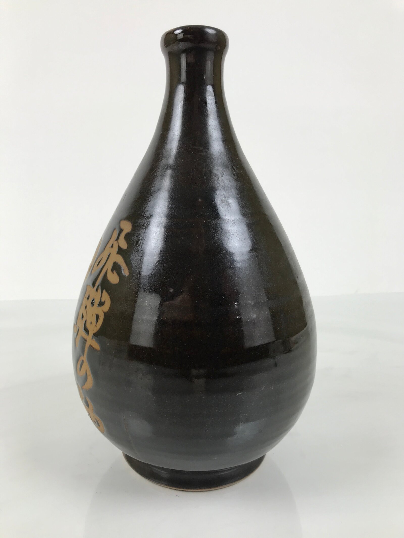 This is a vintage Japanese ceramic sake bottle. It is called a Kayoi-Tokkuri and is used to pour sake. The commuting sake bottle became popular as a rental container for liquor stores in the Edo period when sake began to be consumed daily. It is covered with brown glaze, and the unglazed parts make some characters related to Sake. The body is round, and the neck is long and thin.