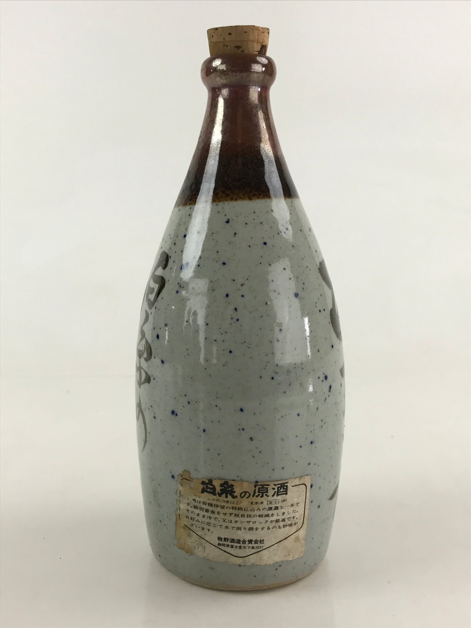 The ceramic sake bottle (Tokkuri). The color is gray with brown letters. It is written as Shiraito’s original sake, Shimizu Port Jirocho. (白糸の原酒、清水港 次郎長) The company’s signature sticker is pasted on the side. Comes with a sake cup and cork. Wakasaki is written on the sake cup.
