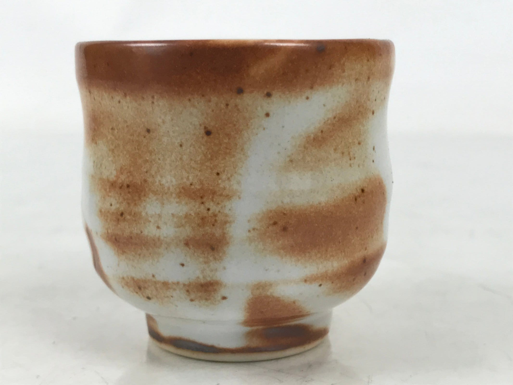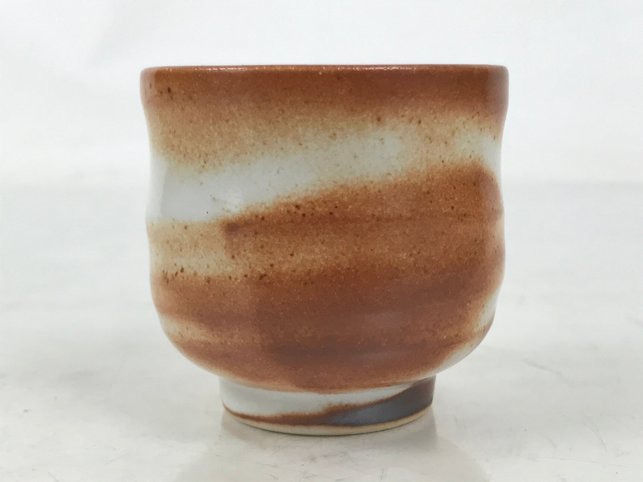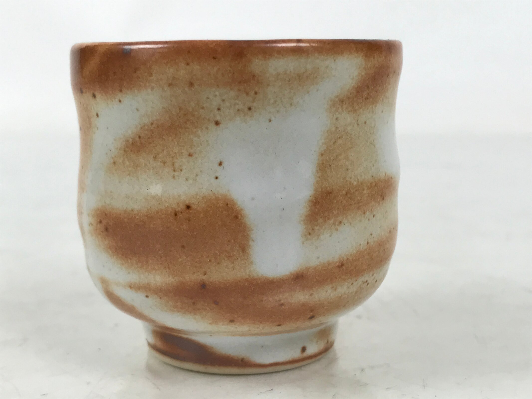 This is a vintage Japanese ceramic sake cup. This particular type of cup is called tsubomi or “bud type” due to its resemblance to a flower bud. In terms of size, it is also called ochoko. It has a brown and white, almost marbled, pattern, similar to Red Shino ware pottery.