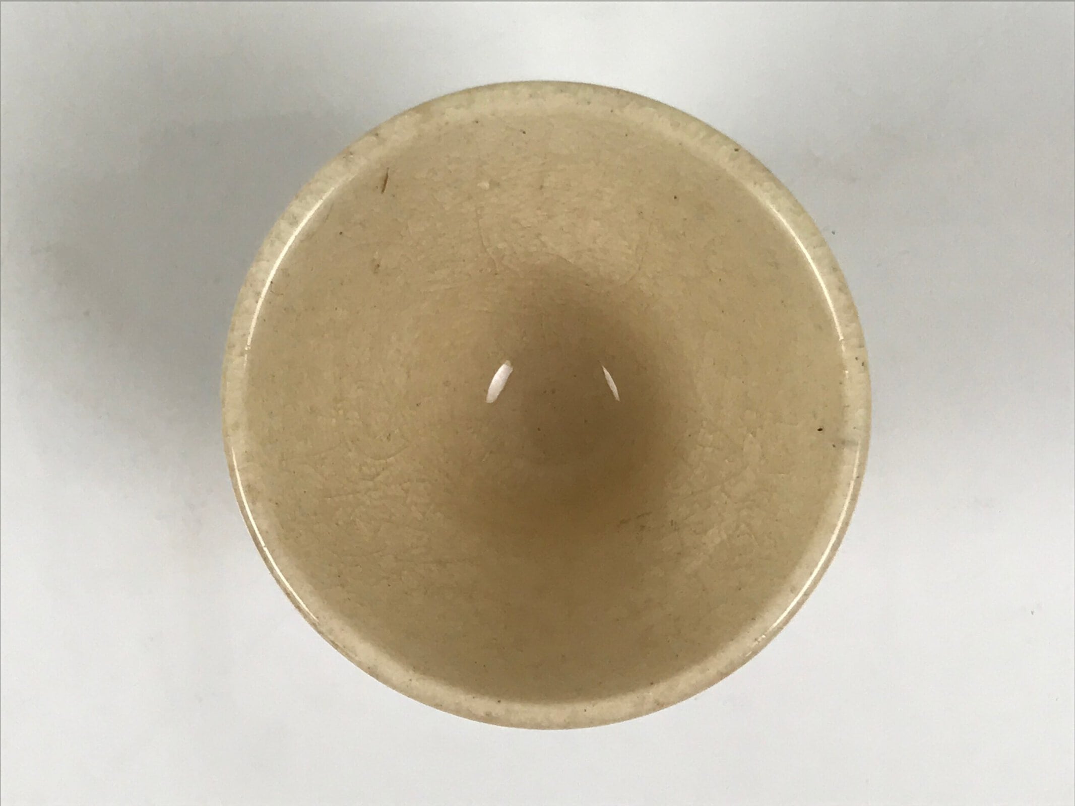 This is a vintage Japanese ceramic sake cup. This particular type of cup is called rappa or “horn type” due to its resemblance to a trumpet or other horn instrument. In terms of size, it is also called ochoko. This is a footed cup with a beige crackled glaze with three brown and blue colored leaves decorating the sides.