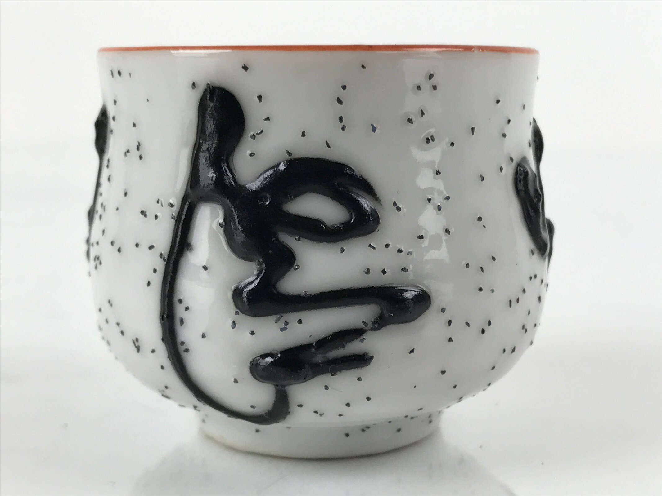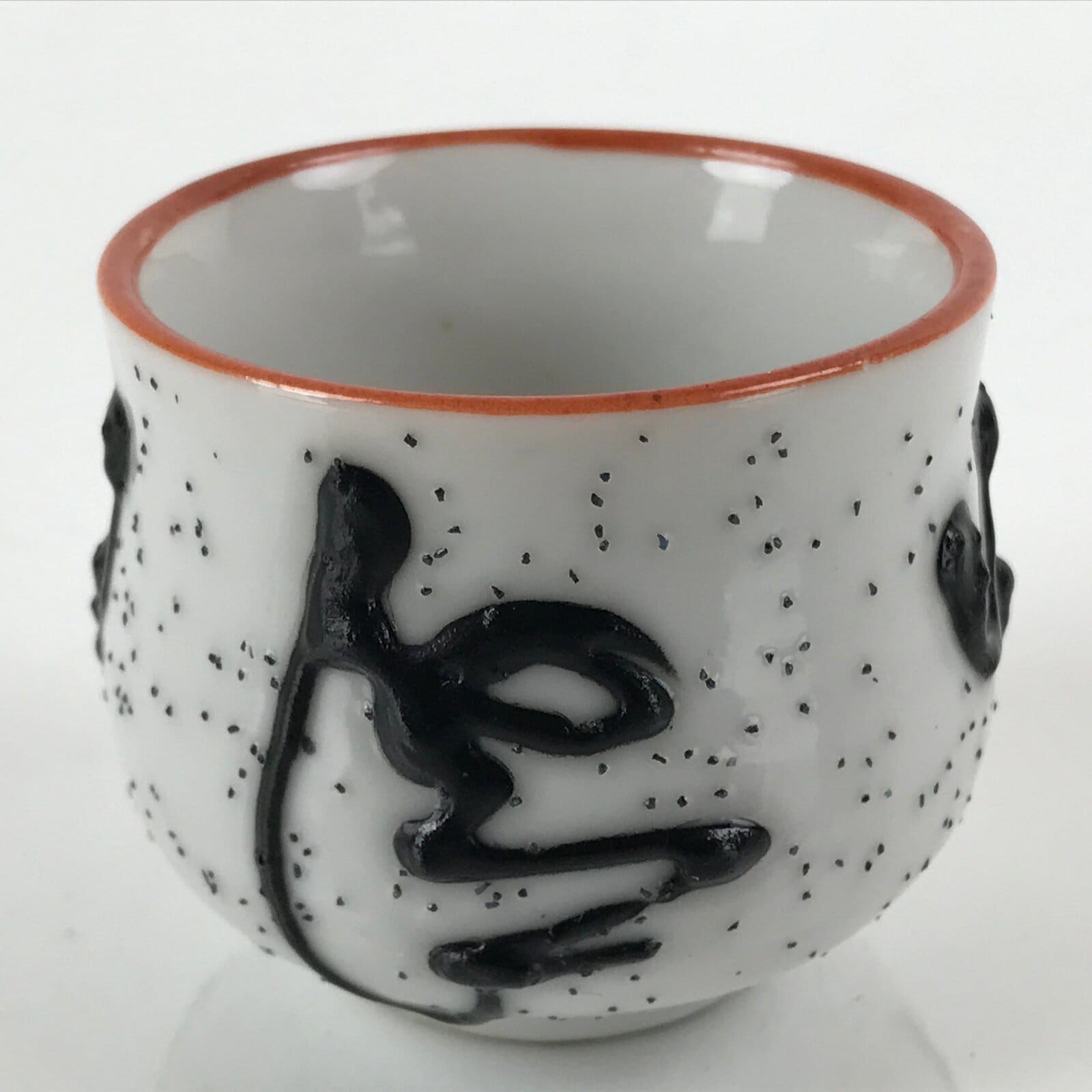 This is a vintage Japanese ceramic sake cup. This particular type of cup is called tsubomi or “bud type” due to its resemblance to a flower bud. In terms of size, it is also called ochoko. This cup is white with black raised specks and has black symbols on the sides. It has a brown rim.