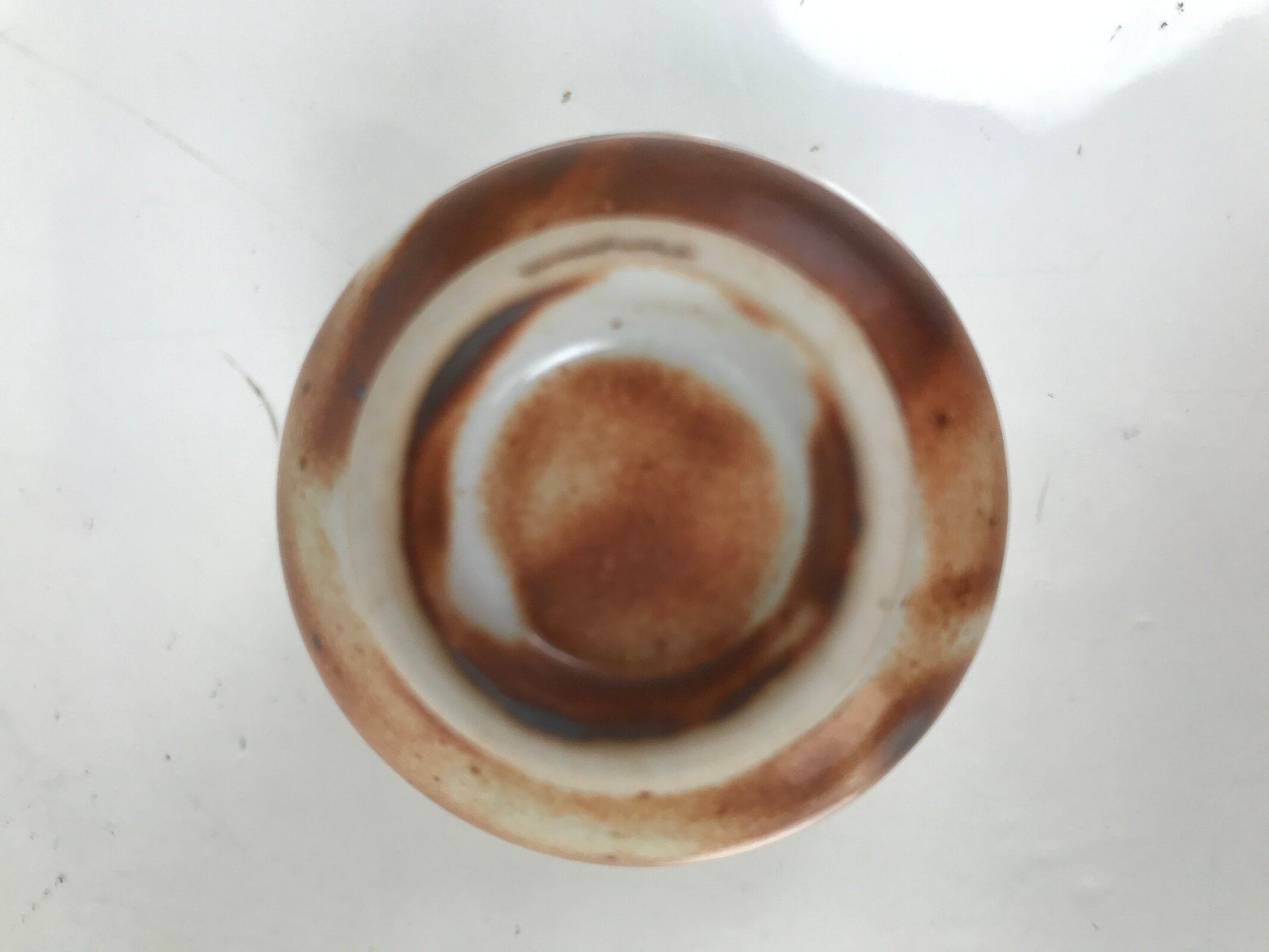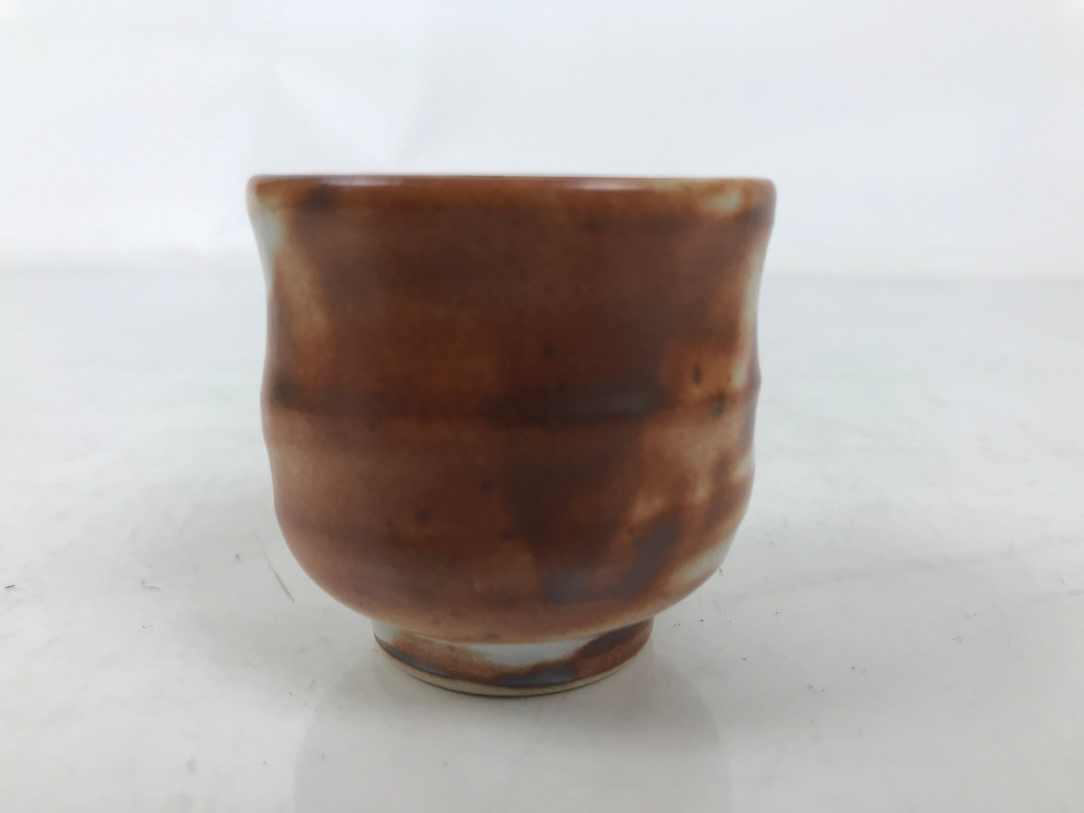 This is a vintage Japanese ceramic sake cup. This particular type of cup is called tsubomi or “bud type” due to its resemblance to a flower bud. In terms of size, it is also called ochoko. It has a brown and white, almost marbled, pattern, similar to Red Shino ware pottery.