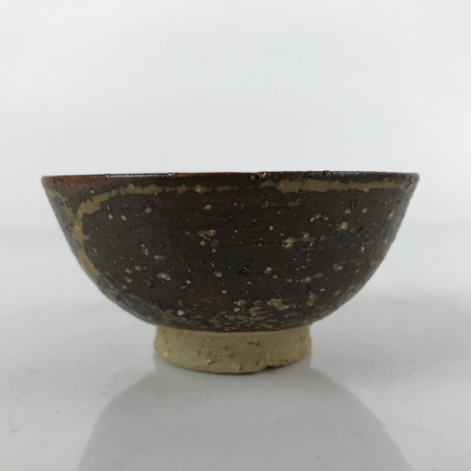 This is a vintage Japanese ceramic sake cup. This particular type of cup is called tsubomi or “bud type” due to its resemblance to a flower bud. In terms of size, it is also called guinomi. This cup is mostly brown with a beige swirl.