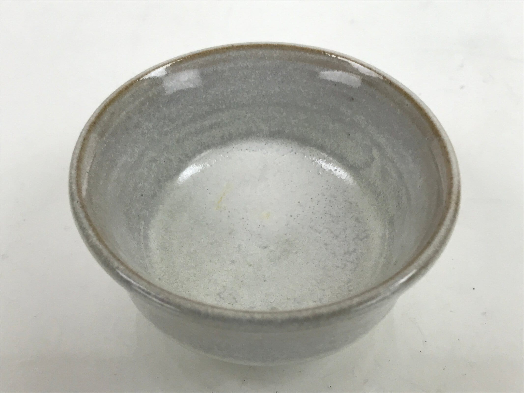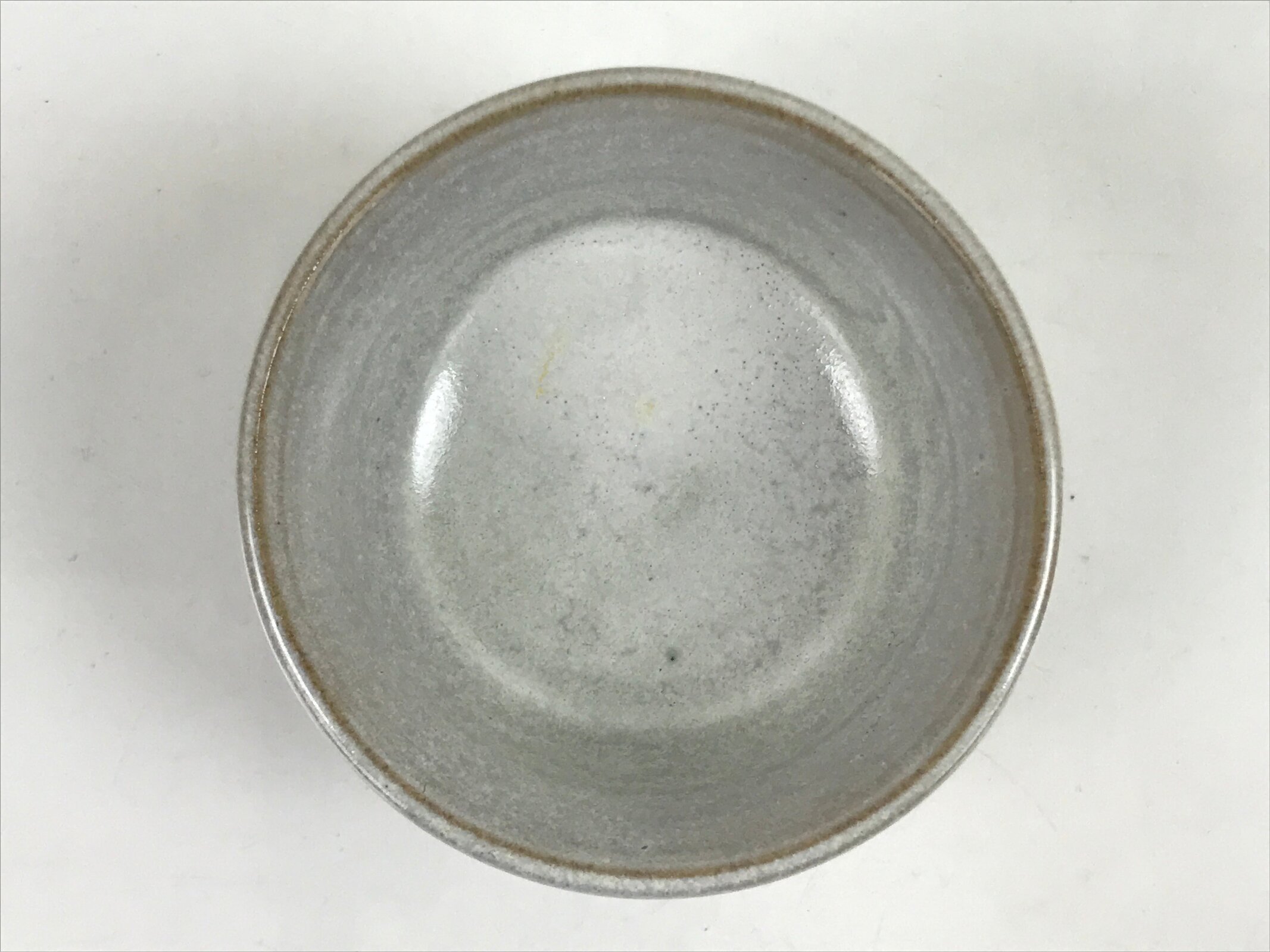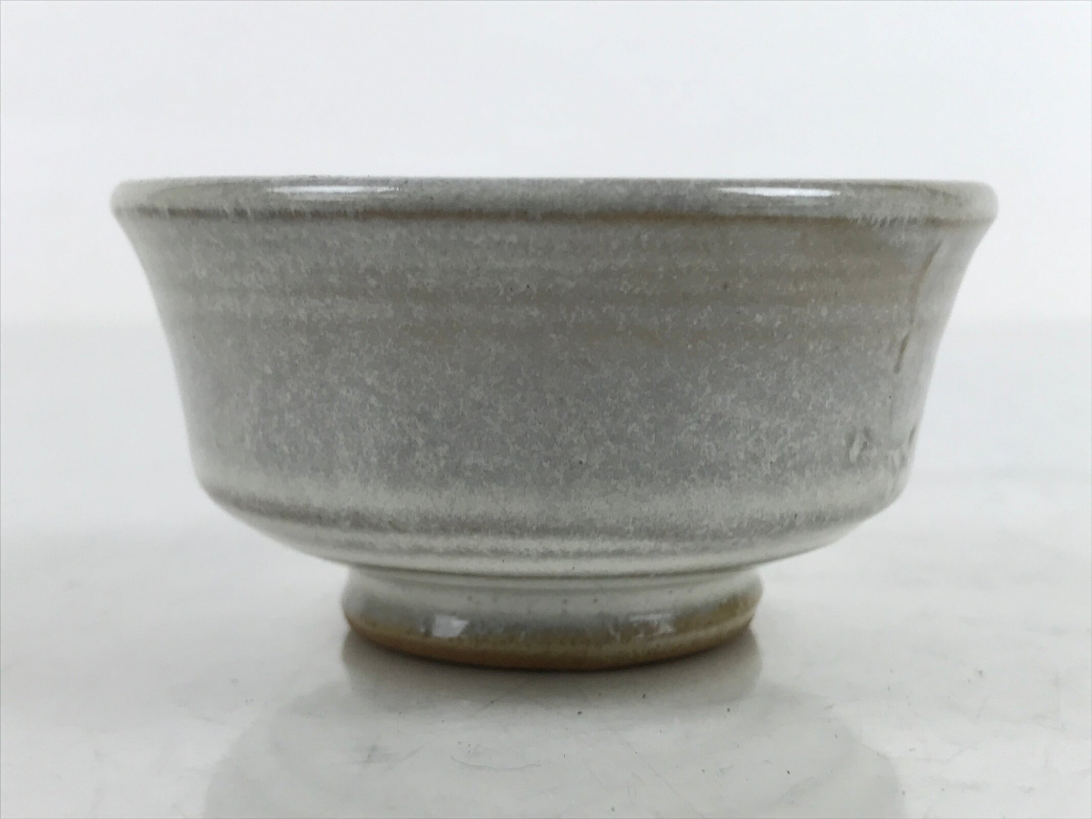 This is a vintage Japanese ceramic sake cup. This particular type of cup is called wan or “bowl type” due to its resemblance to a rice bowl. In terms of size, it is also called guinomi. It has a simple speckled white glaze with no added designs.