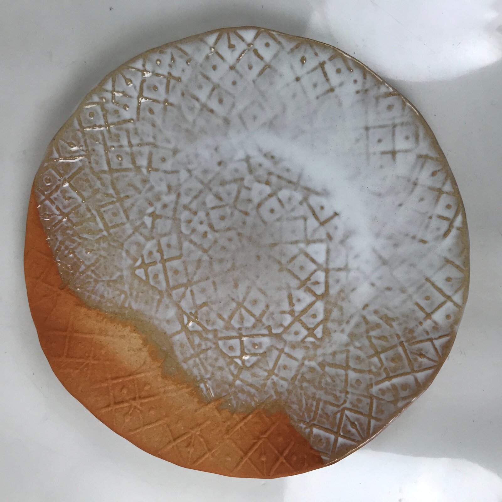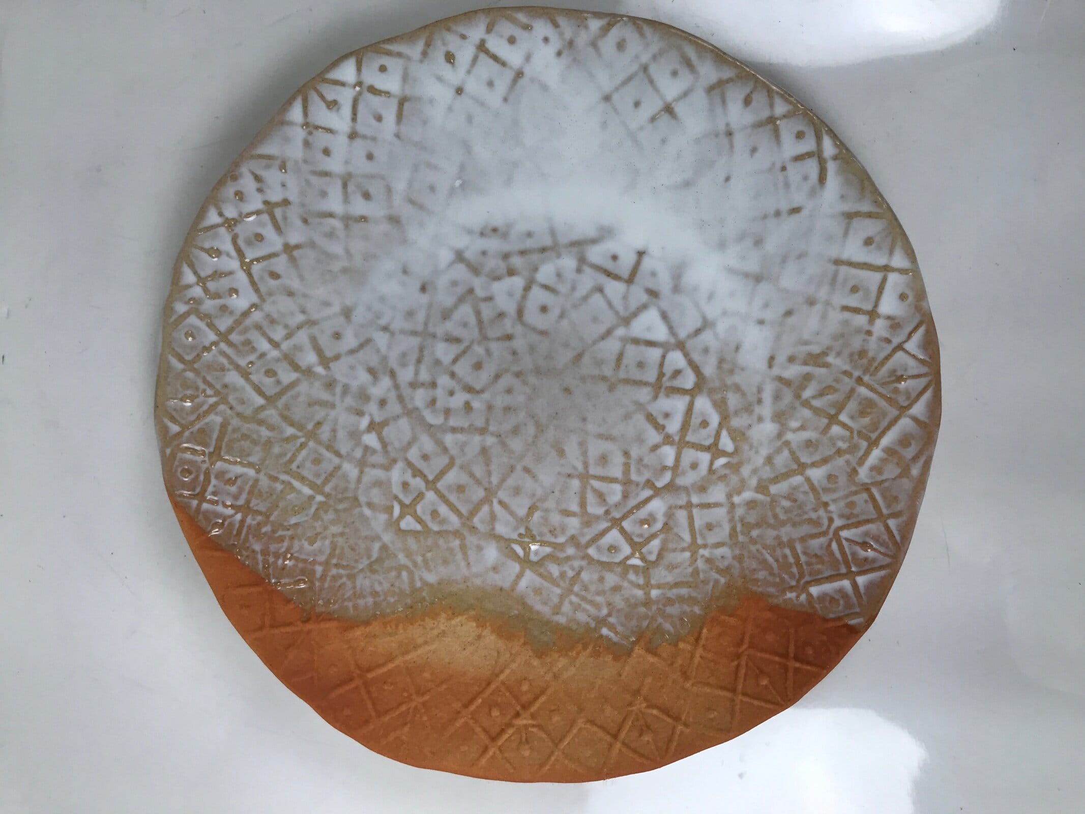This is a vintage Japanese round serving dish in the Hagi-yaki style. Its base is orange, one of the typical colors for Hagi ware. A white glaze covers the part of the inside with random thickness. The inside design is geometric. This round plate is generous in size, and it is signed on the bottom. It comes with the original wooden box.
