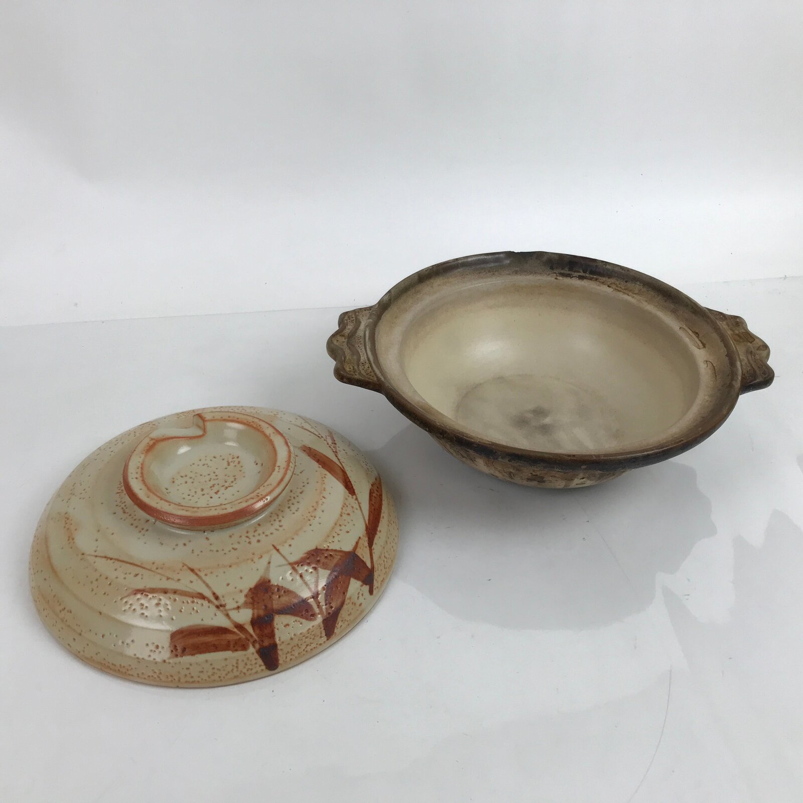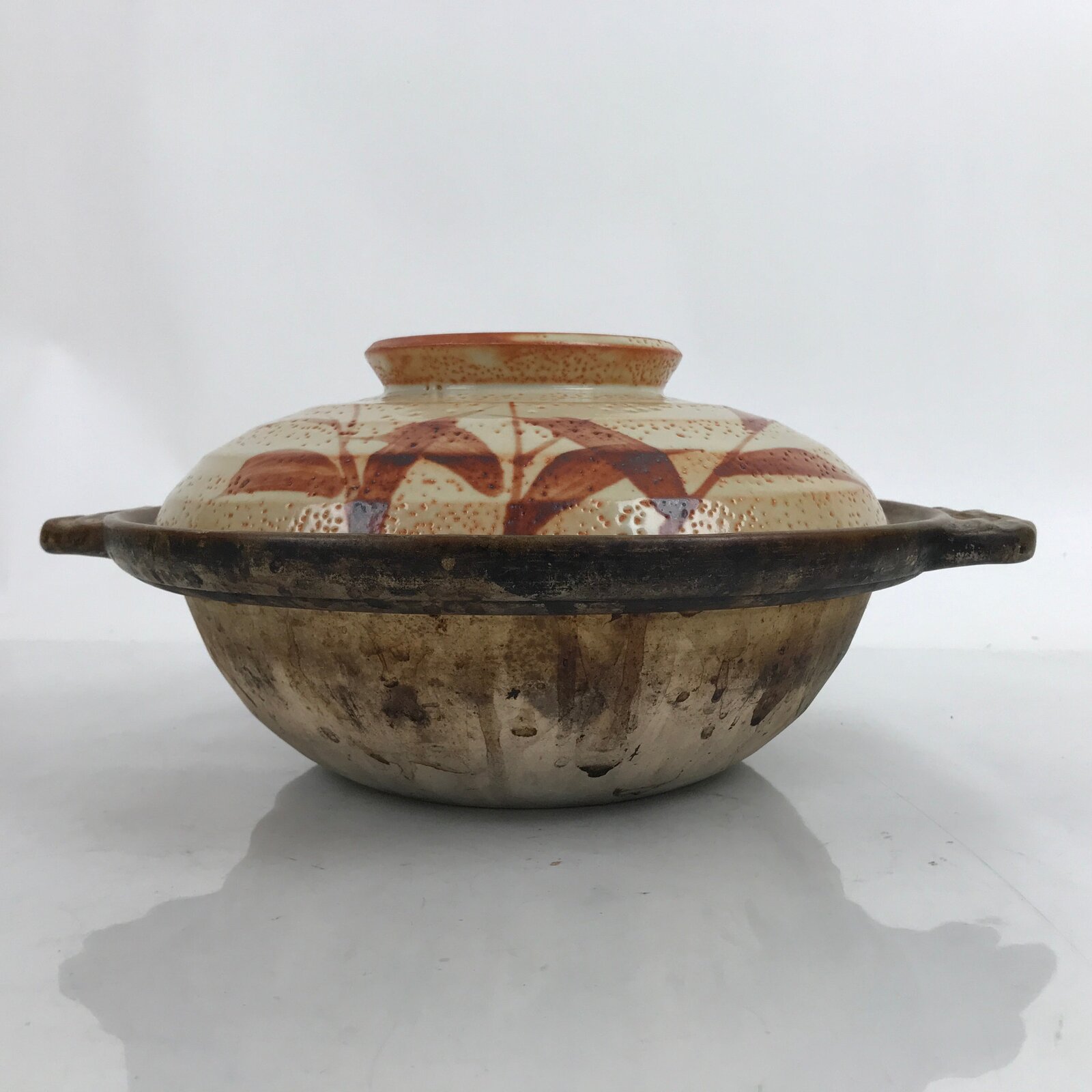 This is a vintage Japanese ceramic nabe pot. Used to cook various hotpot dishes with vegetables, meat, and noodles, this large shallow pot is a dark brown with a shino ware lid in terracotta and beige with a leaf/plant design. It has two wavy handles on the sides for easy transport and a spouted lip on the pot for pouring out liquid. On the lid is a hole for venting steam. This is a popular household item that is used primarily during the winter months and can be used to serve 3-4 people.
