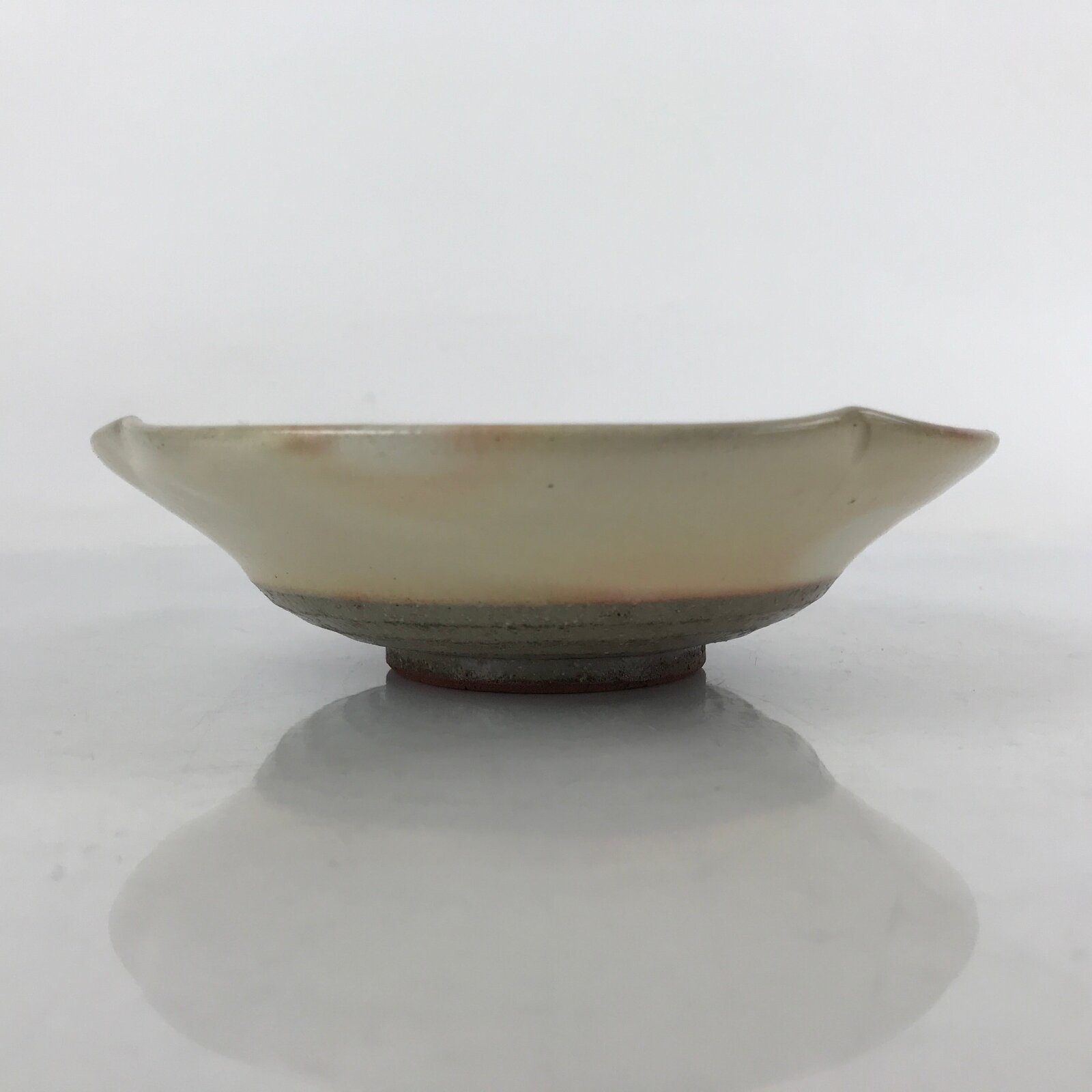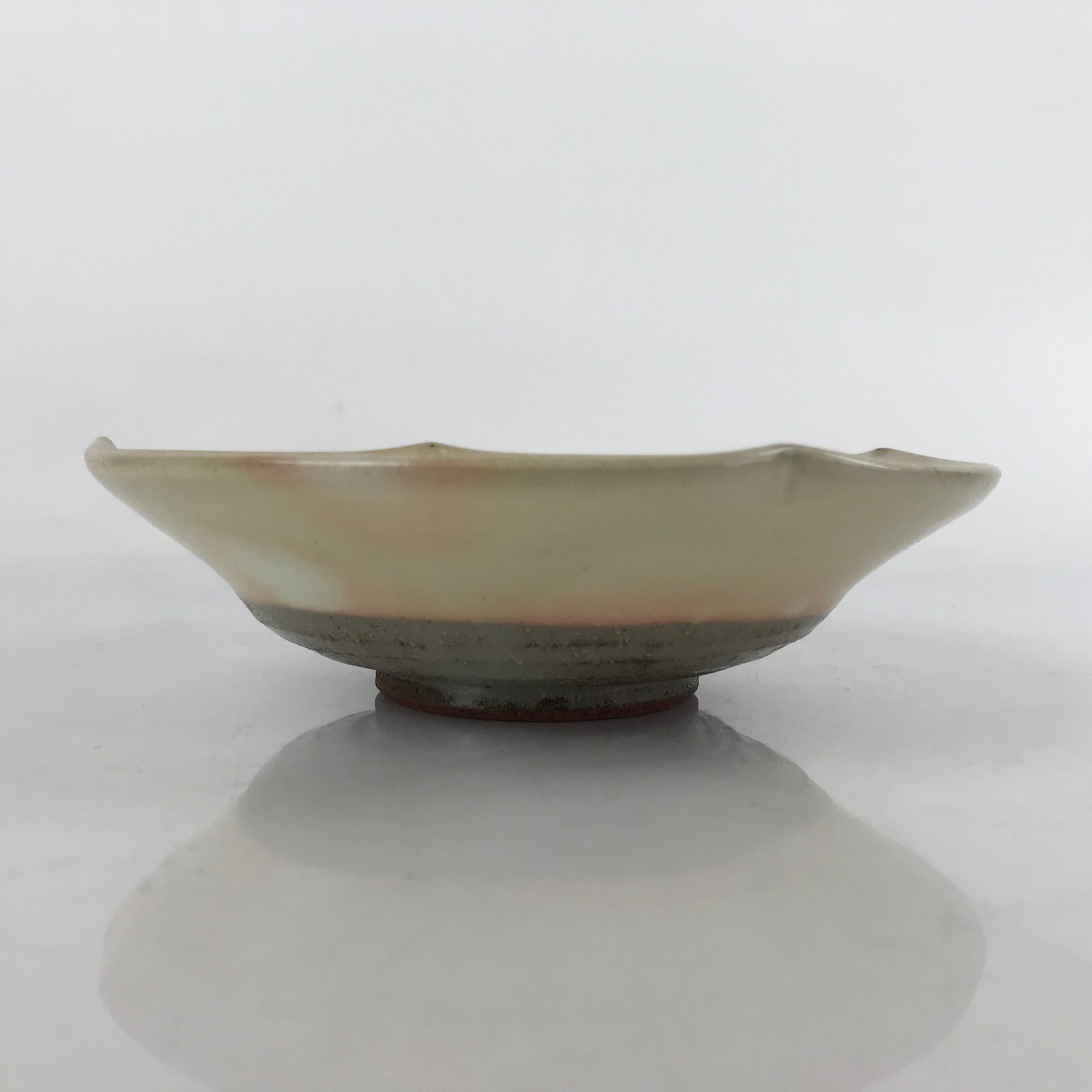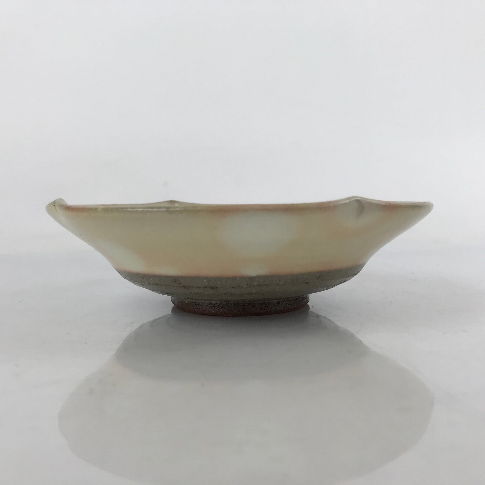 This item is a vintage Japanese ceramic pottery bowl. It is shallow with a beige base and pink bubbles with pine needles. With lightly pinched edges for subtle decoration, this bowl is perfect for side dishes (boiled or steamed vegetables, tofu, etc) or for desserts. There is a maker’s stamp on the bottom.