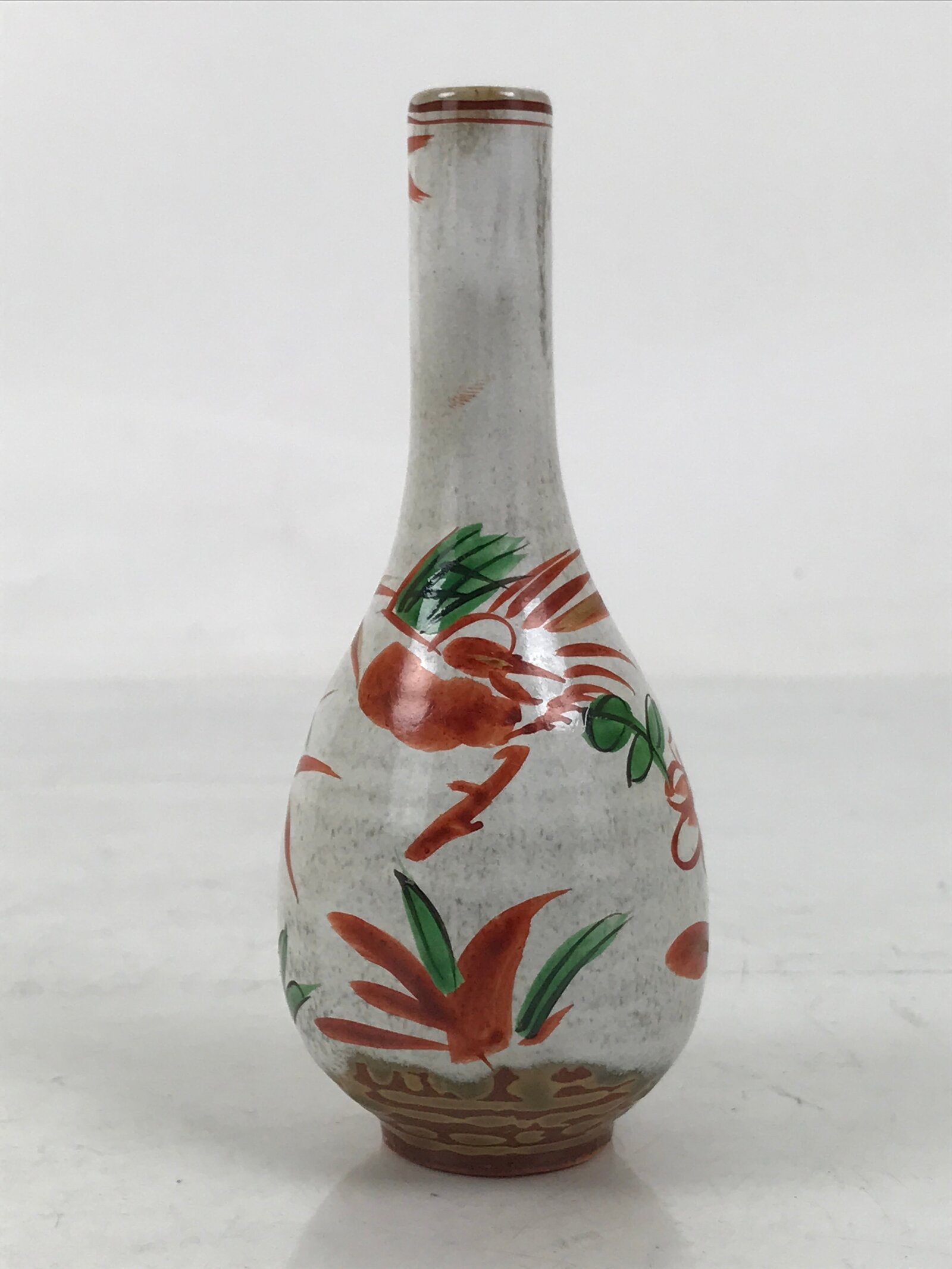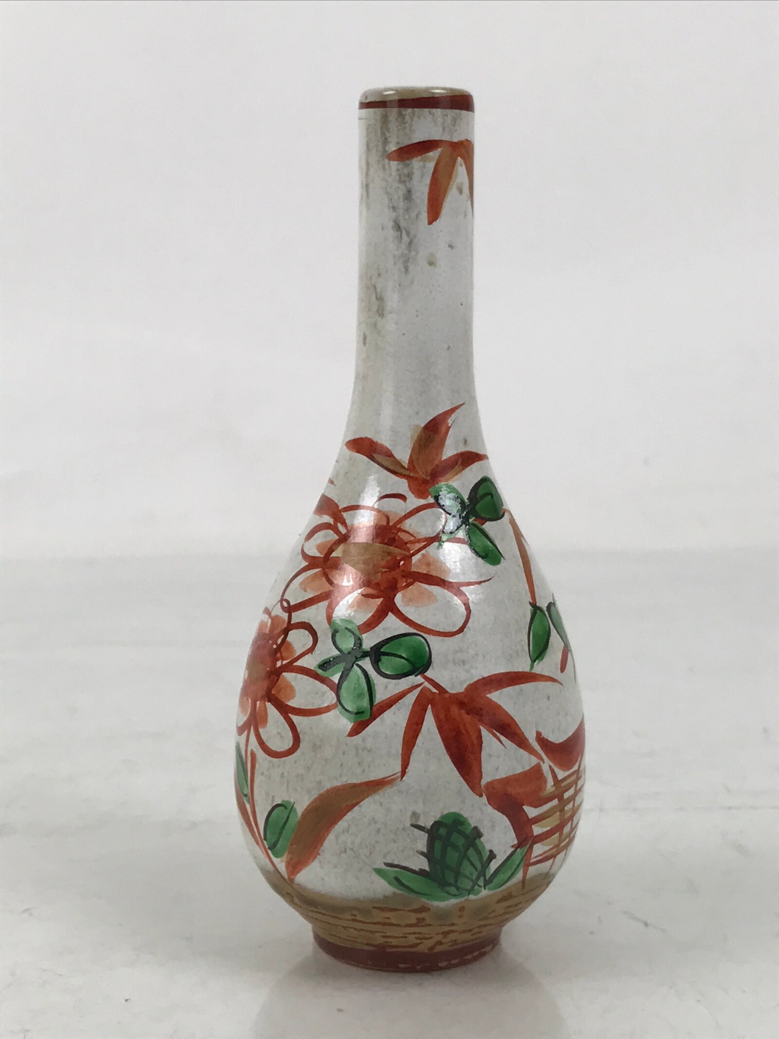 This is a vintage Japanese ceramic flower vase, or kabin. It features a painting that is mostly red, called Akae. Reddish brown and ash glaze is shown around the bottom and under the Akae. Another feature of this vase, a long neck, is called a crane neck. There is a sign at the bottom. This is small enough for a single flower (ichirin zashi).