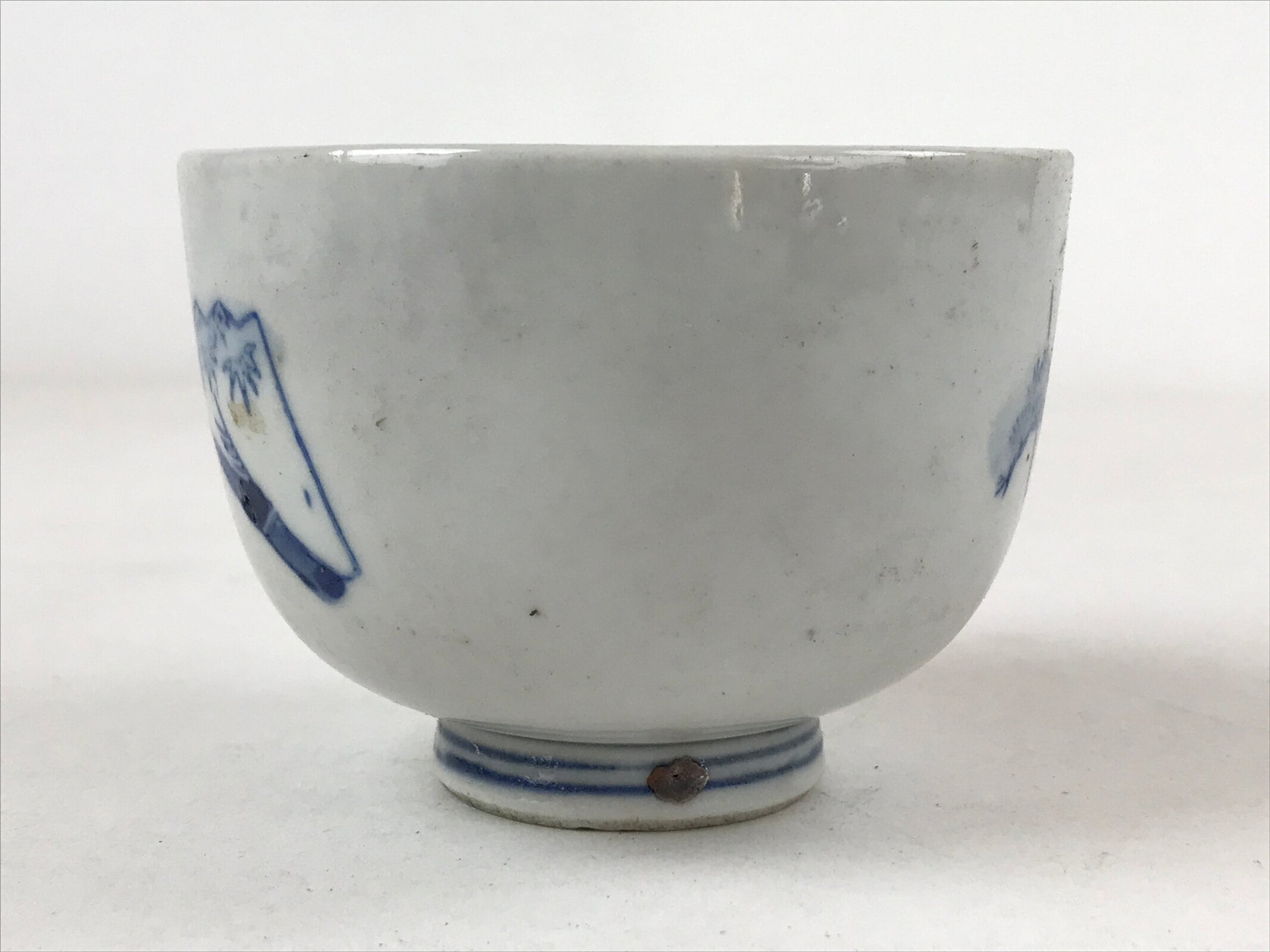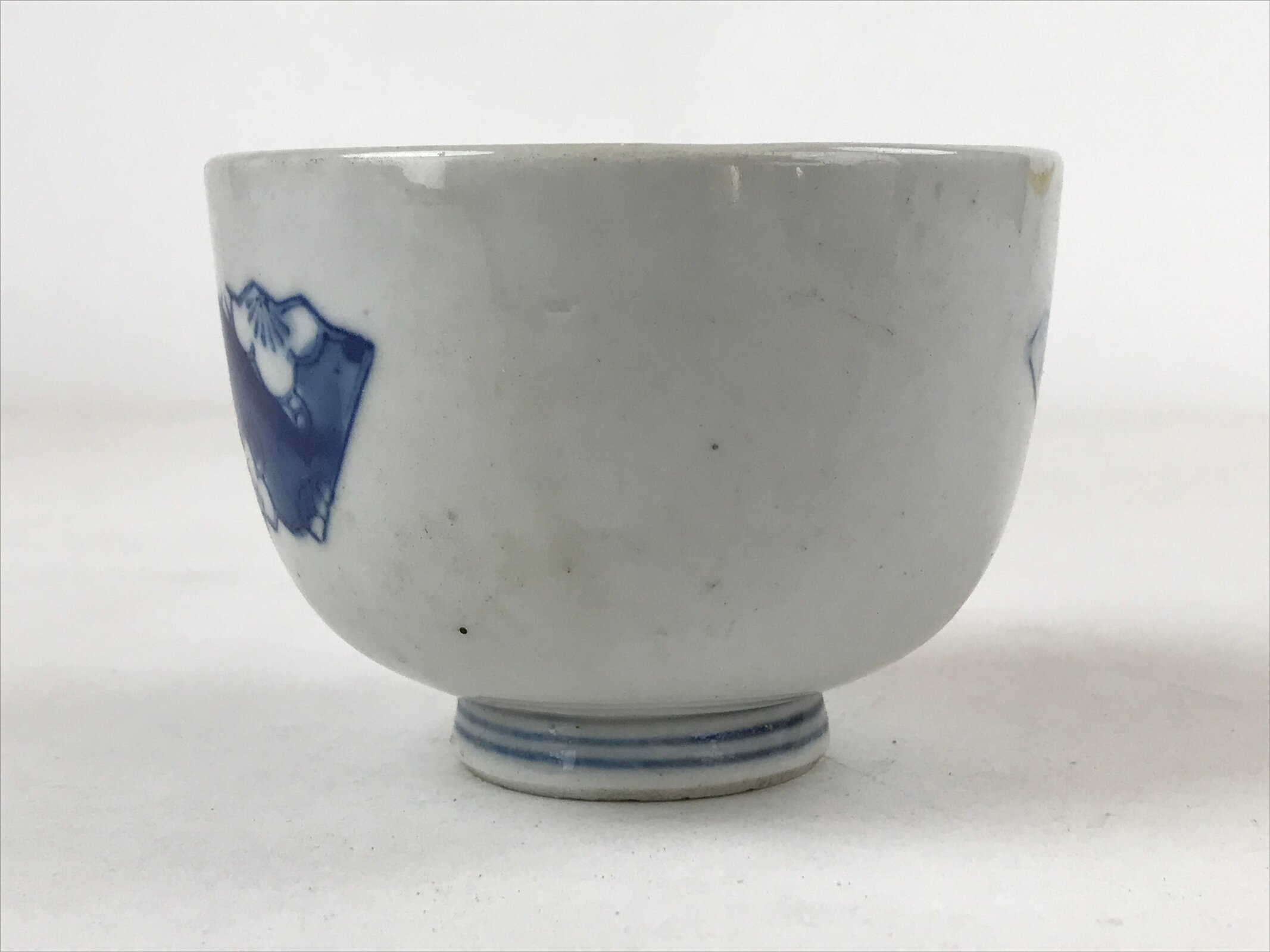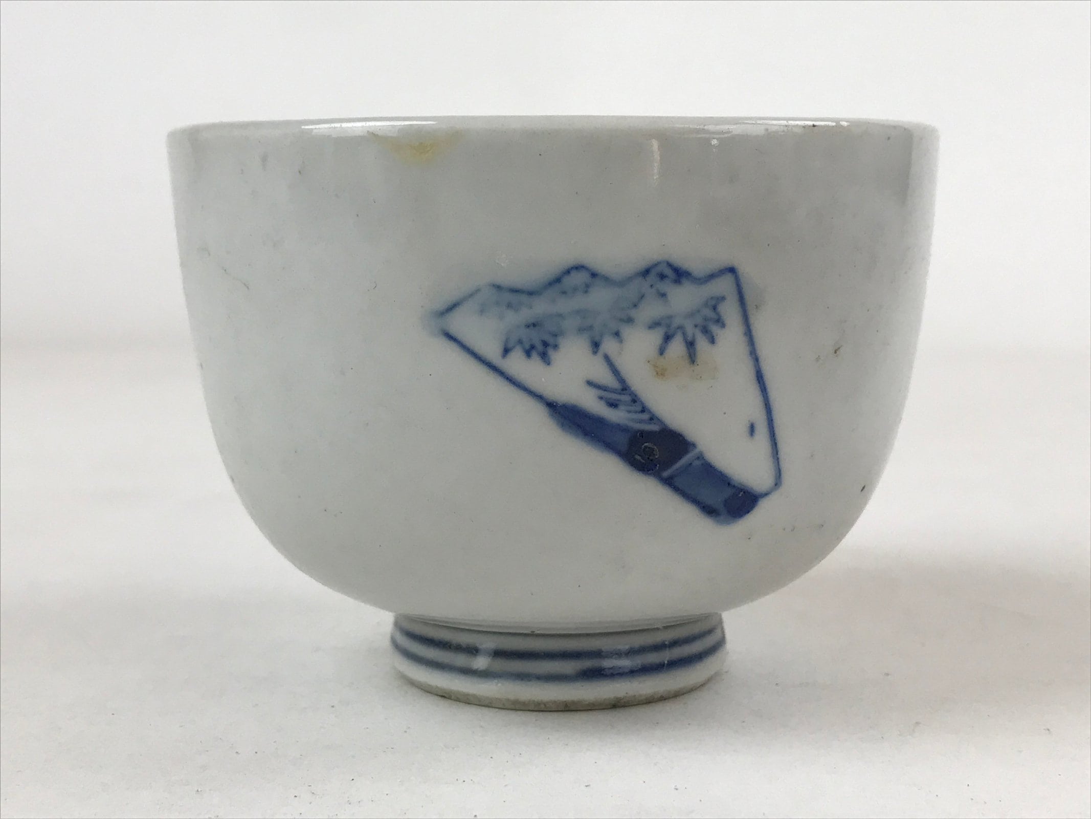 This is a vintage Japanese ceramic small bowl or tea cup. This cup is white and has a blue design on the front representing folding fans with a pine tree pattern and a cherry blossom pattern. There are blue horizontal lines on the base of the cup.