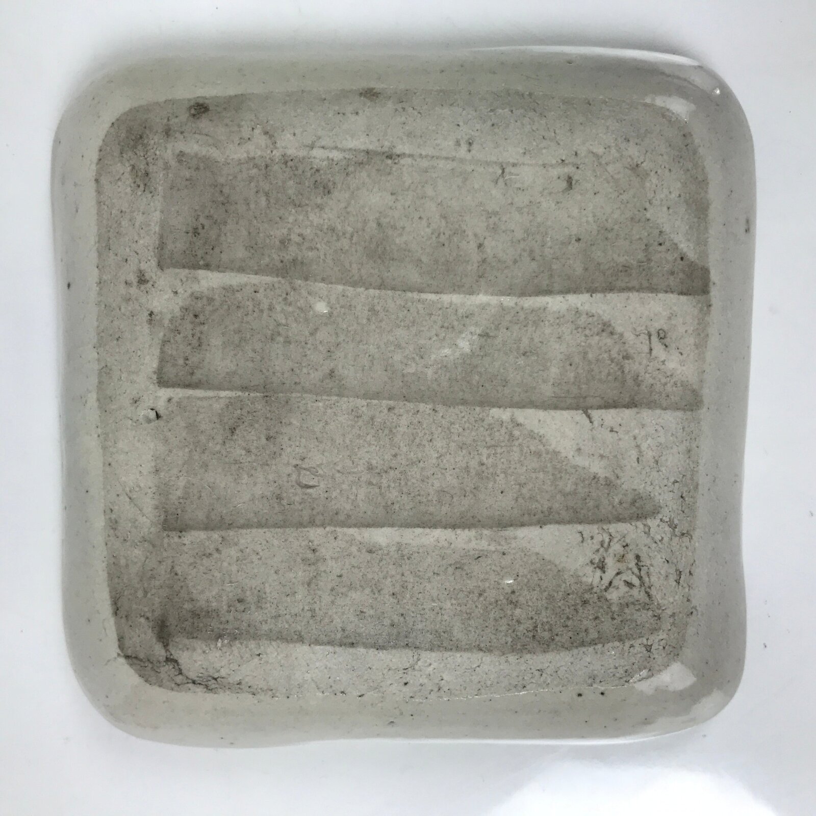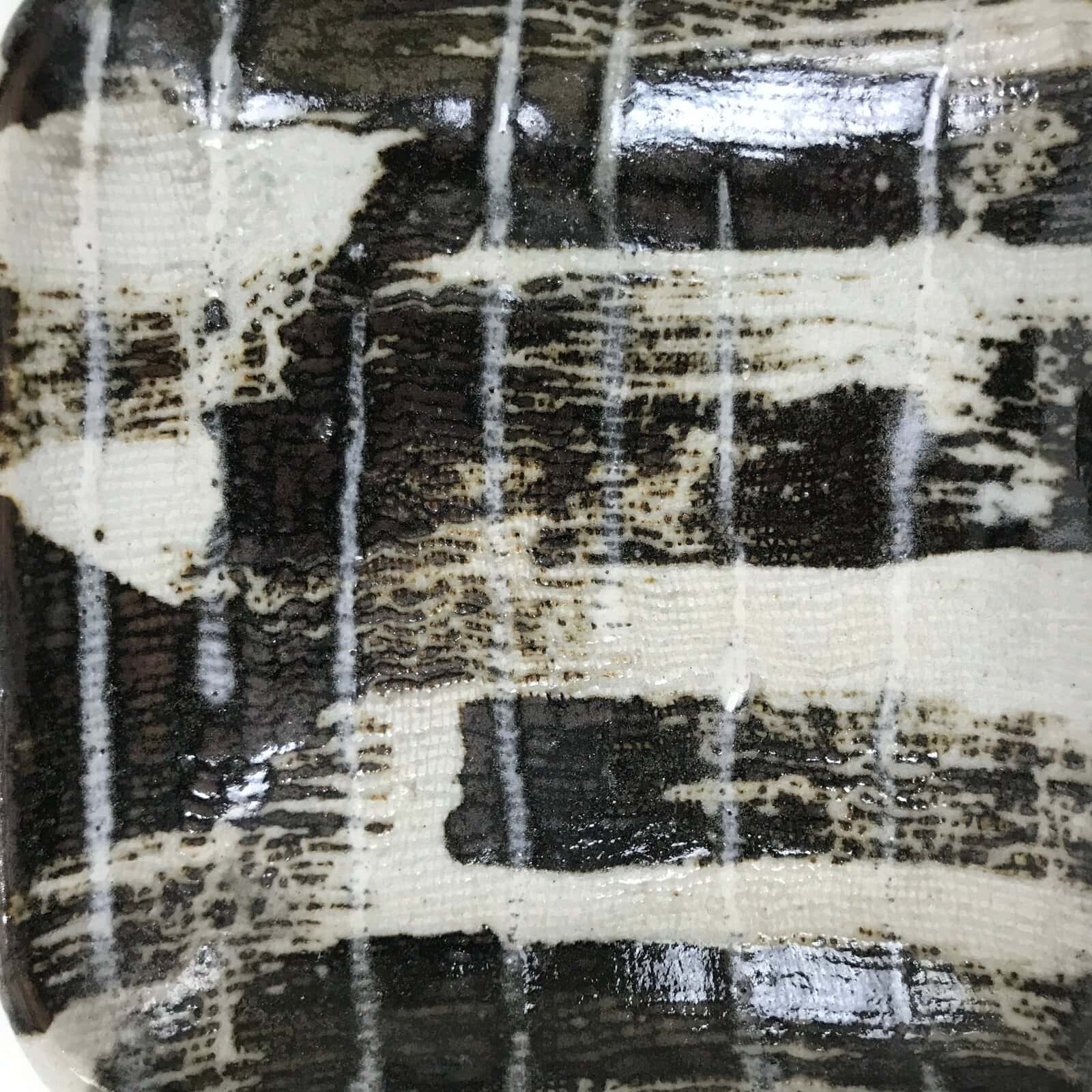 This is a vintage Japanese ceramic pottery plate. This square small-sized plate, also called sara or kozara, has a gray base color with black brush strokes and a white line overlay. The glaze has a rough texture throughout. This item is perfect for small side dishes, condiments, dipping sauces, or simply to hold small jewelry or keys.