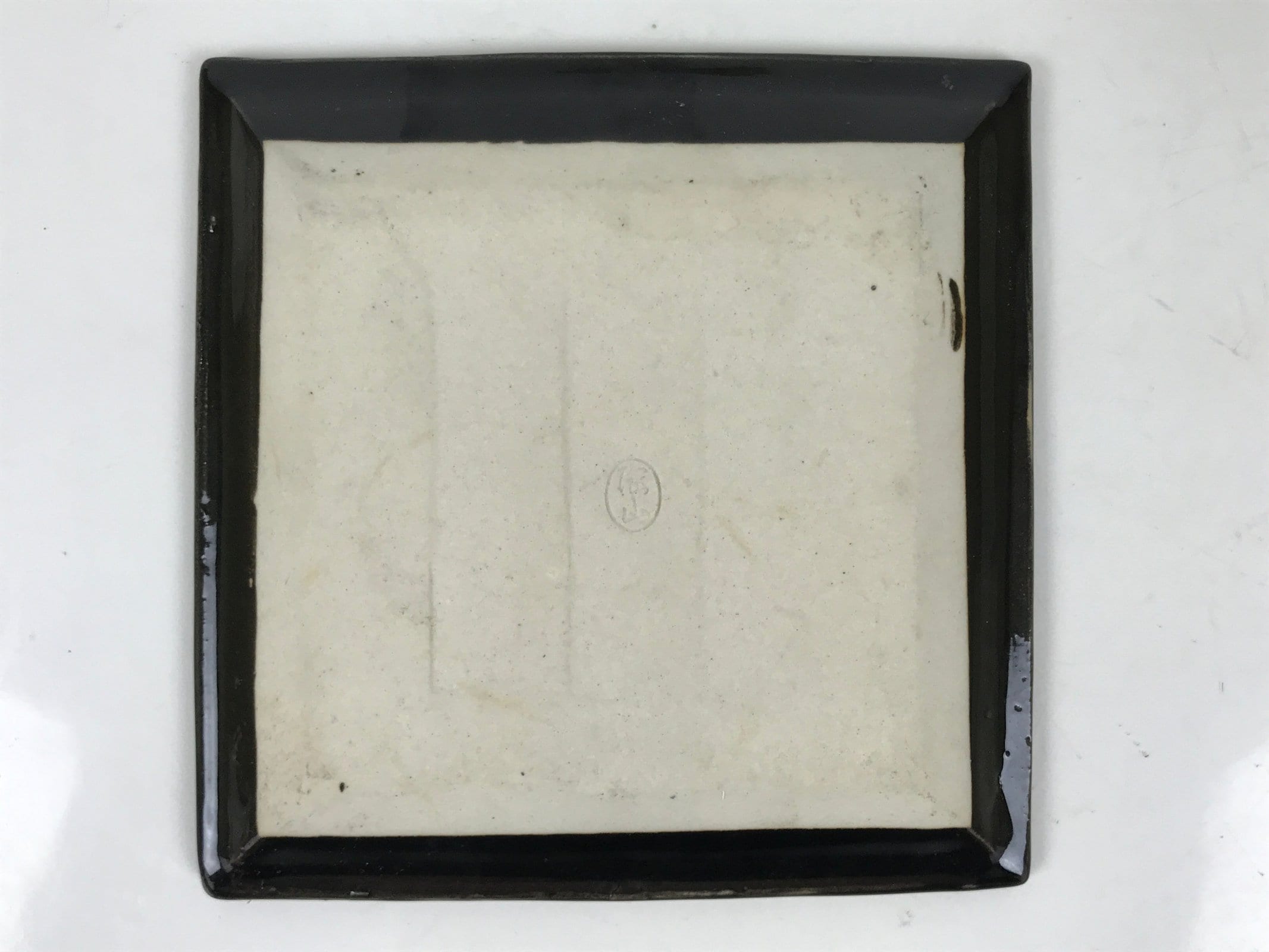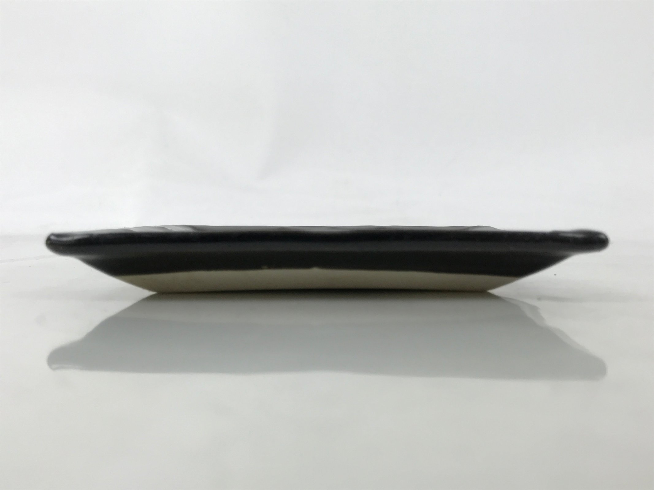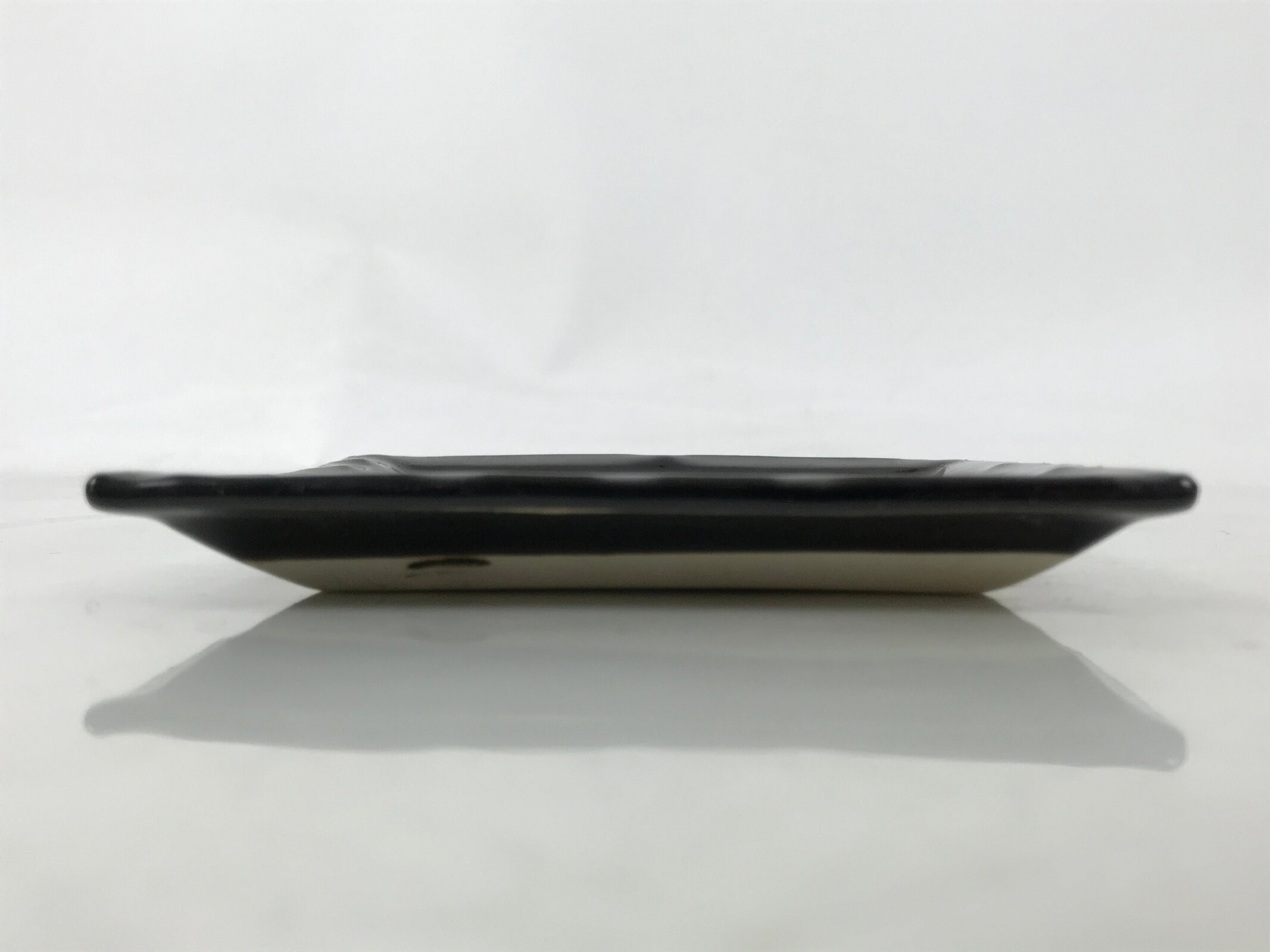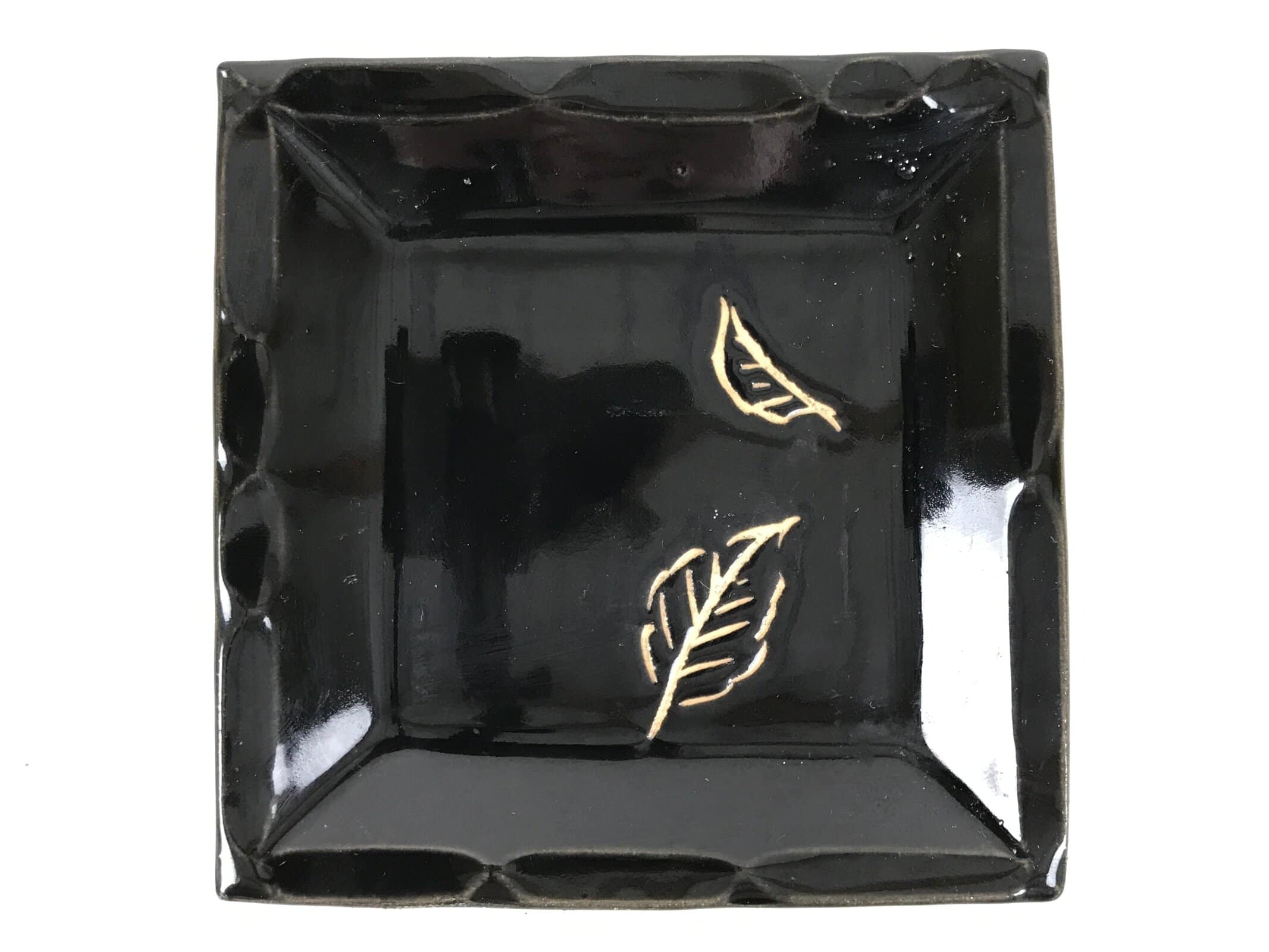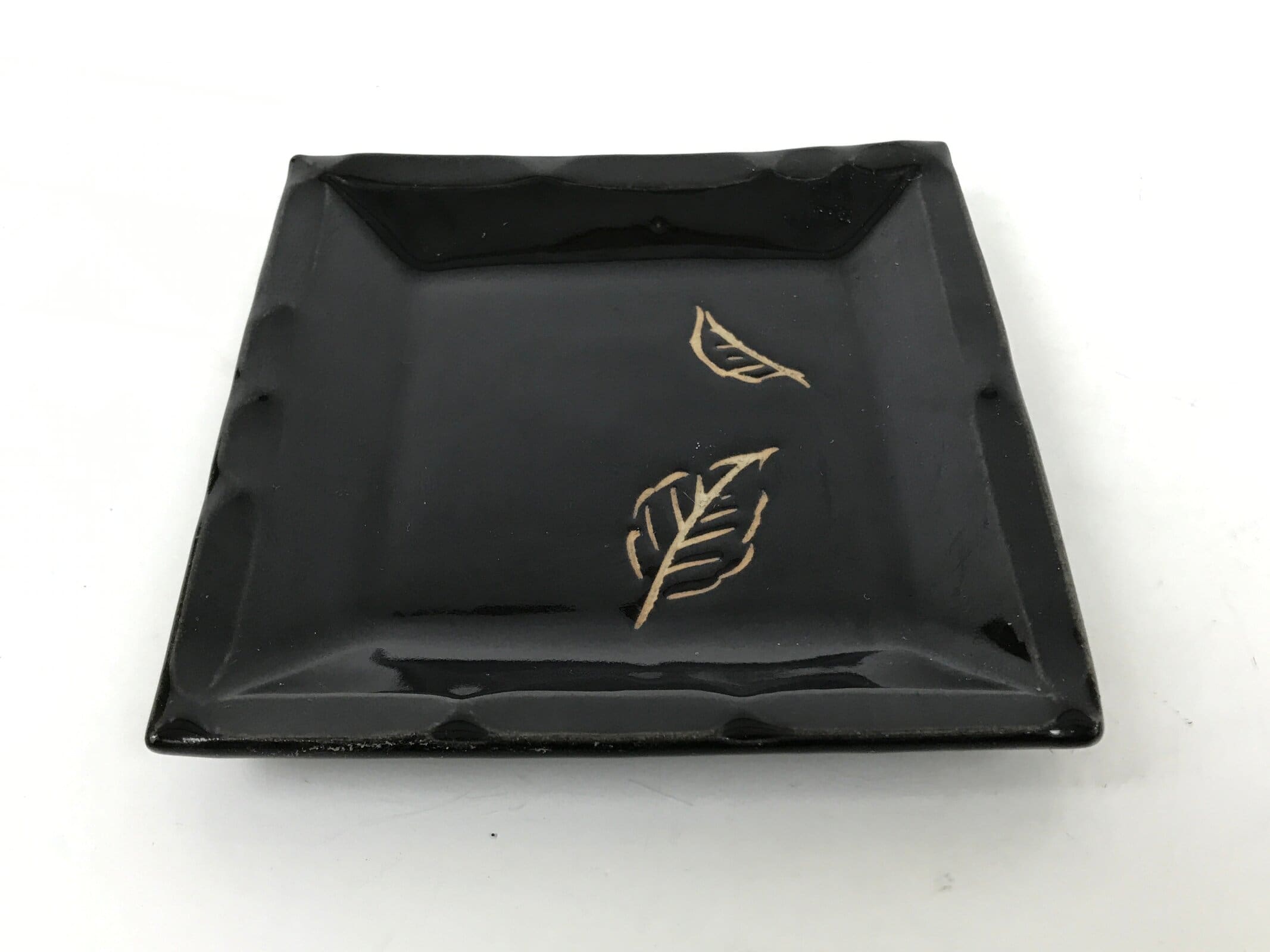 This is a vintage Japanese ceramic pottery plate. This small-sized square plate, also called sara or kozara, is mostly black with an unglazed leaf design and a decorative grooved edge. This item is perfect for small side dishes, condiments, dipping sauces, or simply to hold small jewelry or keys.