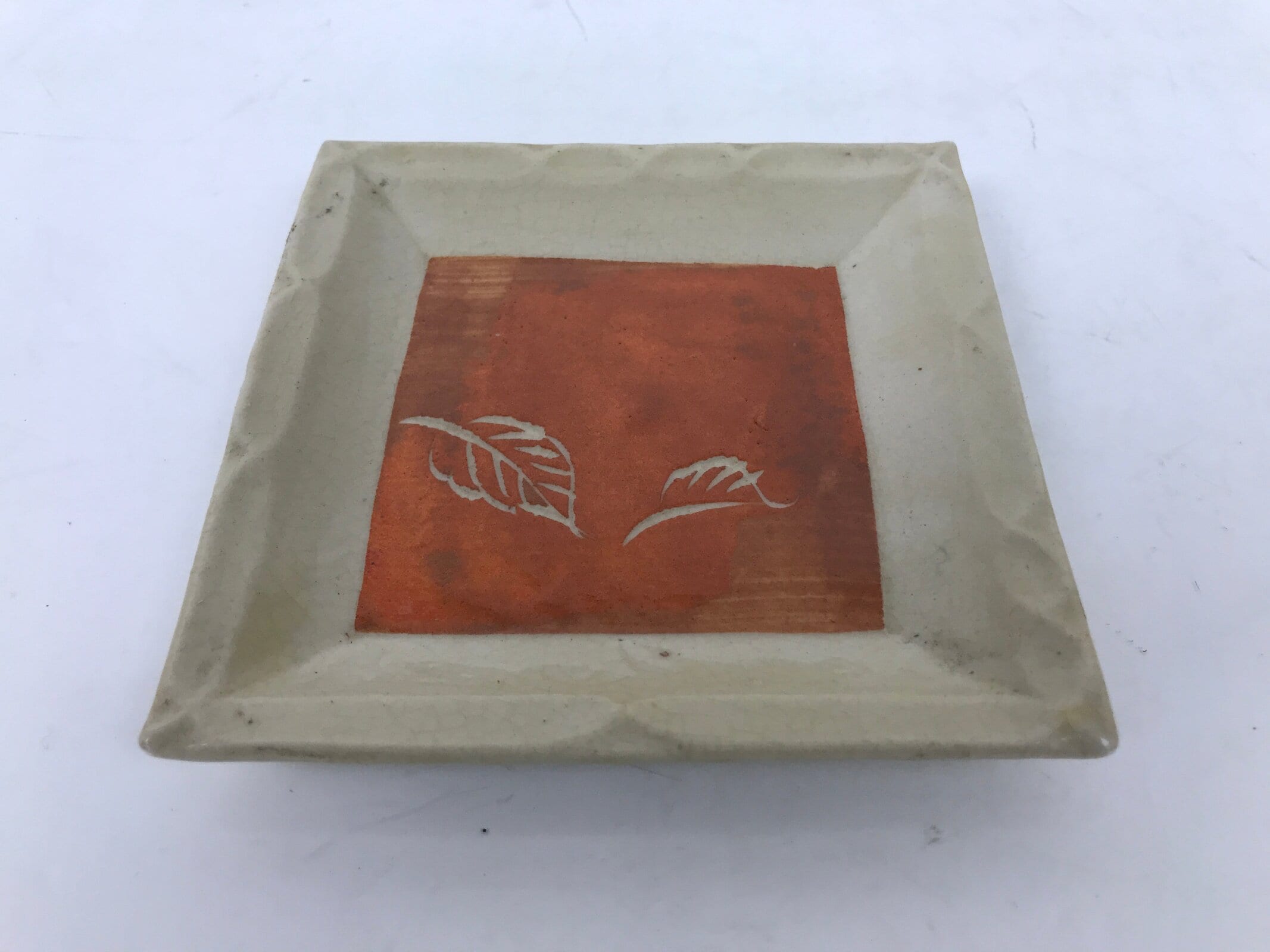 This is a vintage Japanese ceramic pottery plate. This small-sized square plate, also called sara or kozara, has a beige border with a bright orange center as well as an unglazed leaf design and a decorative grooved edge. This item is perfect for small side dishes, condiments, dipping sauces, or simply to hold small jewelry or keys.