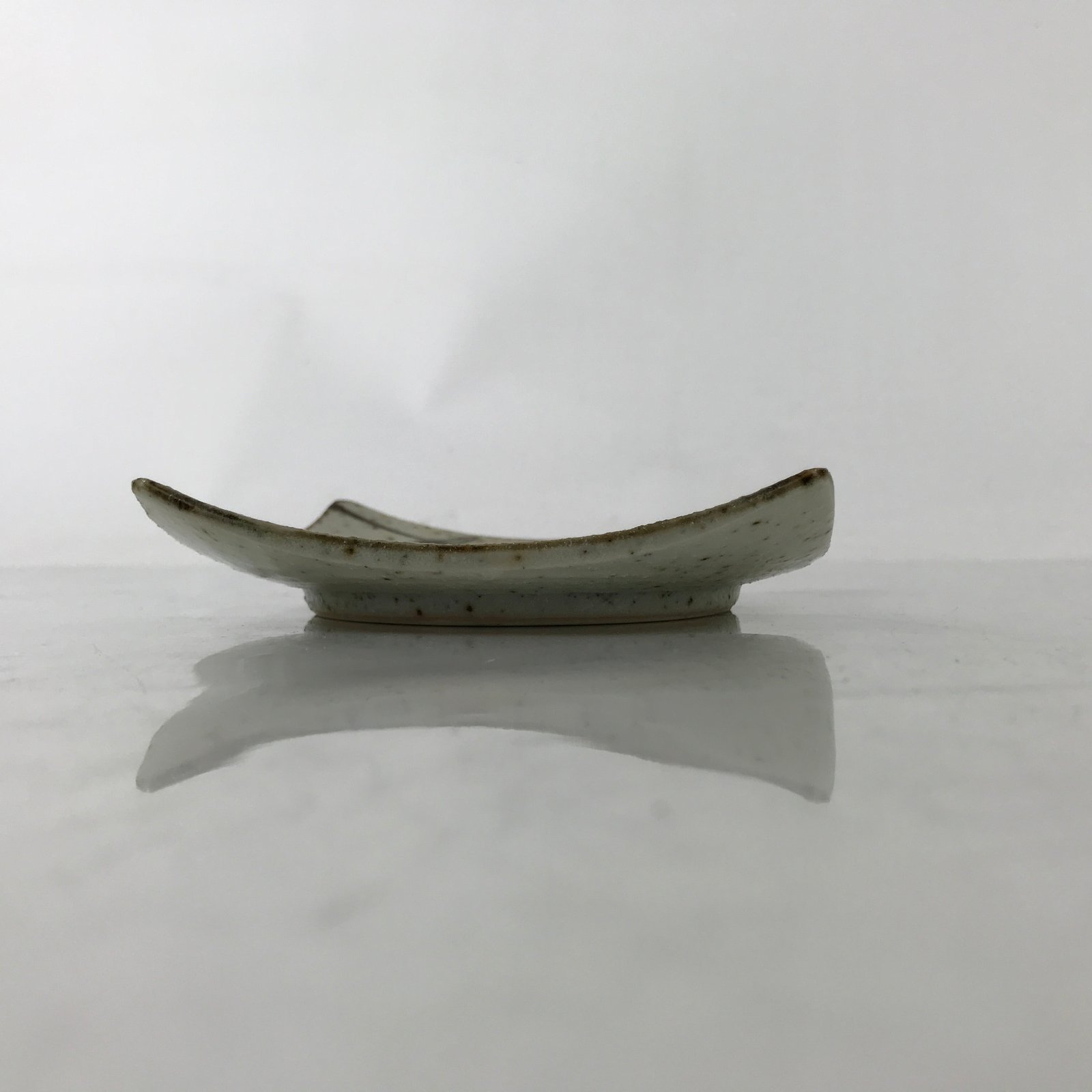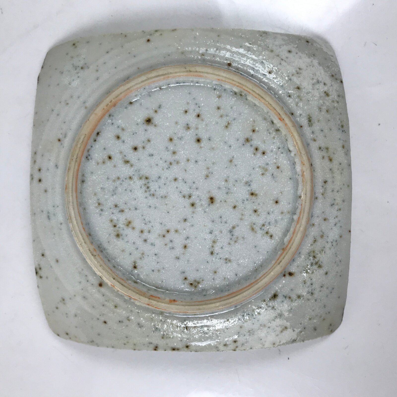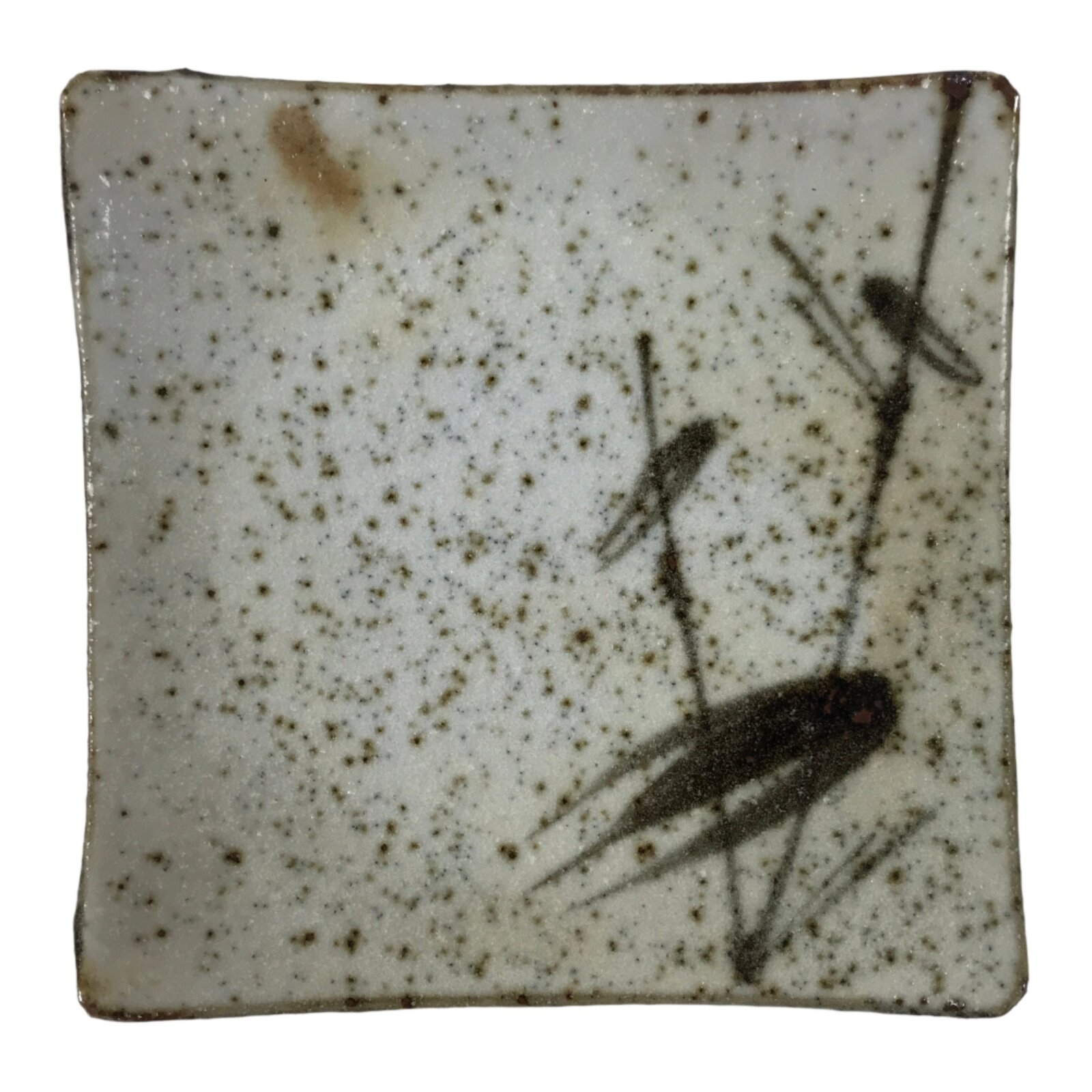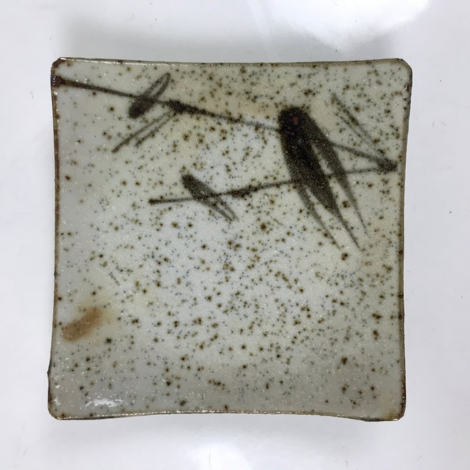 This vintage Japanese small square plate has a textured white glaze with brown spots. The overall design features a branch of bamboo with leaves. The edges are upturned for extra visual detail. This type of plate is called meimeizara and is the perfect size to serve wagashi, traditional Japanese sweets. It also serves as a plate for side dishes in a Japanese meal set.