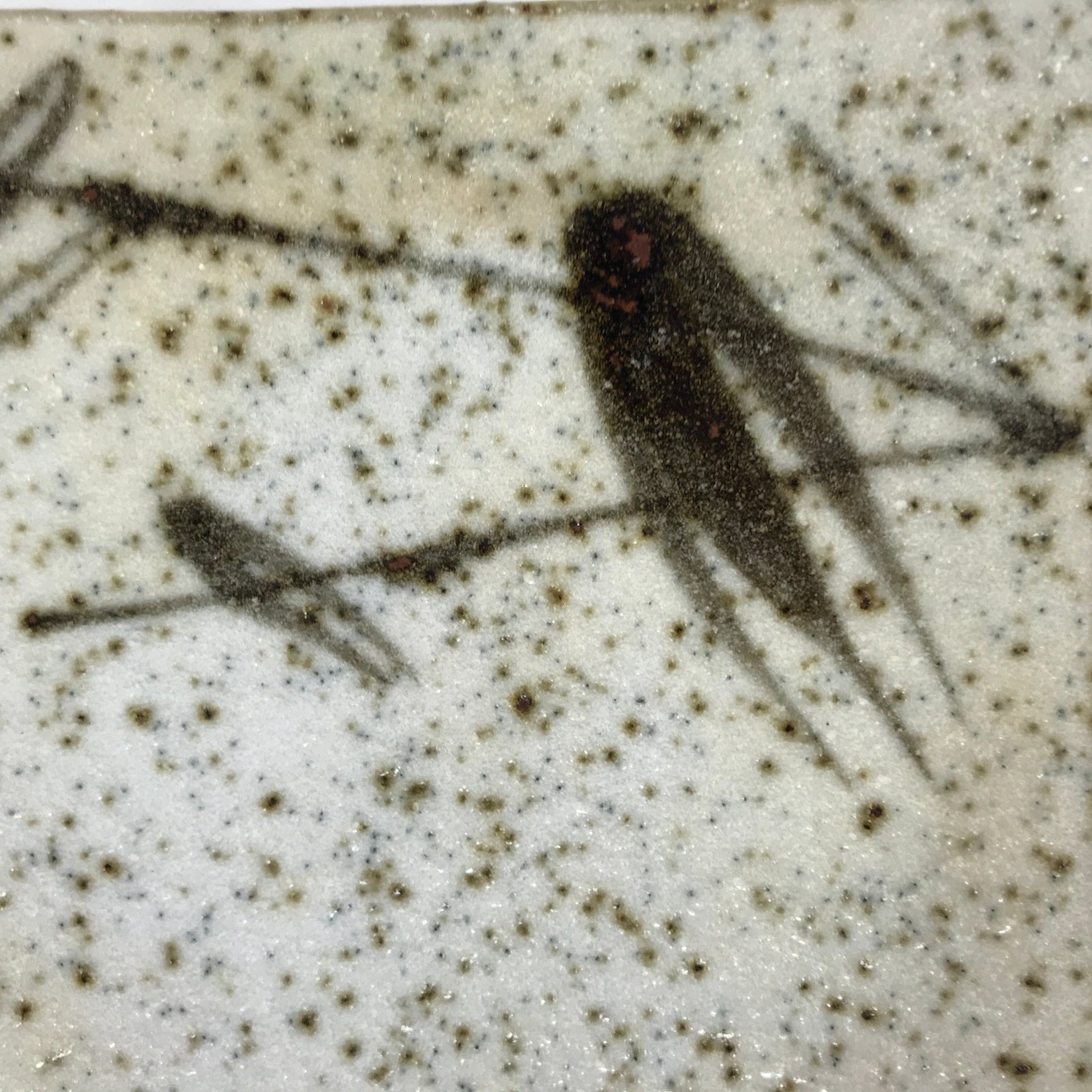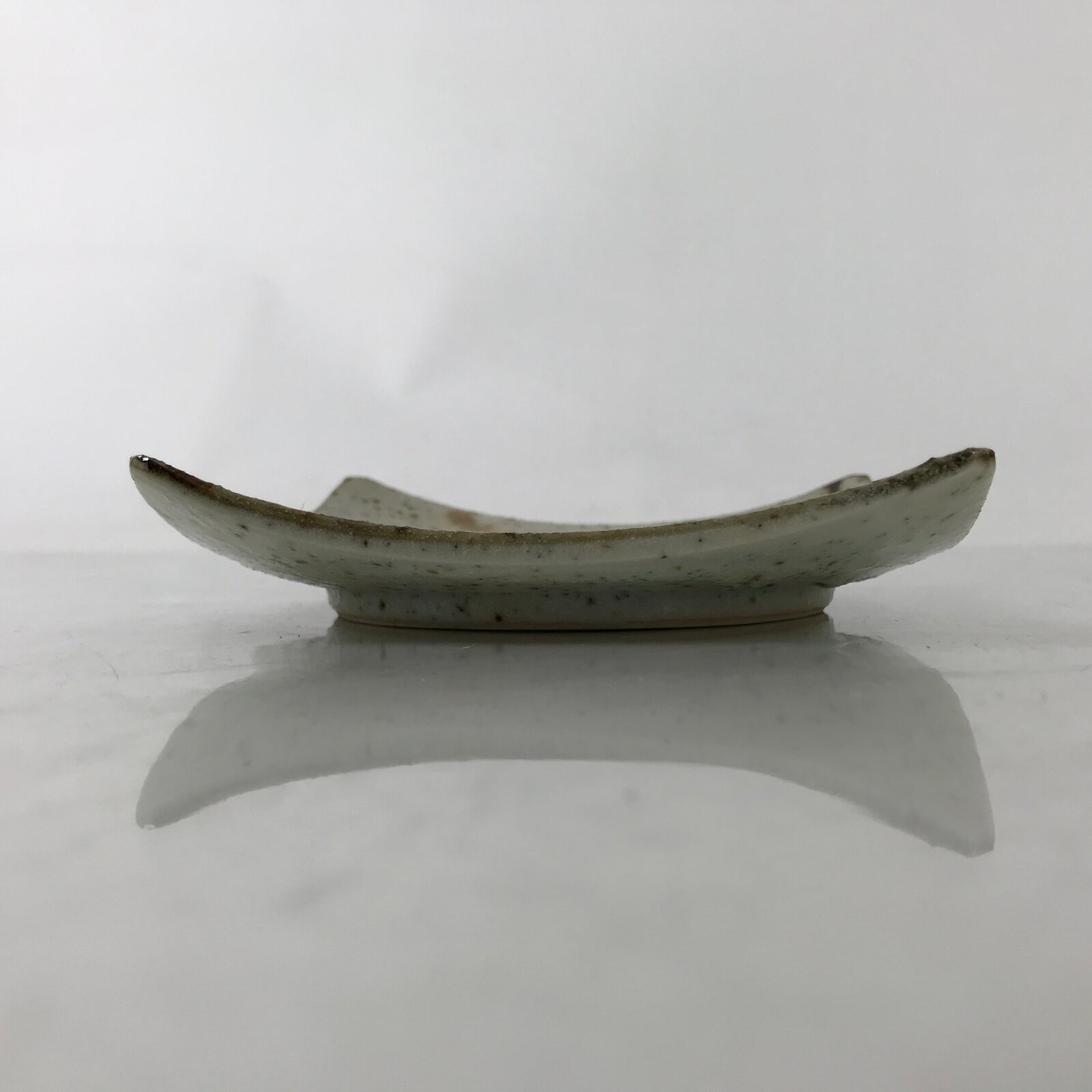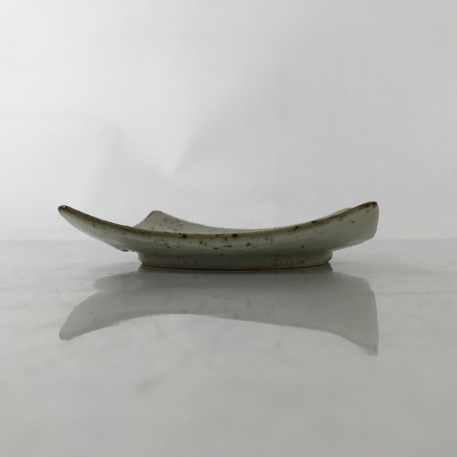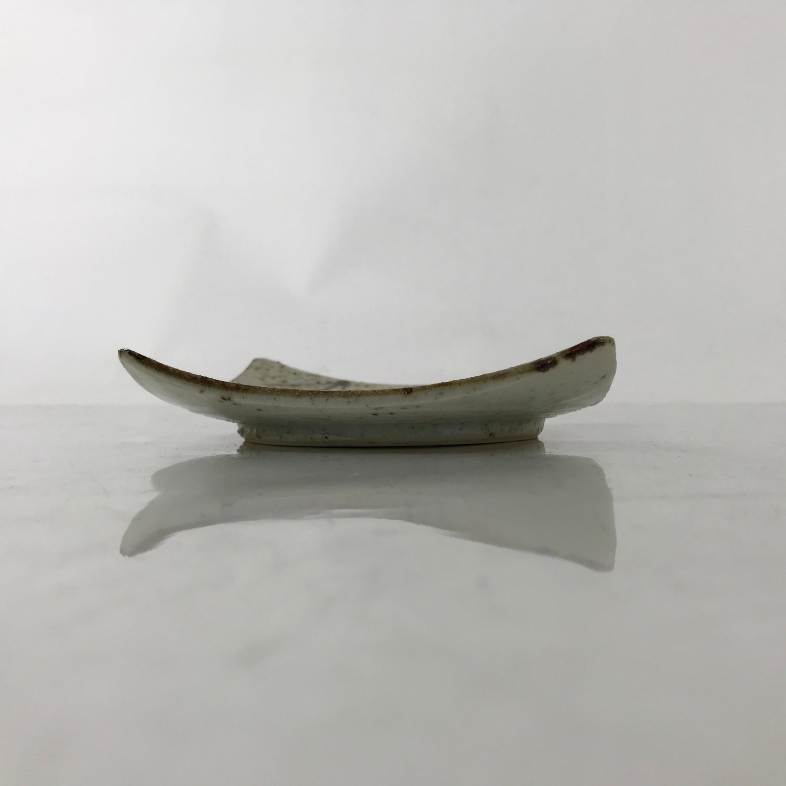 This vintage Japanese small square plate has a textured white glaze with brown spots. The overall design features a branch of bamboo with leaves. The edges are upturned for extra visual detail. This type of plate is called meimeizara and is the perfect size to serve wagashi, traditional Japanese sweets. It also serves as a plate for side dishes in a Japanese meal set.