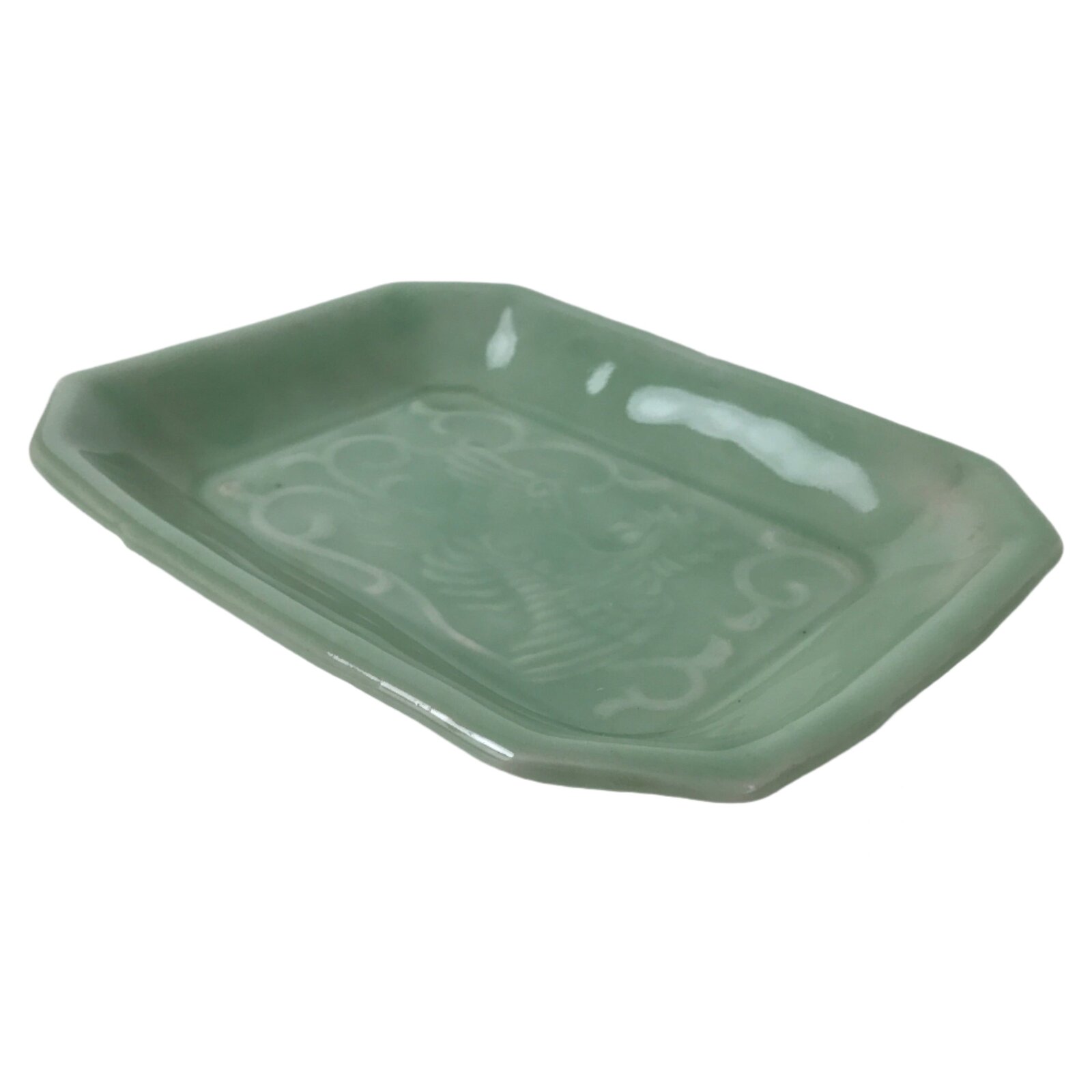 This is an antique Japanese ceramic pottery plate. This rectangular small-sized plate, also called sara or kozara, was made by hand and has a beautiful celadon green glaze with a subtle image of Ho-oh, a legendary bird motif often used in Buddhist art and architecture. The glaze has a smooth texture throughout. This item is perfect for small side dishes, condiments, dipping sauces, or holding small jewelry or keys.