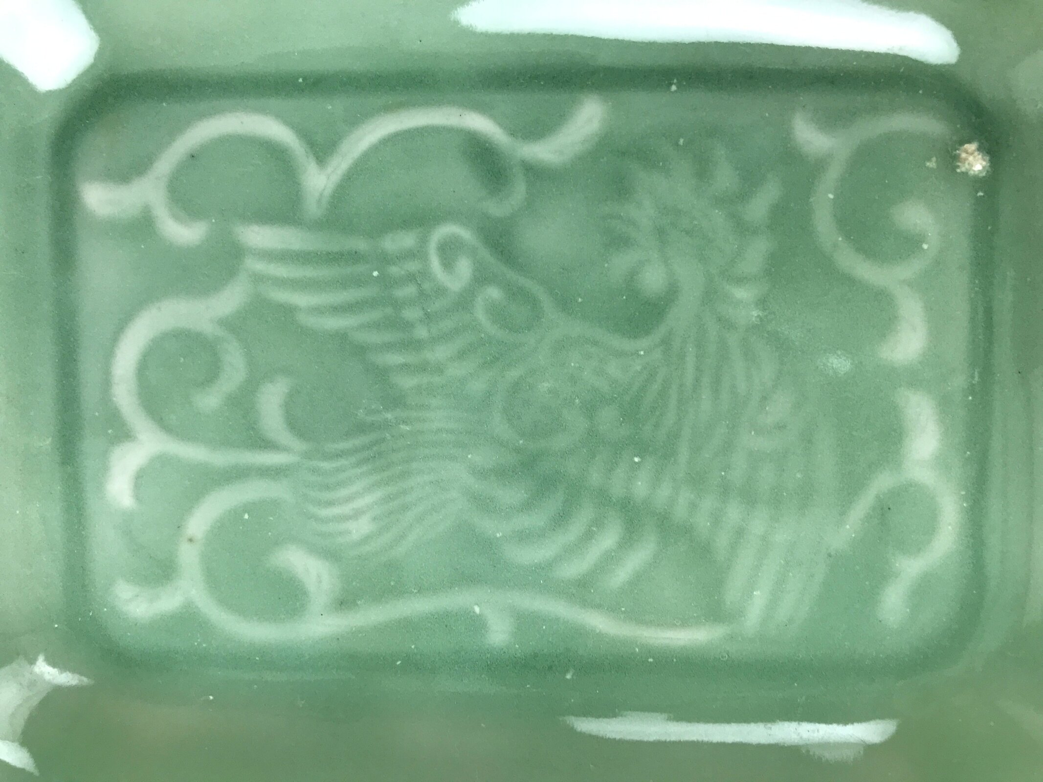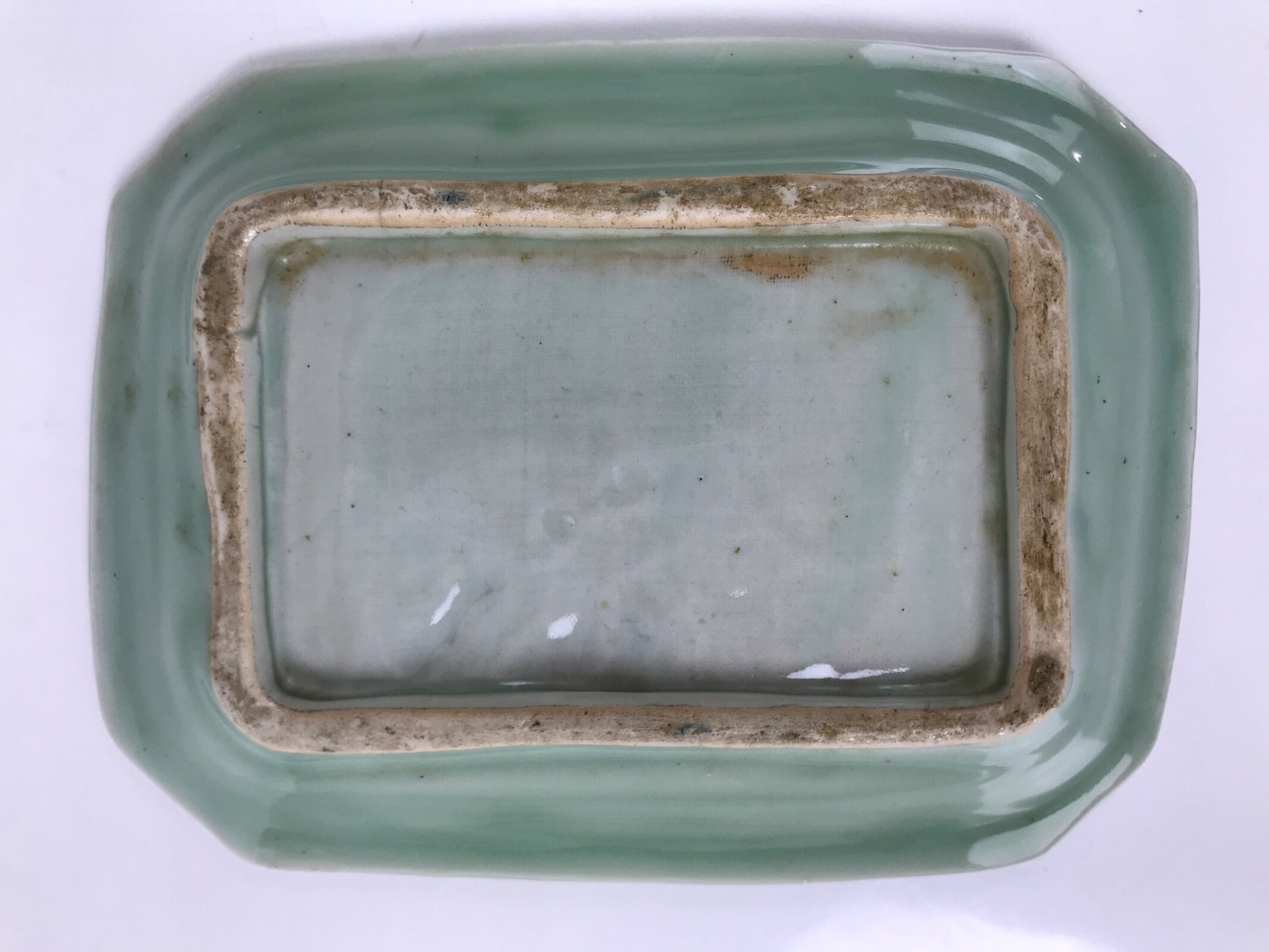 This is an antique Japanese ceramic pottery plate. This rectangular small-sized plate, also called sara or kozara, was made by hand and has a beautiful celadon green glaze with a subtle image of Ho-oh, a legendary bird motif often used in Buddhist art and architecture. The glaze has a smooth texture throughout. This item is perfect for small side dishes, condiments, dipping sauces, or holding small jewelry or keys.