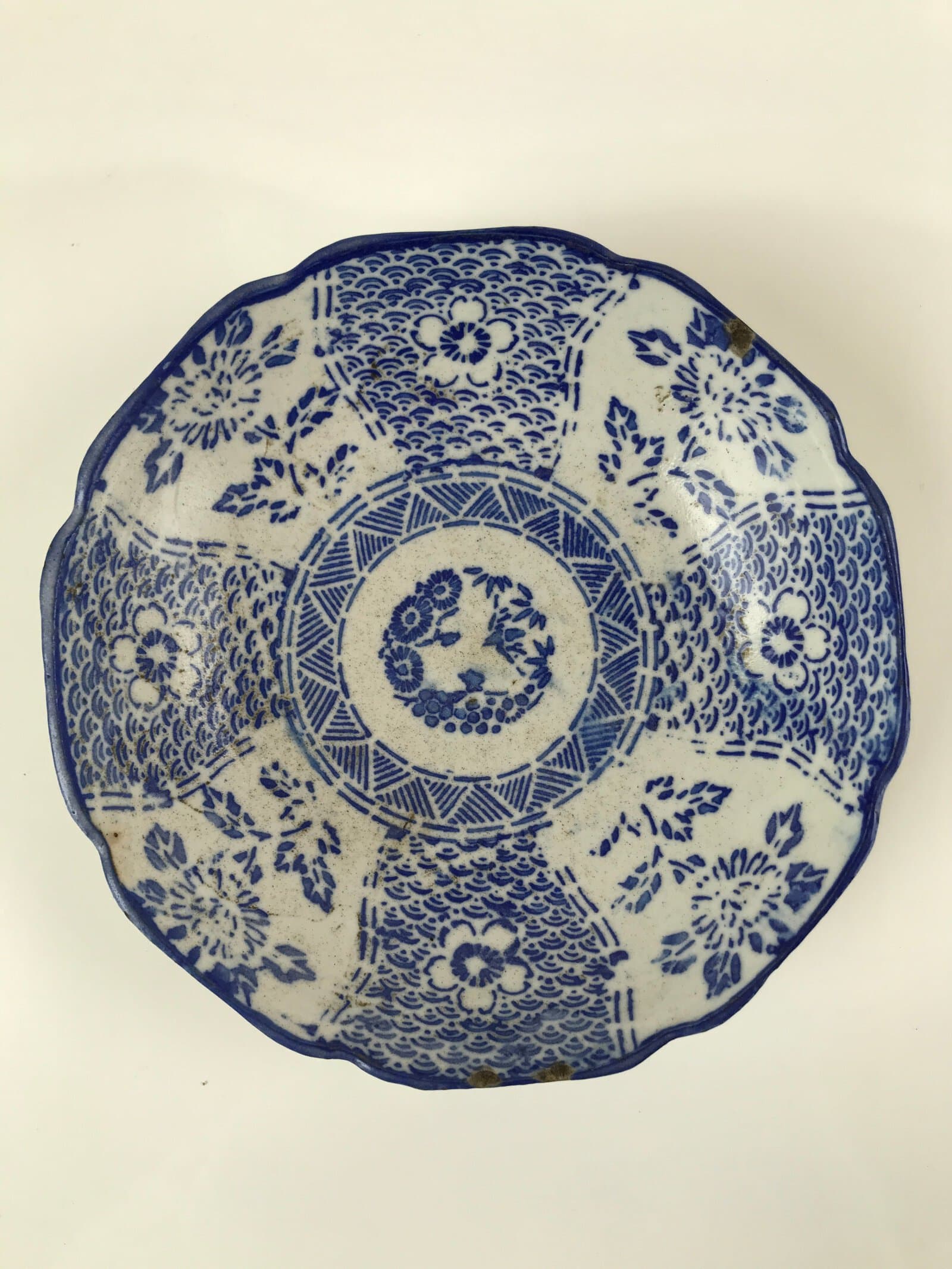 This item is an antique Japanese ceramic bowl. Handcrafted, it has grooves along the edges resembling flower petals. This bowl is blue and white sometsuke and features a design of cherry blossoms, chrysanthemums, bamboo leaves, and a host of many other flowers. It also has a traditional seigaiha wave pattern behind the cherry blossoms and uroko scale pattern in a ring on the inside bottom.