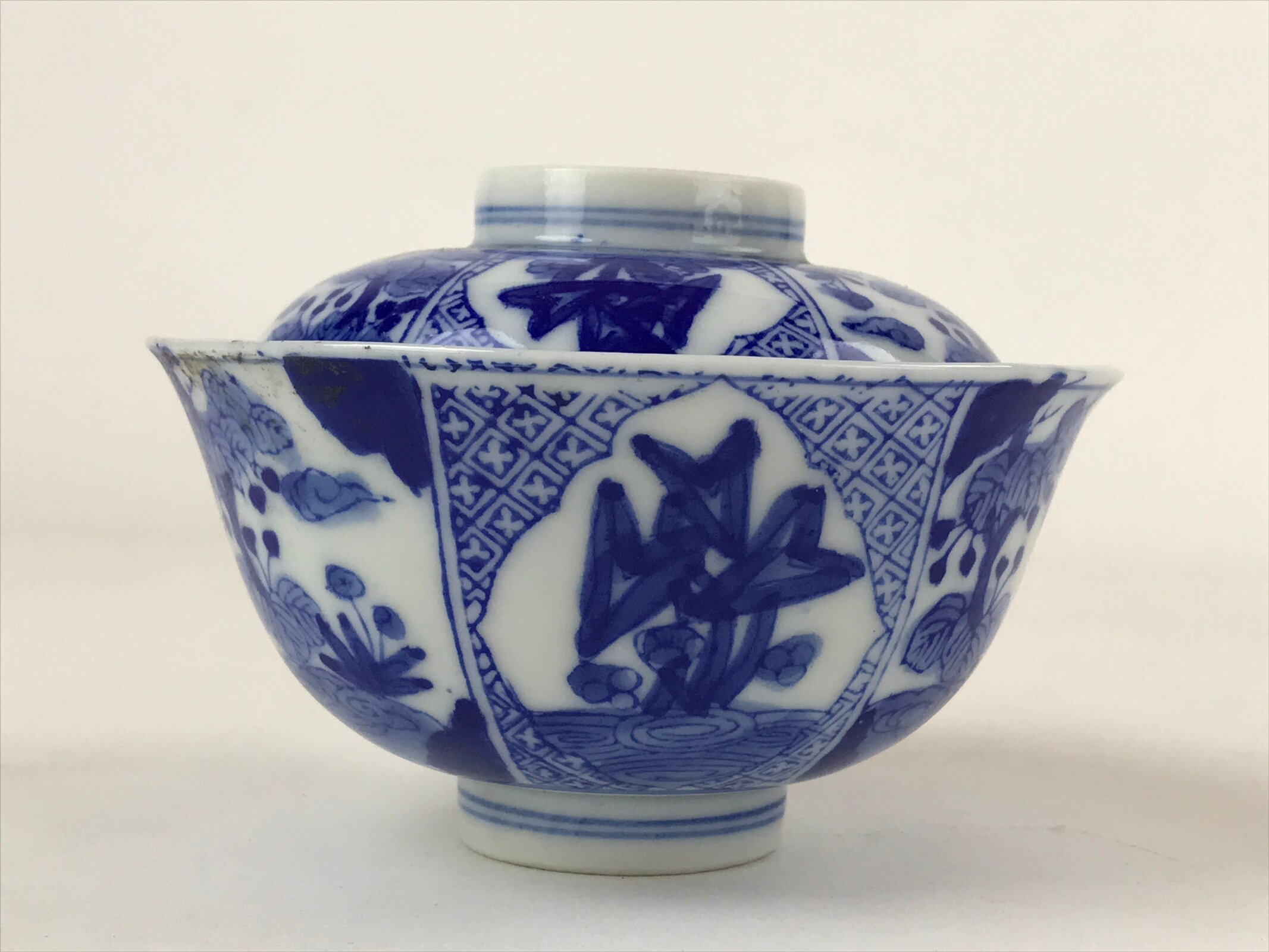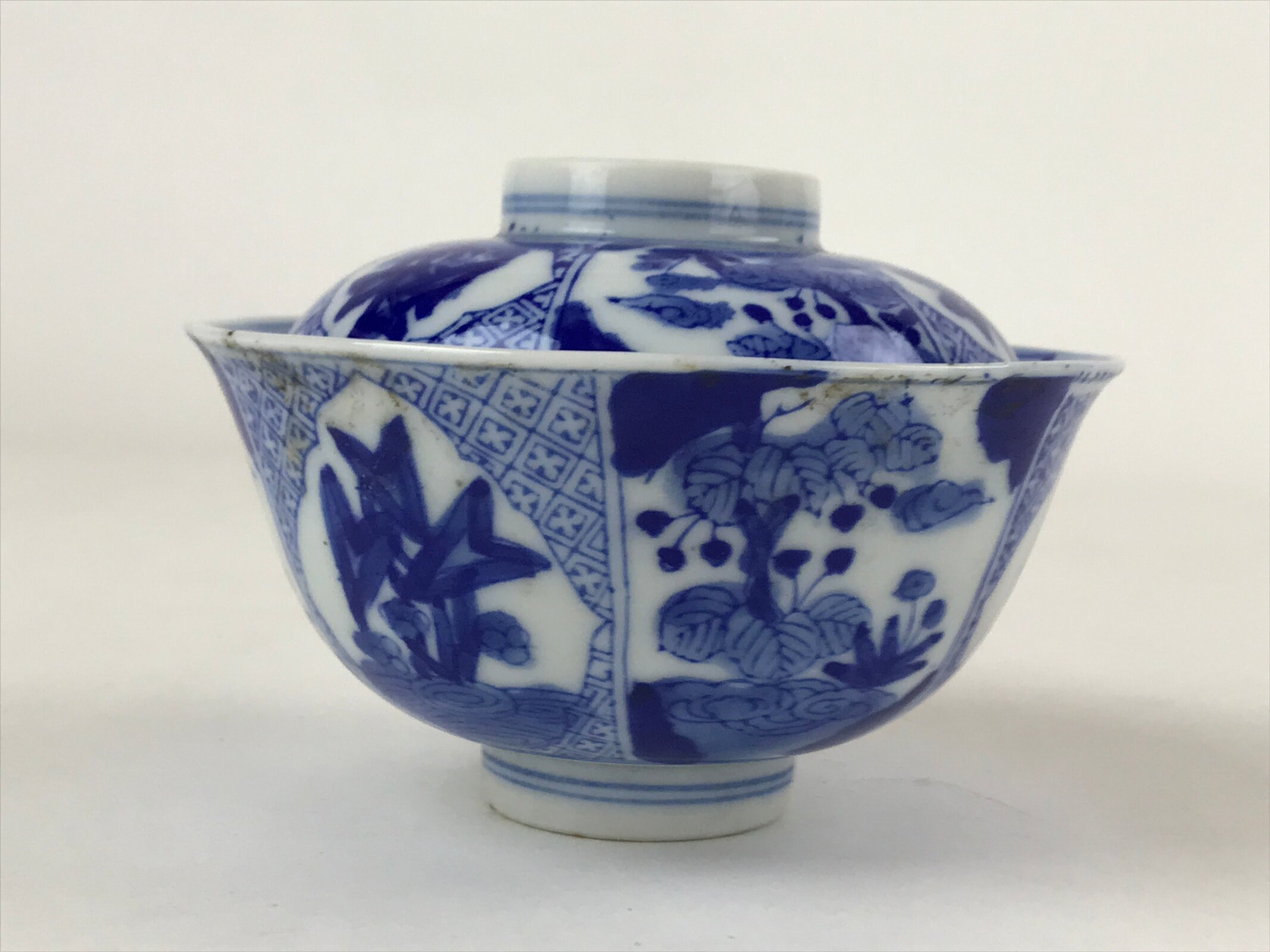 Japanese Ceramic Sometsuke Lidded Bowl Owan Vtg Pottery White Blue Floral PY582