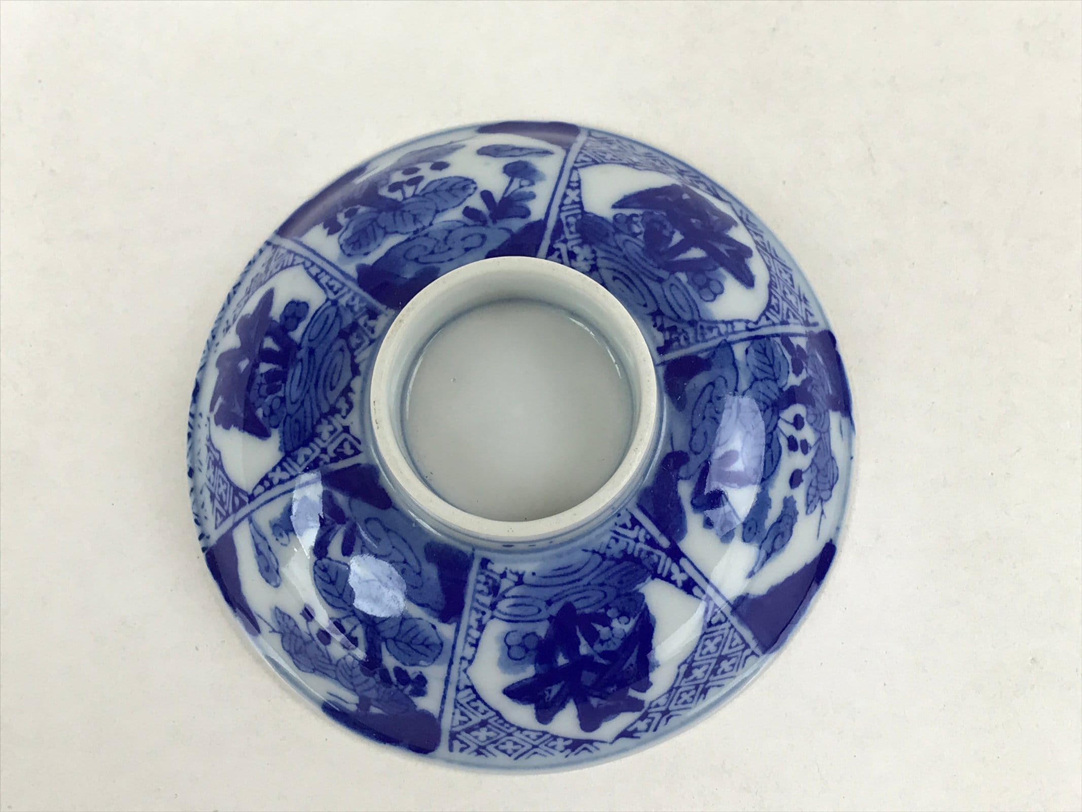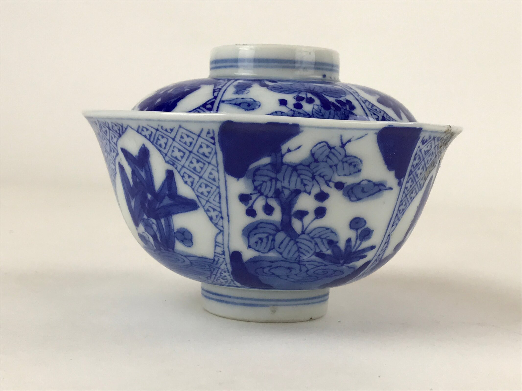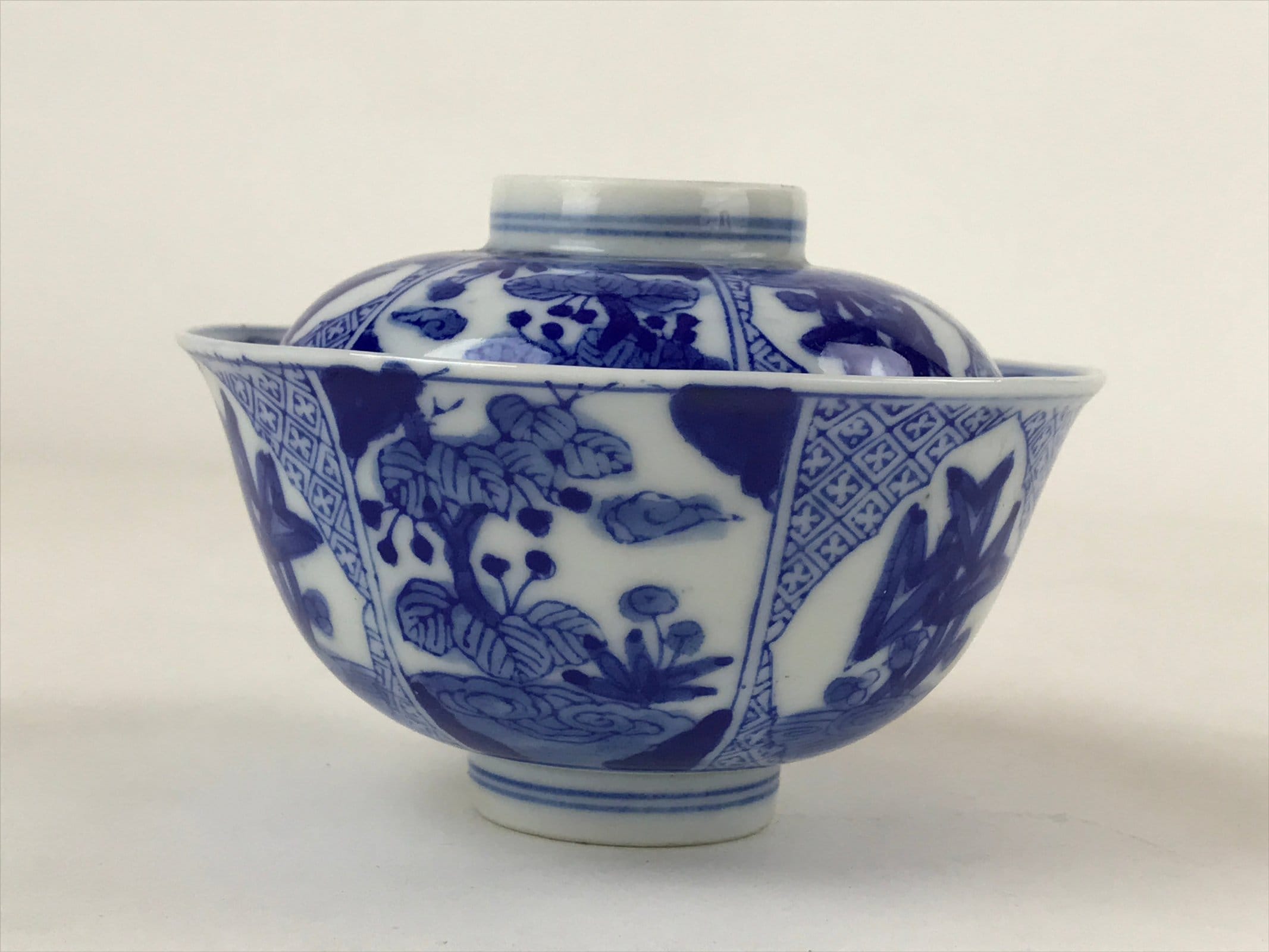 This is a Japanese vintage ceramic bowl with a lid. It has a medium to large size. The bowl and its lid are decorated with sometsuke-style dark blue floral patterns with leaves on the outside and a blue patterned border on the inside of both lid and bowl. This bowl has some weight, it is the ideal size to serve soup, rice, or other small food.